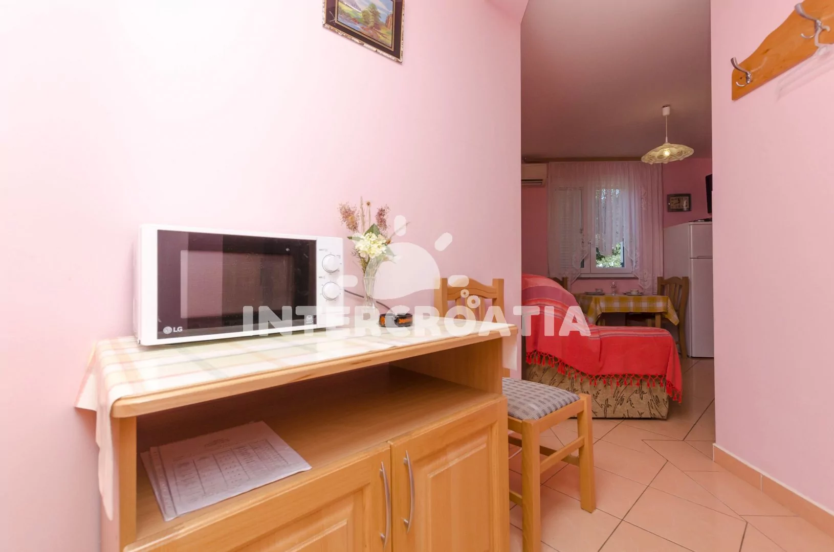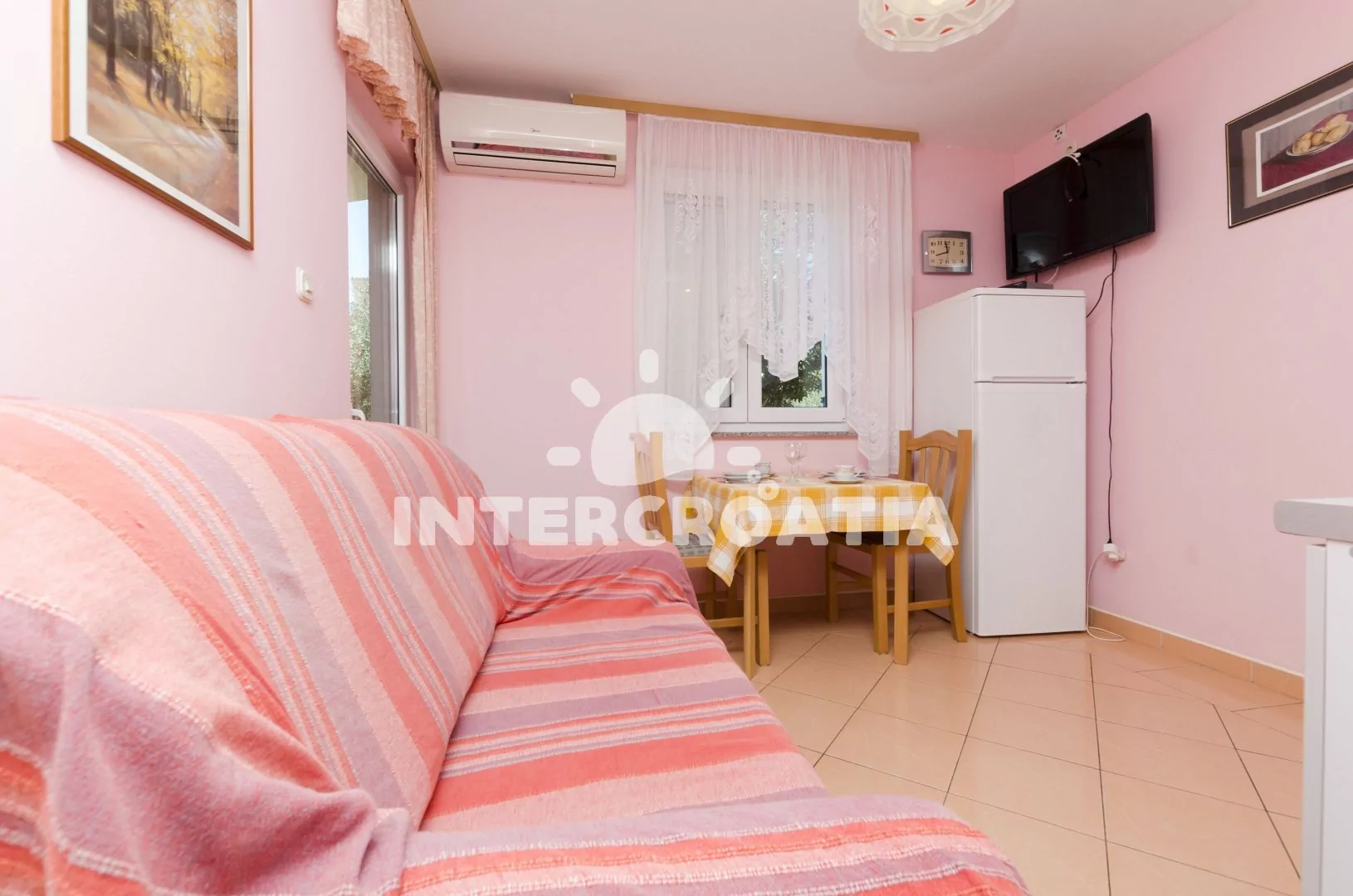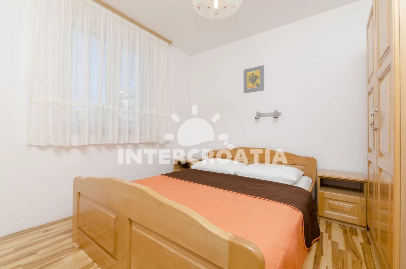 Apartmán (55 m2) s balkonem a venkovním posezením se nachází v 1. patře domu a je vhodný pro 4 až 6 osob. Obývací pokoj je spojený s kuchyní. Kuchyňská linka je vybavena dvouplotýnkovým vařičem, nádobím a lednicí s mrazákem. Obývací pokoj s jídelním stolem, pohovkou (rozložitelná na extra lůžko pro 2 osoby), televizí se satelitním programem, klimatizací a vstupem na balkon. První ložnice s dvoulůžkem. Druhá ložnice s dvěma jednolůžky. Koupelna se sprchovým koutem, umyvadlem a wc. Hostům je k dispozici parkování u objektu zdarma.