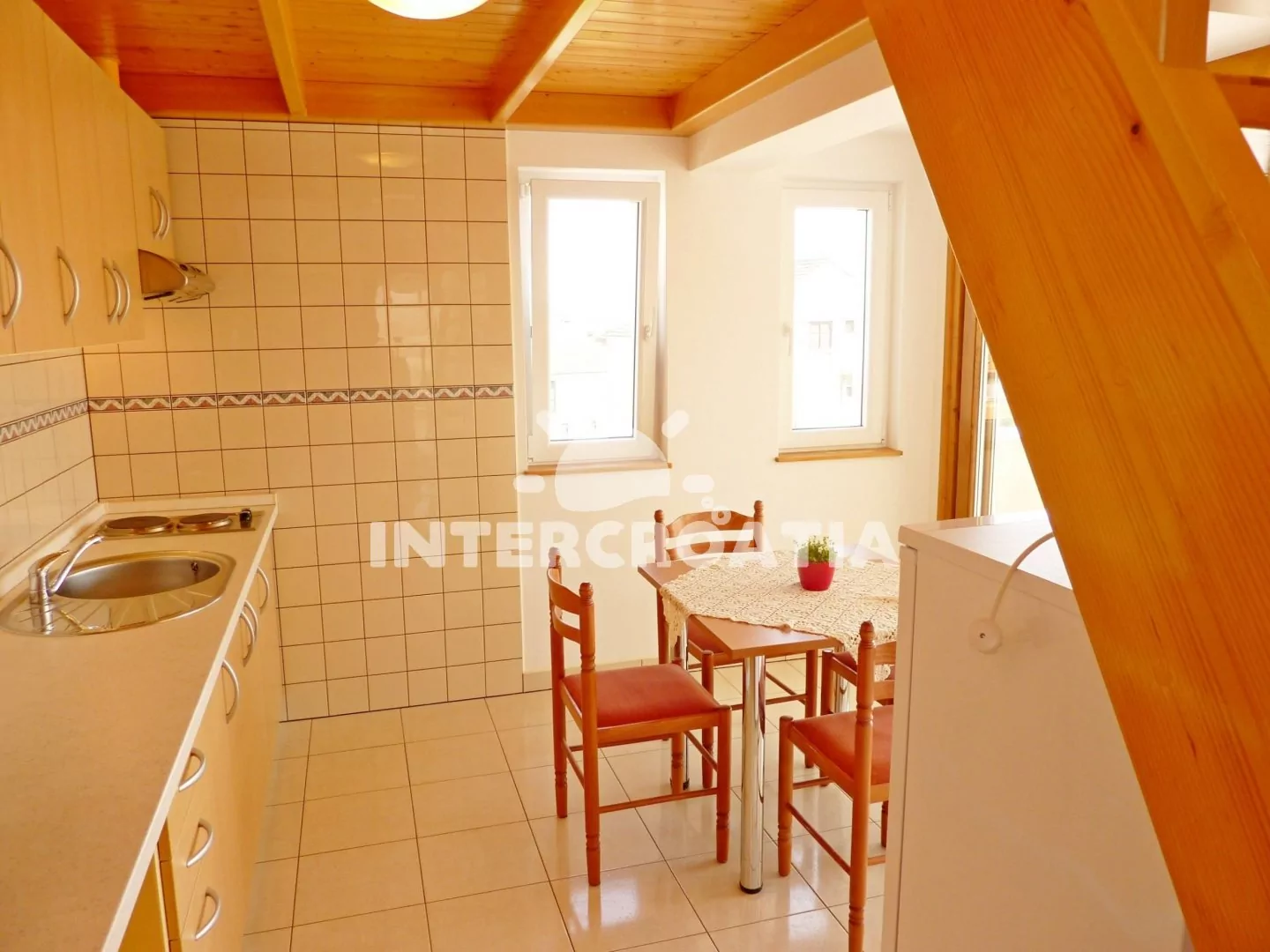 Podkrovní apartmán (50 m2) s terasou a venkovním posezením je vhodný pro 4 osoby. Obývací místnost je spojena s kuchyní. Kuchyňská linka je vybavena dvouplotýnkovým vařičem, digestoří, rychlovarnou konvicí, kávovarem, toustovačem, nádobím a lednicí s mrazákem. Obývací místnost s jídelním stolem pro 4 osoby, televizí se satelitním programem, klimatizací a vstupem na terasu. První i druhá ložnice je vybavena vždy s jedním dvoulůžkem. Koupelna se sprchovým koutem, umyvadlem, pračkou a wc. Hostům je k dispozici parkování u objektu zdarma.