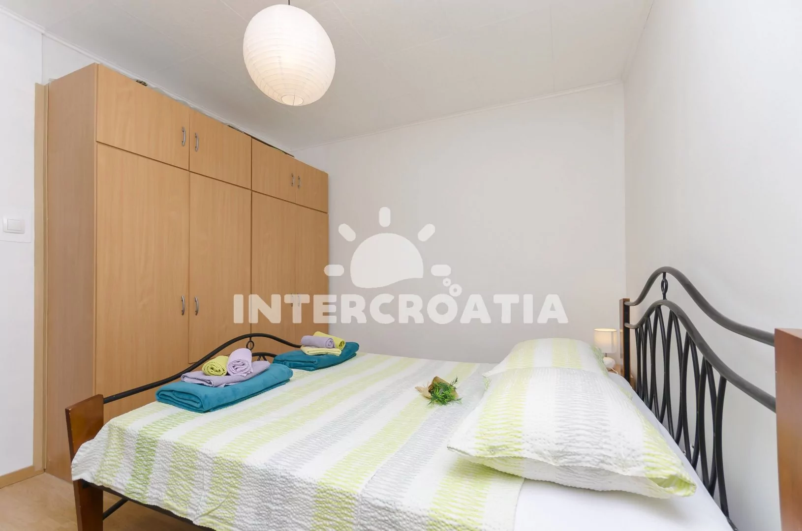 Apartmán (60 m2) s terasou a venkovním posezením se nachází v 1. patře domu. Apartmán je vhodný pro 2 až 4 osoby. Obývací pokoj je spojený s kuchyní. Kuchyňská linka je vybavena sporákem s troubou, rychlovarnou konvicí, nádobím a lednicí s mrazákem. Obývací pokoj s jídelním stolem pro 4 osoby, sedací soupravou s pohovkou (rozložitelná na extra lůžko pro 2 osoby), televizí, klimatizací a vstupem na terasu. Ložnice s jedním dvoulůžkem. Koupelna se sprchovým koutem, umyvadlem, fénem a wc. Hostům je k dispozici parkování u objektu zdarma.