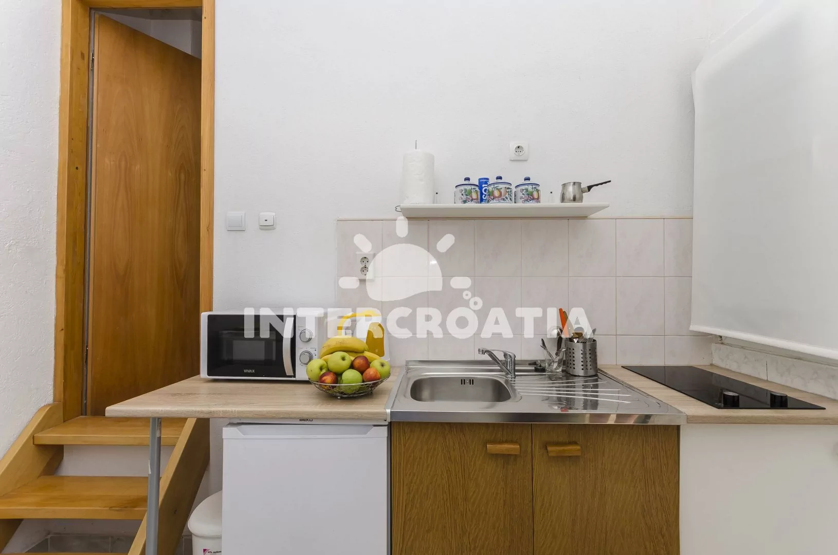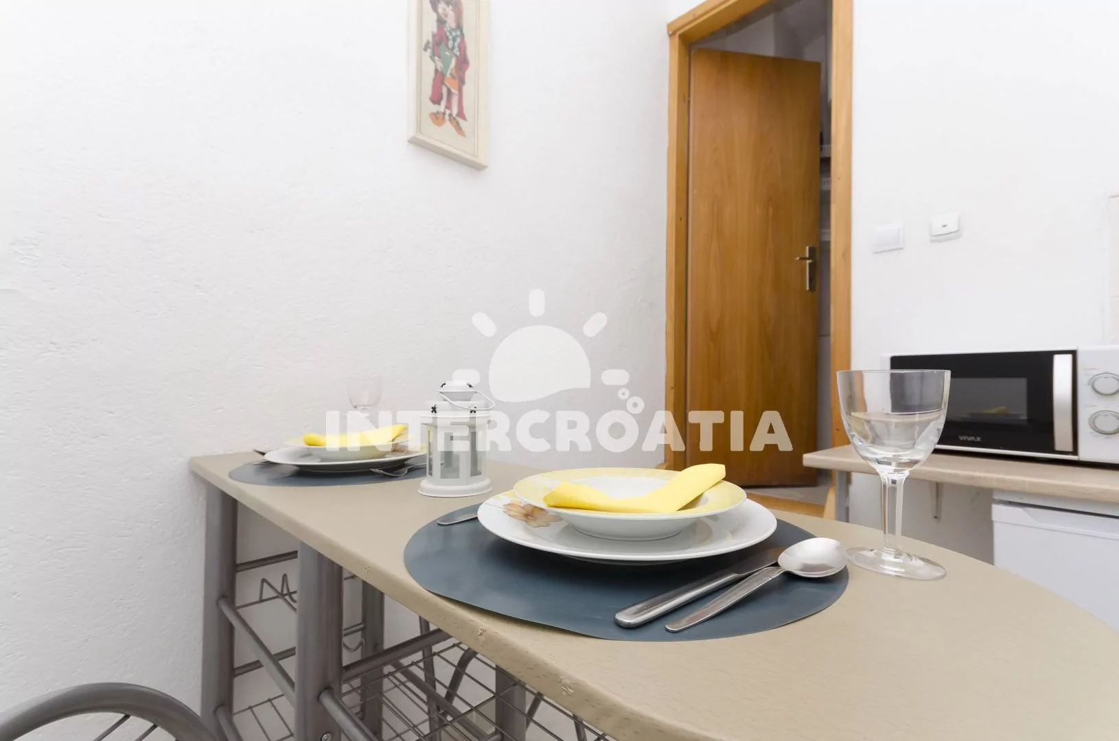 Apartmán (35 m2) s terasou a venkovním posezením se nachází v 1. patře domu. Apartmán je vhodný pro 2 osoby. Kuchyň s jídelním stolem, kuchyňskou linkou s dvouplotýnkovým vařičem, mikrovlnnou troubou, rychlovarnou konvicí, nádobím a lednicí s mrazákem. Ložnice s dvoulůžkem, televizí a klimatizací. Koupelna se sprchovým koutem, umyvadlem, fénem a wc. Hostům je k dispozici parkování u objektu zdarma.
