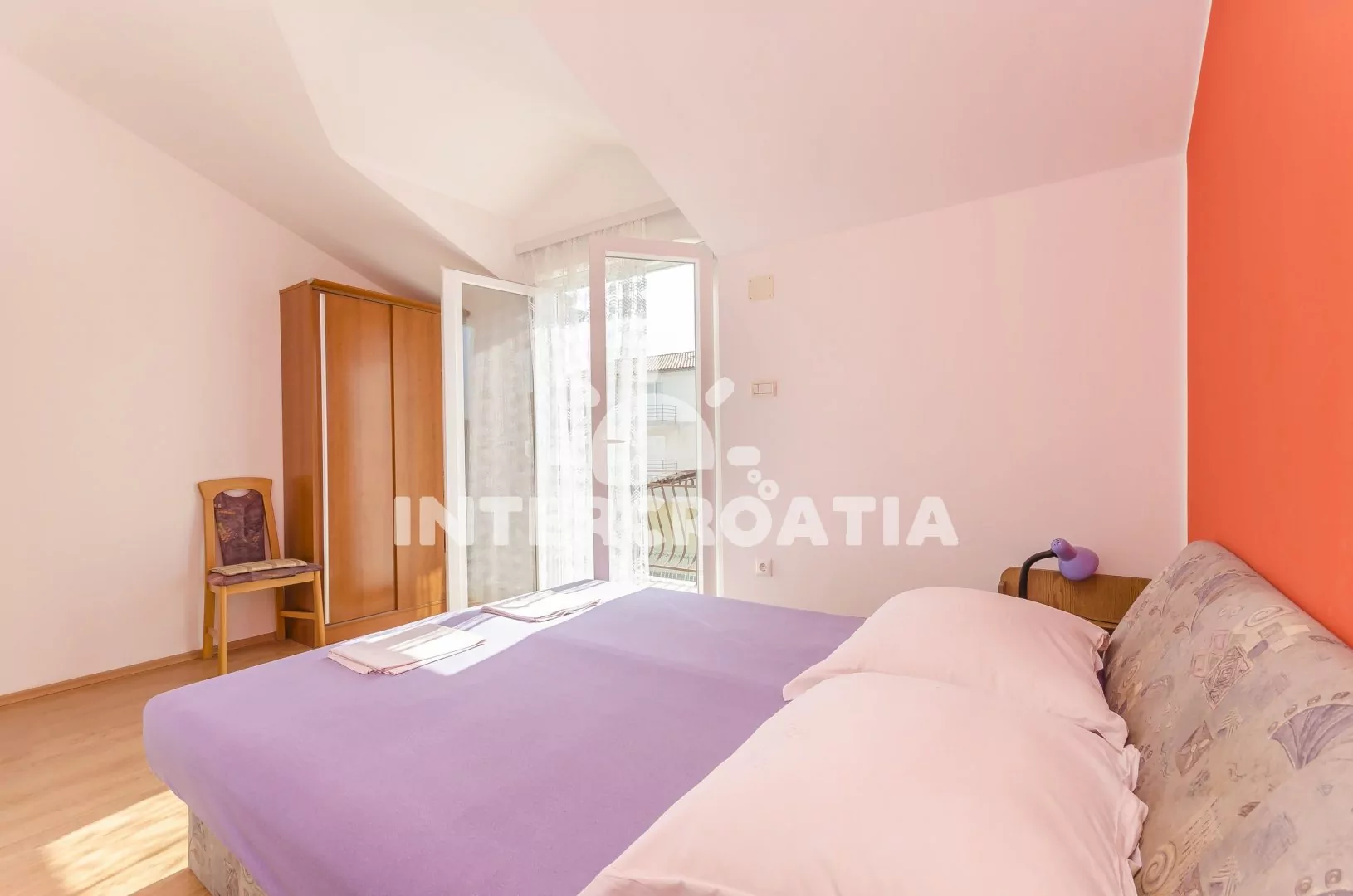 Podkrovní apartmán (65 m2) s terasou a posezením je vhodný pro 4 osoby. Obývací pokoj je spojený s kuchyní. Kuchyňská linka je vybavena varnou deskou, vestavěnou troubou, rychlovarnou konvicí, nádobím a lednicí s mrazákem. Obývací pokoj s jídelním stolem pro 4 osoby, pohovkou, televizí, klimatizací a vstupem na terasu. První i druhá ložnice je vybavena vždy s jedním dvoulůžkem a koupelnou. Obě koupelny se sprchovým koutem, umyvadlem a wc. Hostům je k dispozici parkování u objektu zdarma.