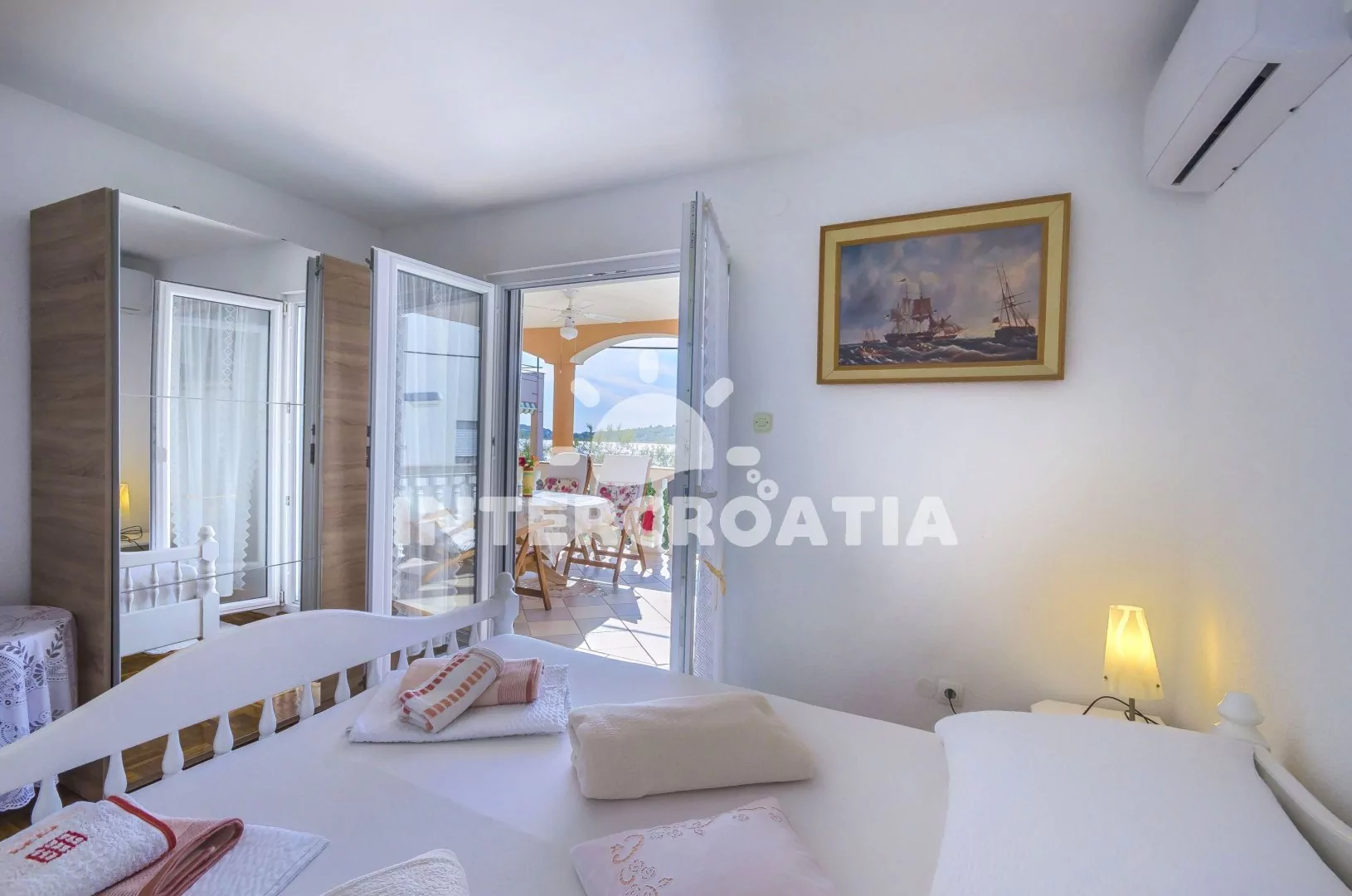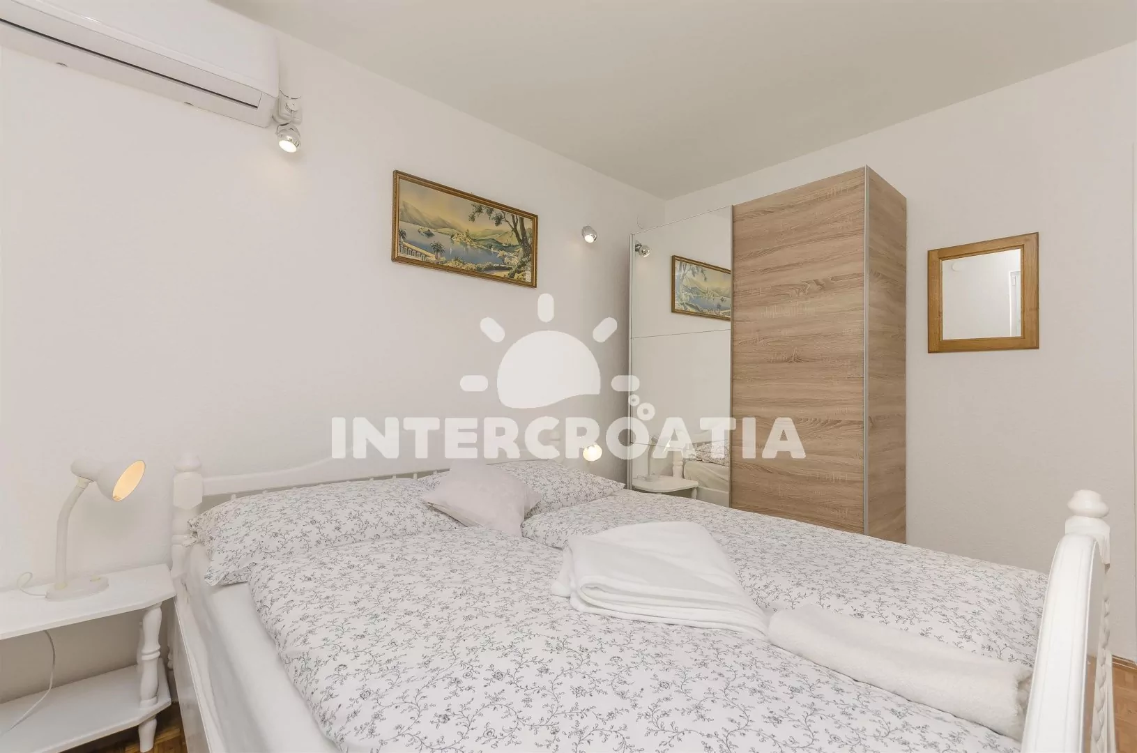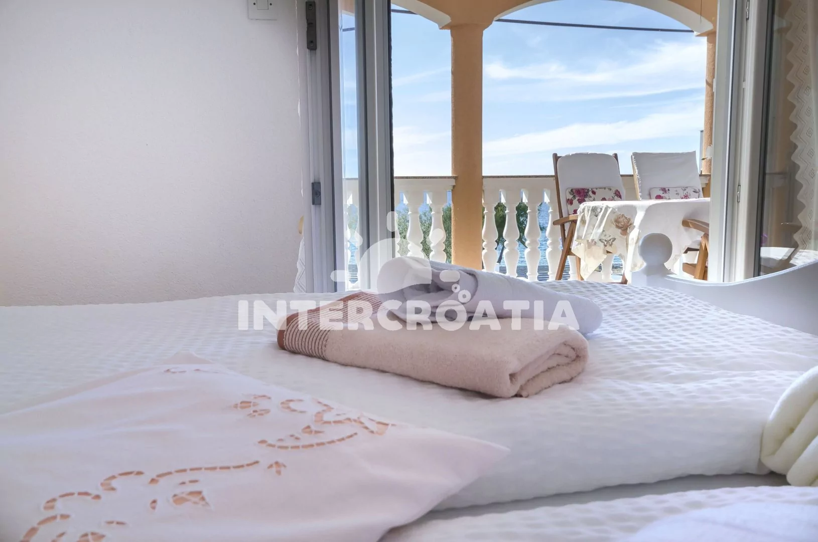 Apartmán (60 m2) s terasou a výhledem na moře se nachází v 1. patře domu. Apartmán má 3 ložnice a je vhodný pro až 6 osob. Obývací místnost je spojena s kuchyní. Kuchyňská linka je vybavena varnou deskou, vestavěnou troubou, myčkou na nádobí, rychlovarnou konvicí, kávovarem, mikrovlnnou troubou, nádobím a lednicí s mrazákem. Obývací místnost s jídelním stolem pro 4 osoby a televizí. První, druhá i třetí ložnice je vybavena dvoulůžkem, klimatizací a vstupem na terasu. Dvě koupelny se sprchovým koutem, umyvadlem a wc. Hostům je k dispozici parkování u objektu zdarma.