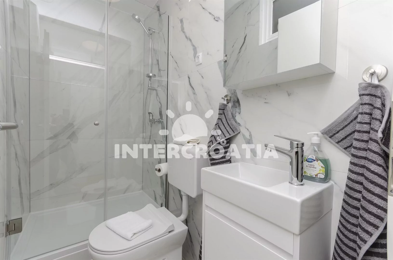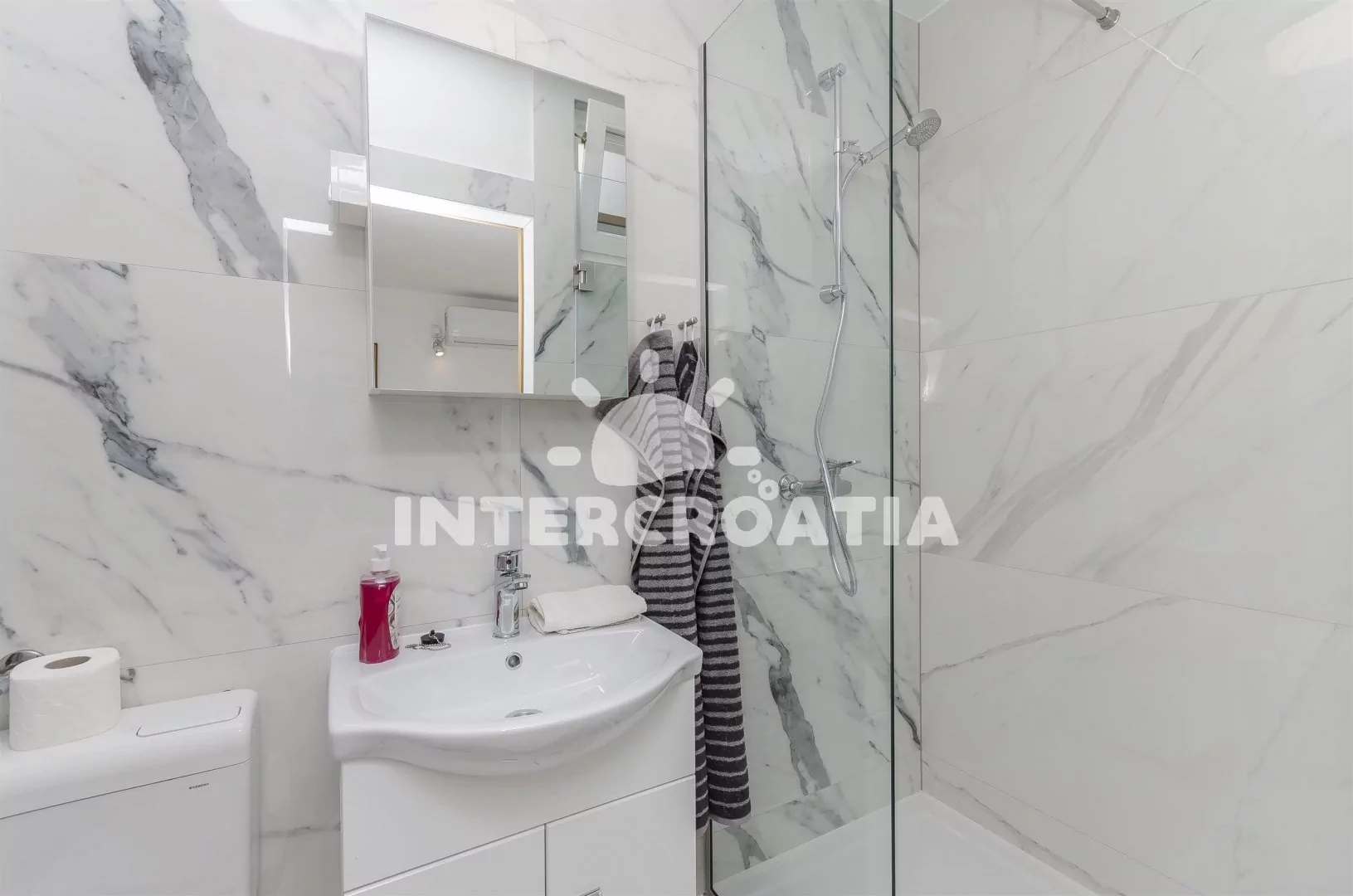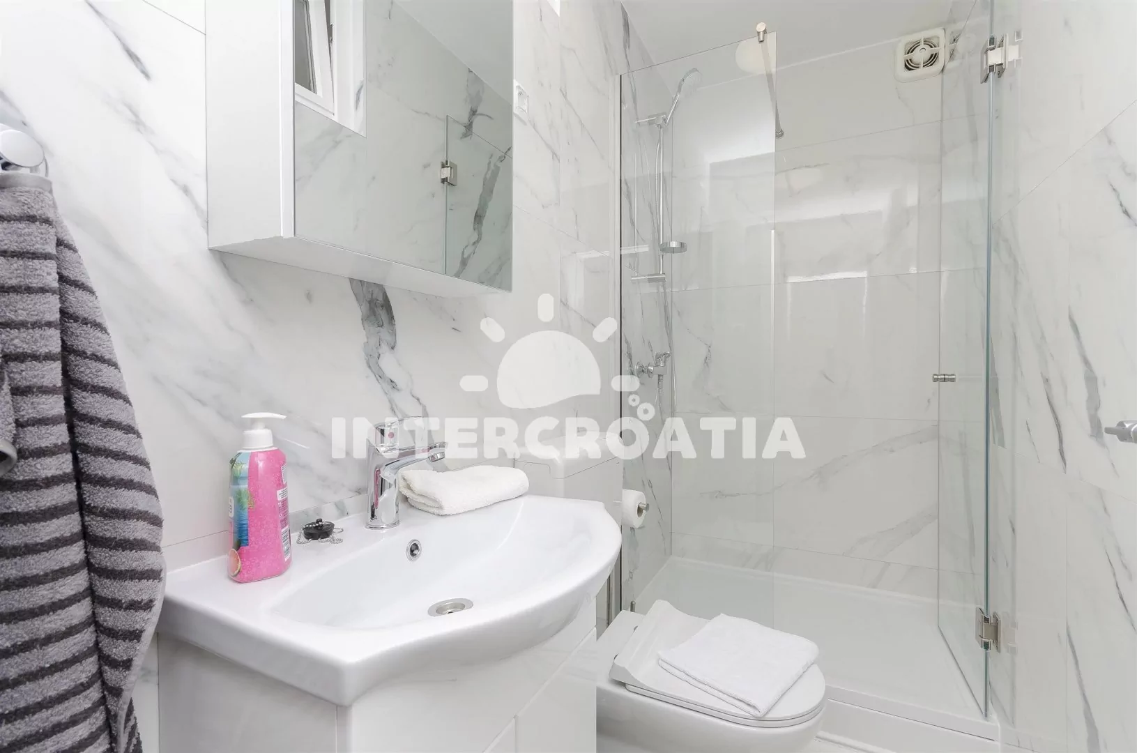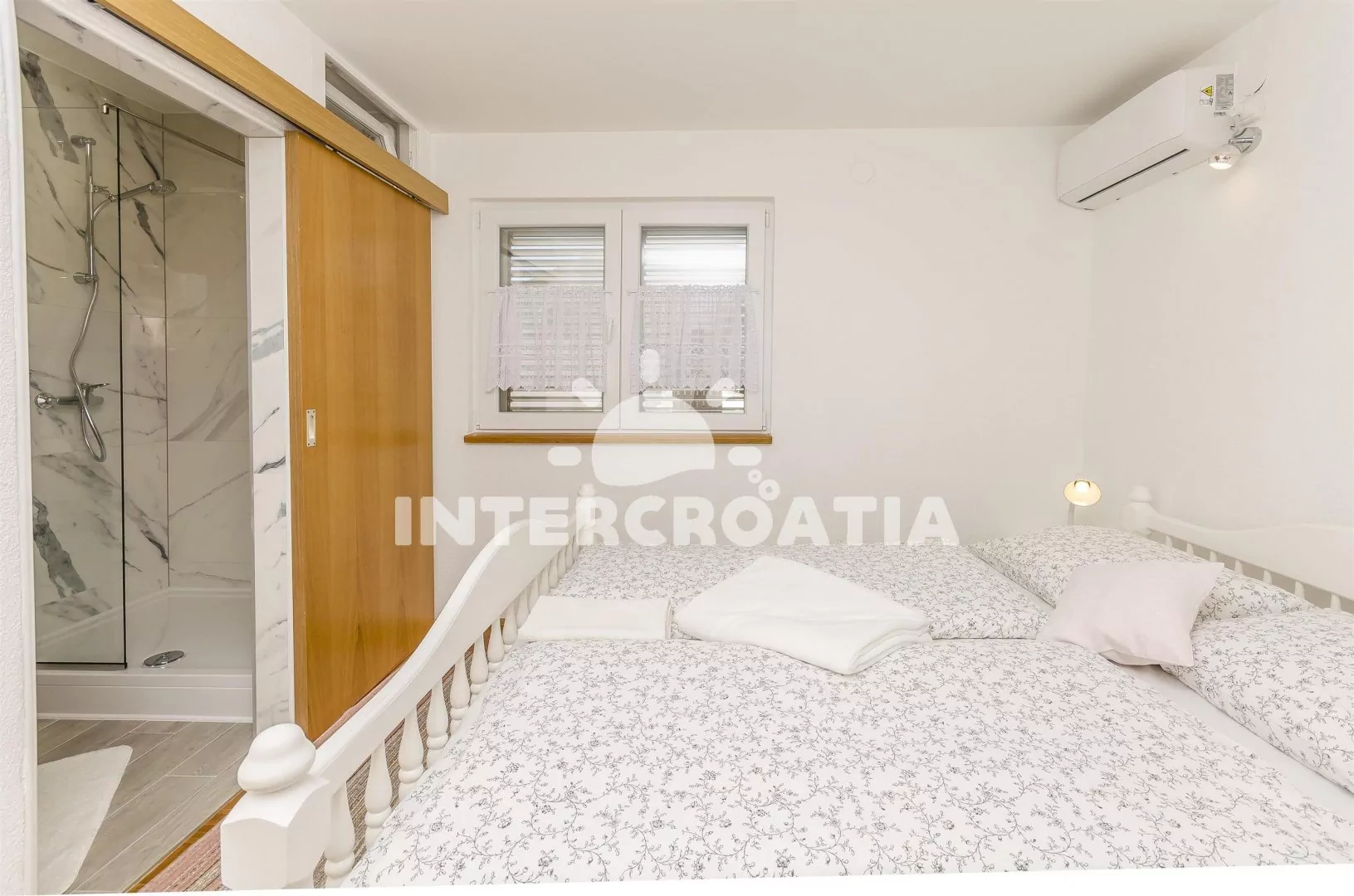 Apartmán (60 m2) s terasou a výhledem na moře se nachází v 1. patře domu. Apartmán má 3 ložnice a je vhodný pro až 6 osob. Obývací místnost je spojena s kuchyní. Kuchyňská linka je vybavena varnou deskou, vestavěnou troubou, myčkou na nádobí, rychlovarnou konvicí, kávovarem, mikrovlnnou troubou, nádobím a lednicí s mrazákem. Obývací místnost s jídelním stolem pro 4 osoby a televizí. První, druhá i třetí ložnice je vybavena dvoulůžkem, klimatizací a vstupem na terasu. Dvě koupelny se sprchovým koutem, umyvadlem a wc. Hostům je k dispozici parkování u objektu zdarma.