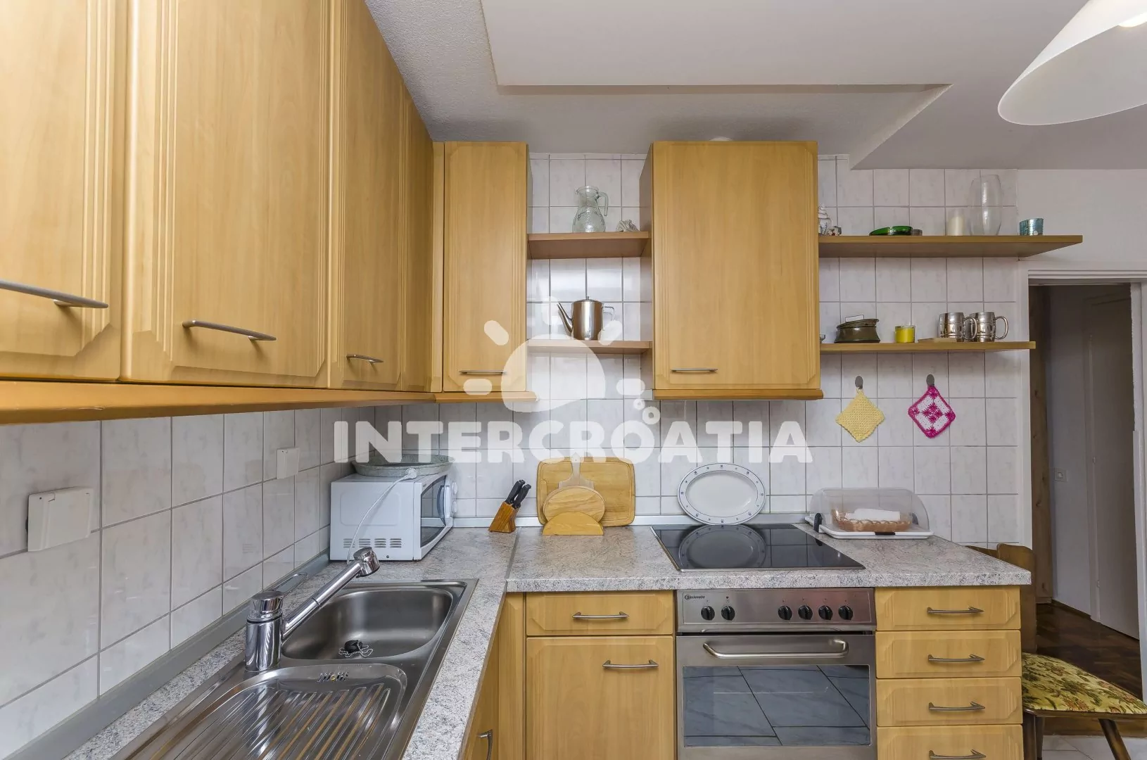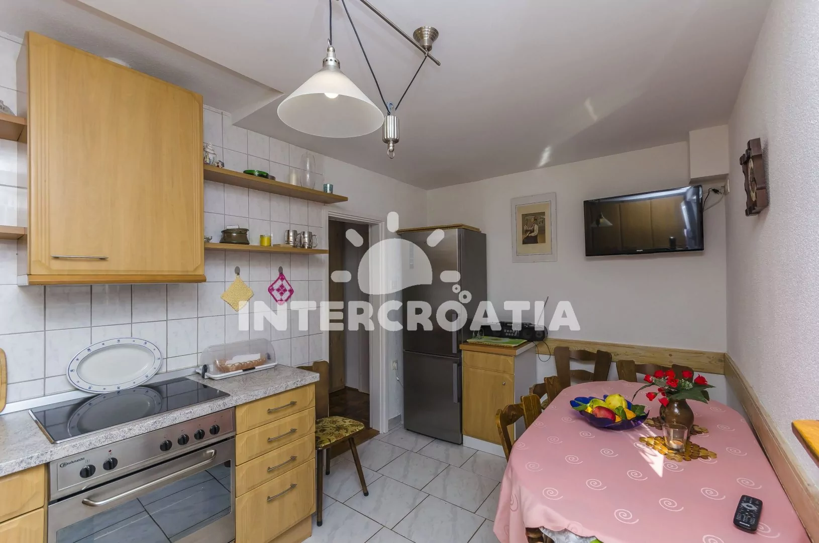 Apartmán (60 m2) s terasou a výhledem na moře se nachází v 1. patře domu. Apartmán má 3 ložnice a je vhodný pro až 6 osob. Obývací místnost je spojena s kuchyní. Kuchyňská linka je vybavena varnou…