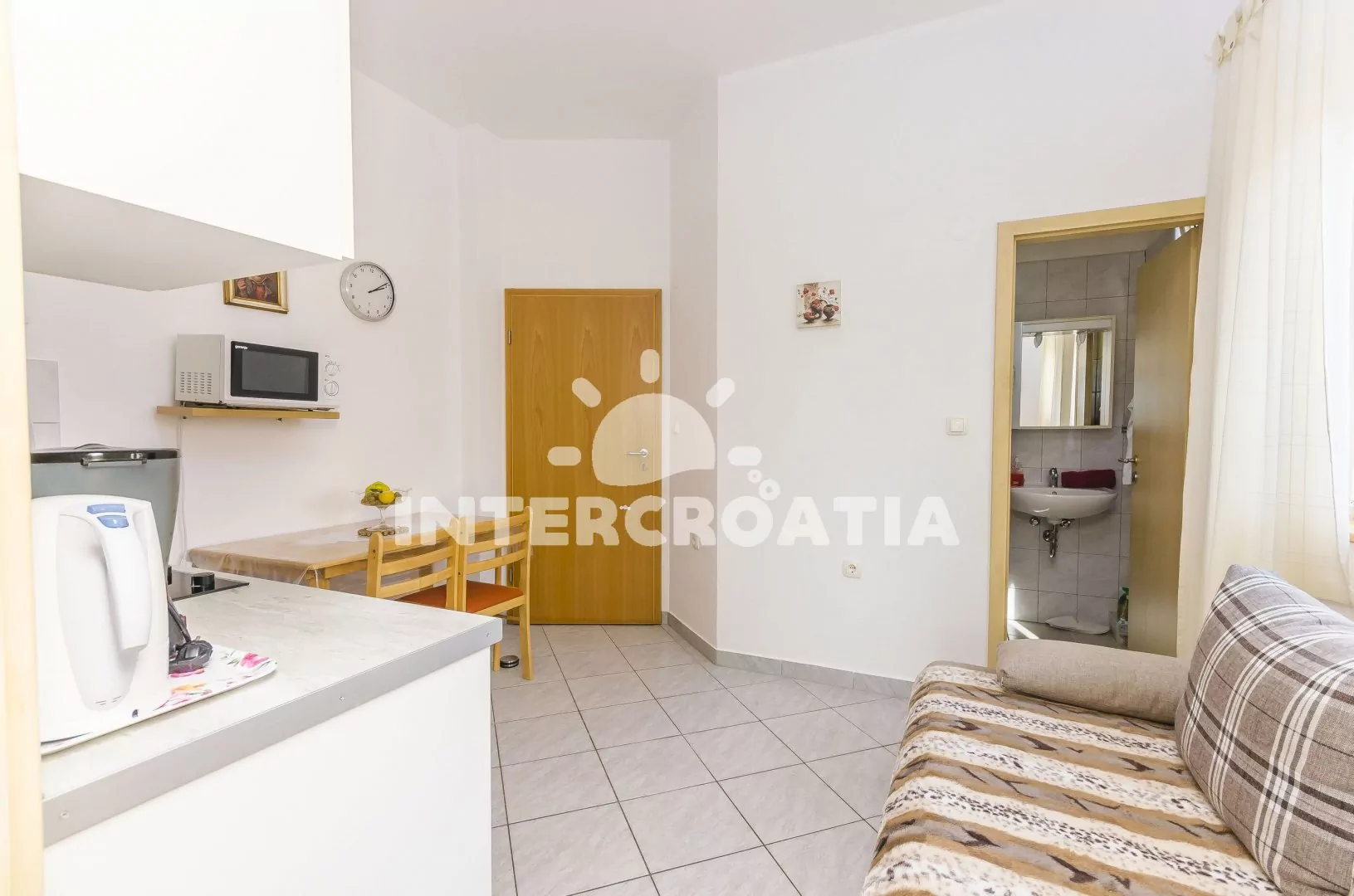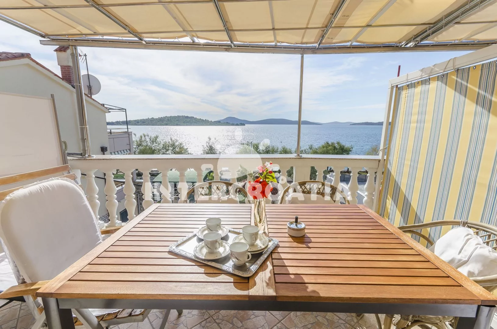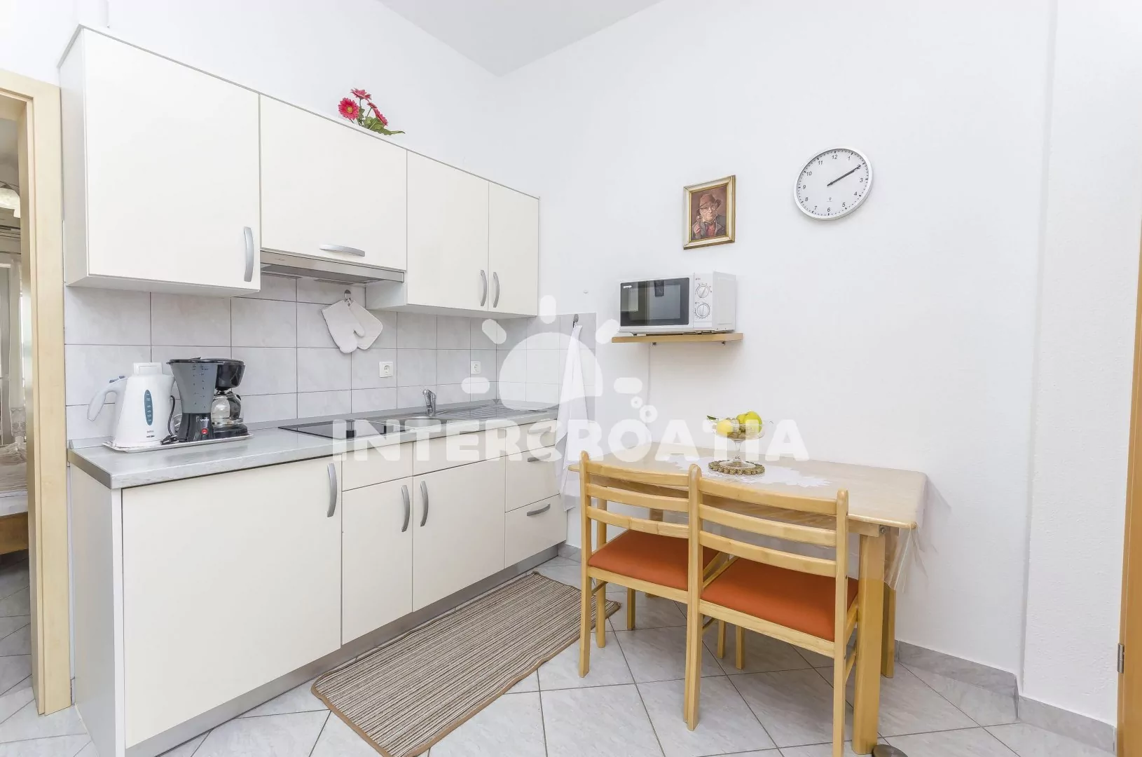 Vzdálenosti: Moře a oblázková pláž 30 m, centrum 1,3 km, tenis 180 m, restaurace 200 m, bar 300 m, supermarket, veřejná doprava, půjčovna motorových člunů 500 m, půjčovna cyklistických kol 600 m, směnárna, potápění, přístav 1 km, banka 1,1 km, ambulance, lékárna, pošta 1,3 km, čerpací stanice 1,2 km, diskotéka 1,5 km, letiště 69 km, trajekt 80 km.