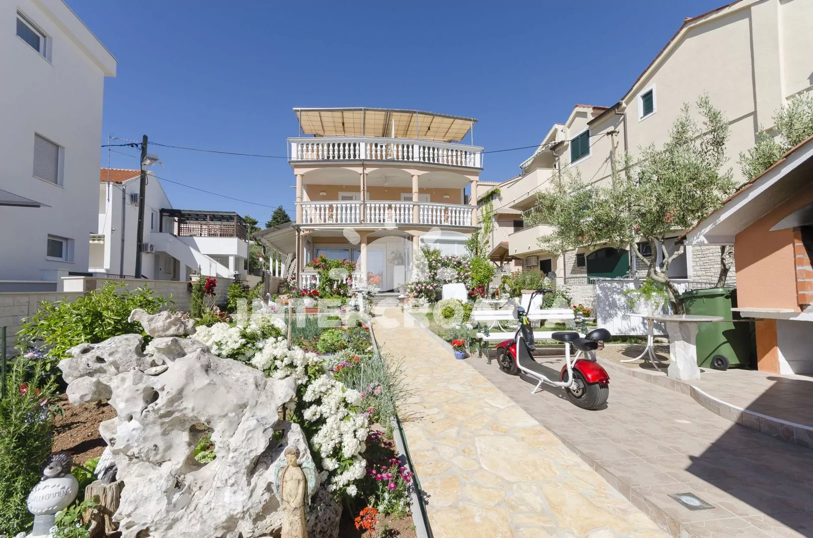 Skvěle umístěný dům v první linii u moře se nachází na okraji města Vodice. Apartmány jsou klimatizované a disponují lodžiemi s posezením. Od domu vyjdete přímo na oblázkové pláži. Dům má vlastní oplocený pozemek se zahrádkou, terasou s posezením a grilem. Parkovací místa u domu.