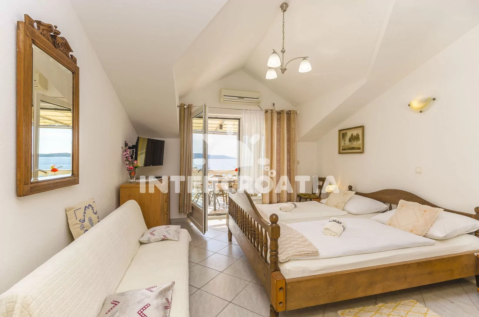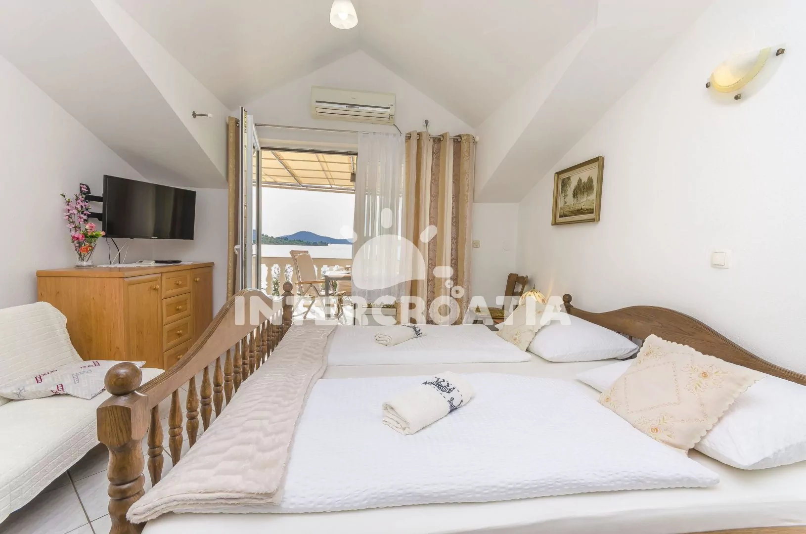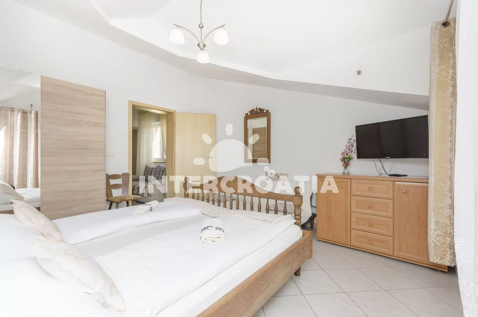 Podkrovní apartmán (40 m2) s balkonem a výhledem na moře je vhodný pro 2 až 4 osoby. Obývací pokoj je spojený s kuchyní. Kuchyňská linka je vybavena dvouplotýnkovou varnou deskou, digestoří, rychlovarnou konvicí, mikrovlnnou troubou, kávovarem, nádobím a malou vestavěnou chladničkou. Obývací pokoj s jídelním stolem a pohovkou (rozložitelná na extra lůžko pro 2 osoby). Ložnice s dvoulůžkem, televizí, klimatizací a vstupem na balkon. Koupelna se sprchovým koutem, umyvadlem a wc. Hostům je k dispozici parkování u objektu zdarma.