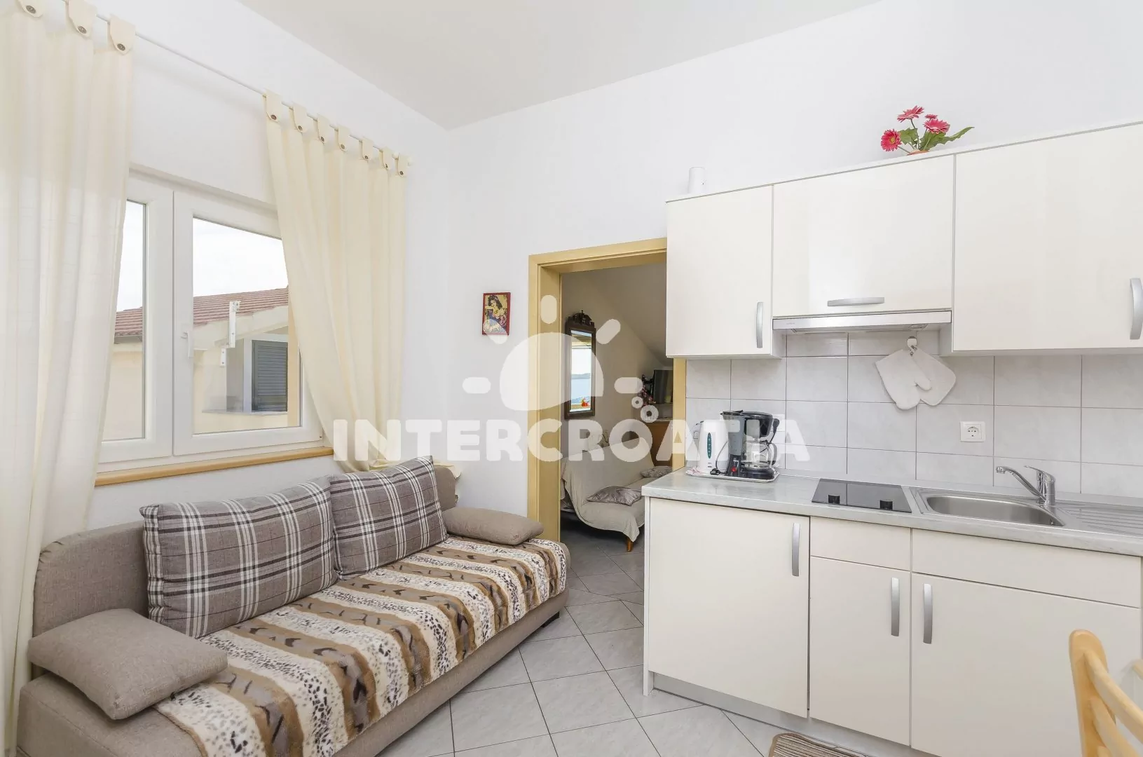 Podkrovní apartmán (40 m2) s balkonem a výhledem na moře je vhodný pro 2 až 4 osoby. Obývací pokoj je spojený s kuchyní. Kuchyňská linka je vybavena dvouplotýnkovou varnou deskou, digestoří,…