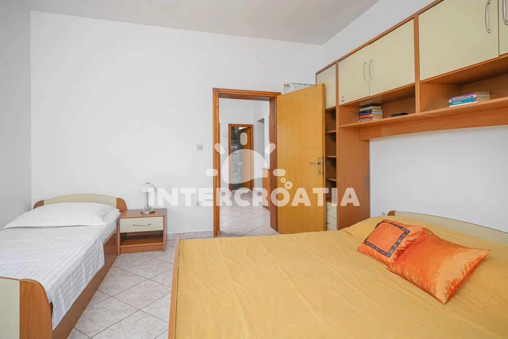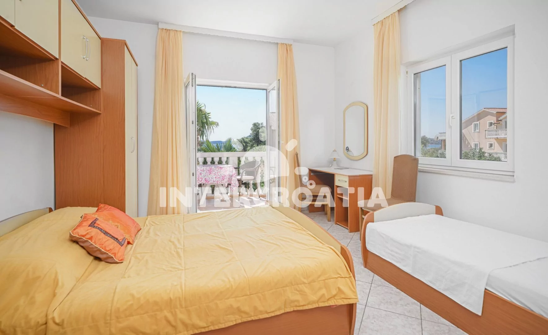 Apartmán (75 m2) s balkonem a částečným výhledem na moře se nachází v 1. patře domu. Apartmán má 3 ložnice a je vhodný pro 6 až 7 osob. Obývací místnost je spojena s kuchyní. Kuchyňská linka je vybavena sporákem s troubou, digestoří, rychlovarnou konvicí, nádobím a lednicí s mrazákem, mikrovlnná trouba na požádání. Obývací místnost s jídelním stolem pro 6 osob, televizí se satelitním programem a klimatizací. První ložnice s dvoulůžkem. Druhá ložnice s dvoulůžkem, jedním jednolůžkem a vstupem na balkon. Třetí ložnice s dvoulůžkem. První koupelna se sprchovým koutem, umyvadlem, fénem a wc. Druhá koupelna s vanou a sprchovou zástěnou. Hostům je k dispozici parkování u objektu zdarma.