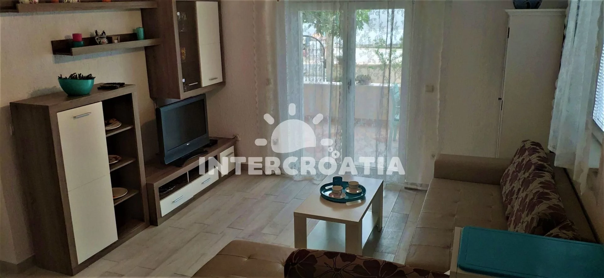 Apartmán (60 m2) s vlastní terasou (30 m2) a výhledem do klidné ulice se nachází v přízemí domu. Apartmán má 2 ložnice a je vhodný pro 4 až 6 osob. Obývací pokoj je spojený s kuchyní. Kuchyňská linka je vybavena sporákem s troubou, rychlovarnou konvicí, kávovarem, mikrovlnnou troubou, nádobím a lednicí s mrazákem. Obývací pokoj s jídelním stolem pro 6 osob, rohovou pohovkou (rozložitelná na extra lůžko pro 2 osoby), televizí se satelitním programem, klimatizací a vstupem na terasu. První ložnice s dvoulůžkem. Druhá ložnice s dvěma jednolůžky. Koupelna se sprchovým koutem, umyvadlem, fénem, pračkou a wc. Hostům je k dispozici parkování u objektu zdarma.