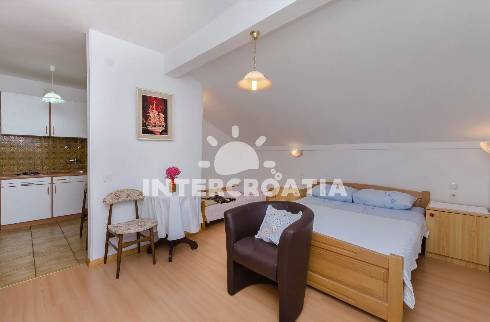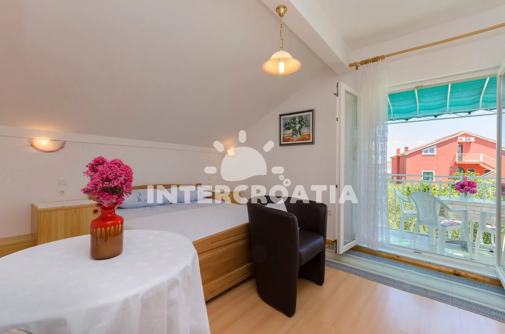 Vzdálenosti: Moře a oblázková pláž 200 m, restaurace, bar 250 m, supermarket 400 m, centrum 600 m, banka, pošta 850 m, ambulance, lékárna 1 km, trajekt, letiště 65 km.