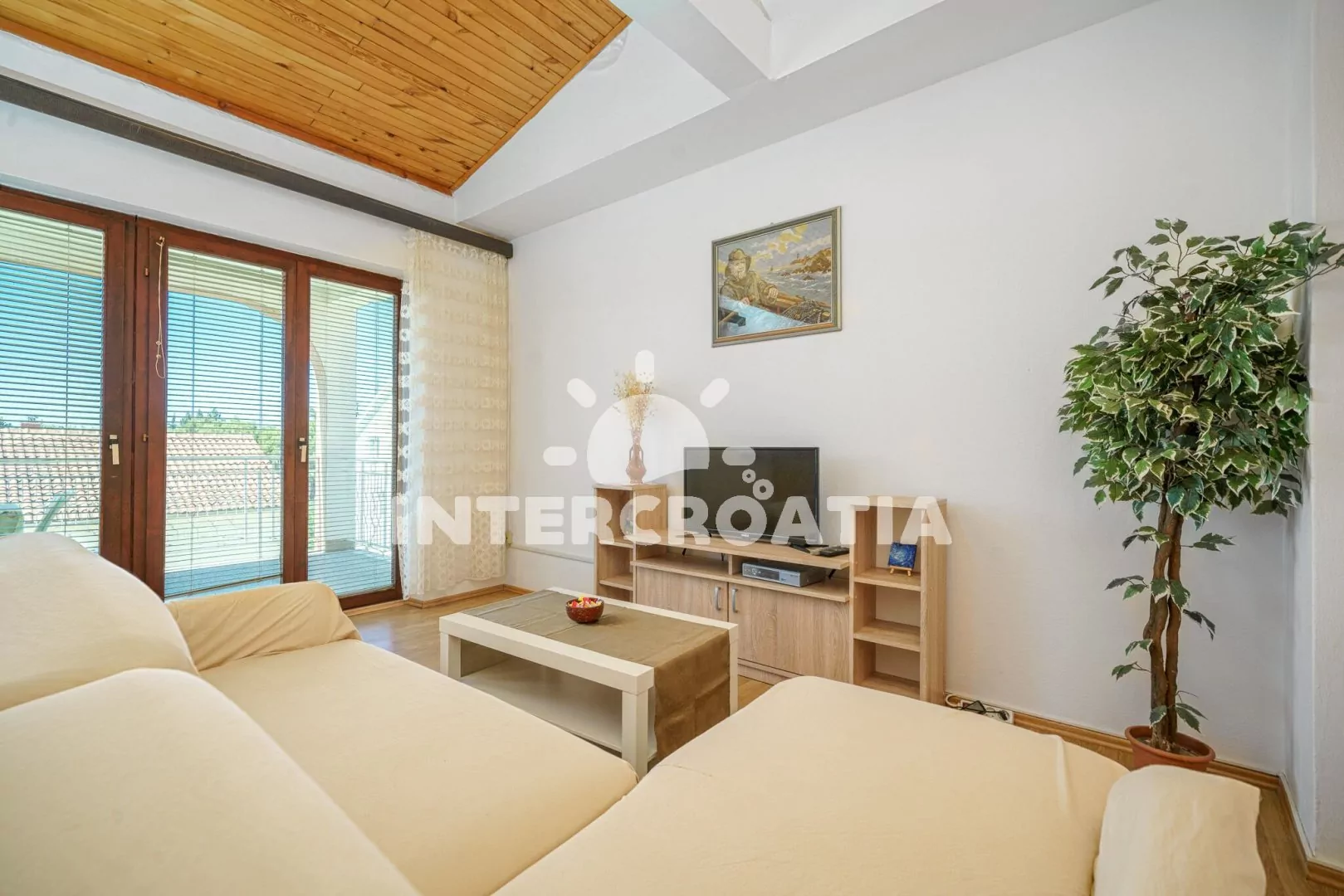 Apartmán (80 m2) s balkonem a posezením se nachází ve 2. patře domu. Apartmán má 2 ložnice a je vhodný pro až 6 osob. Obývací pokoj je spojený s kuchyní. Kuchyňská linka je vybavena sporákem s troubou, kávovarem, nádobím a lednicí s mrazákem. Obývací pokoj s jídelním stolem pro 5 osob, pohovkou, televizí, klimatizací a vstupem na balkon. První i druhá ložnice je vybavena vždy s dvoulůžkem a jedním jednolůžkem. Koupelna se sprchovým koutem, umyvadlem, bidetem a wc. Hostům je k dispozici parkování u objektu zdarma.