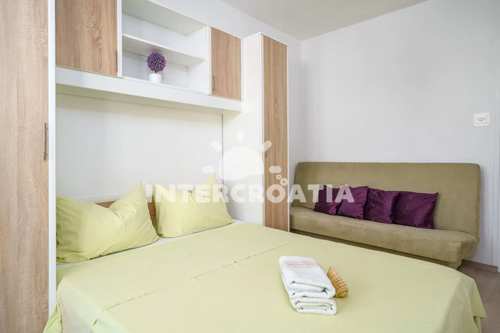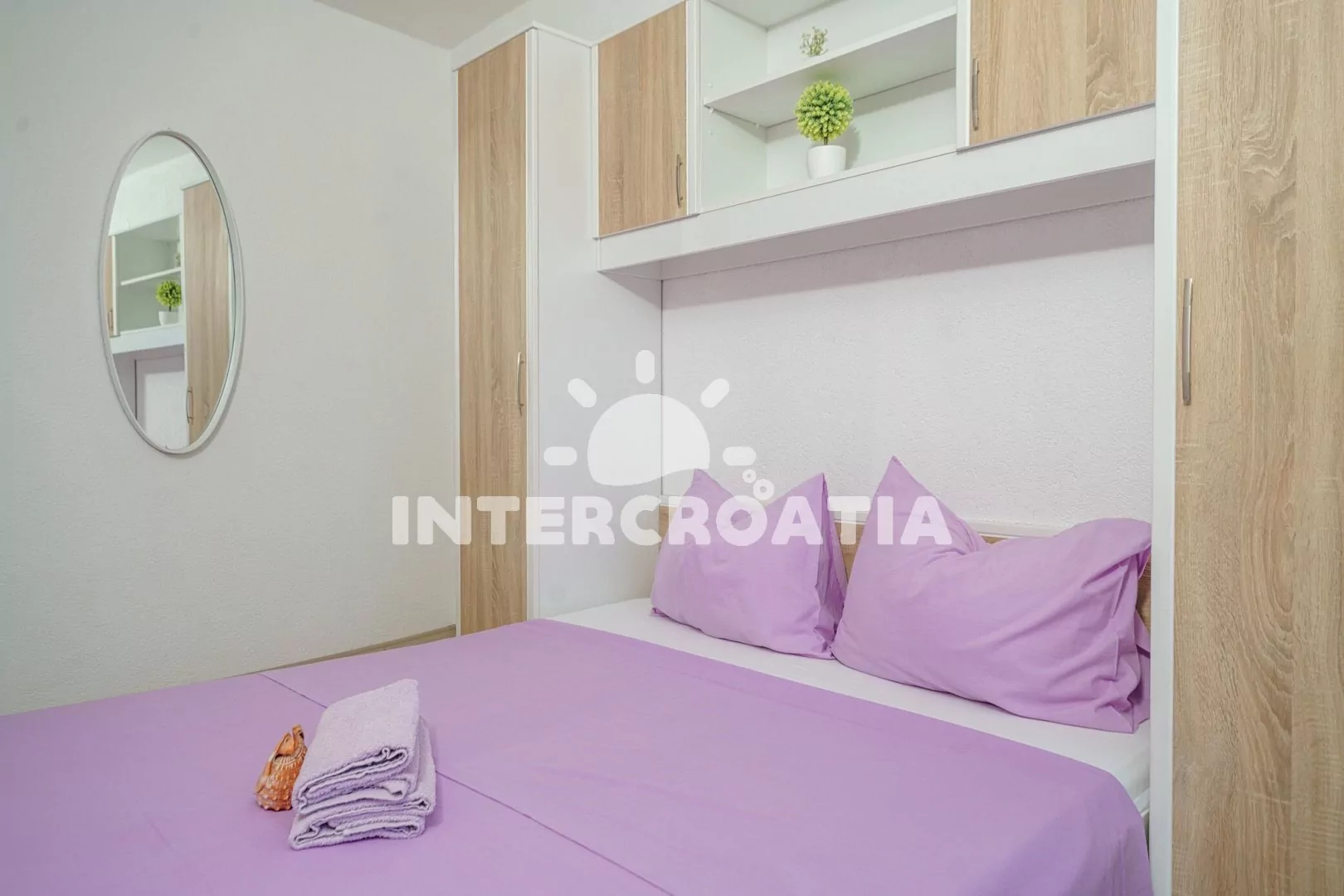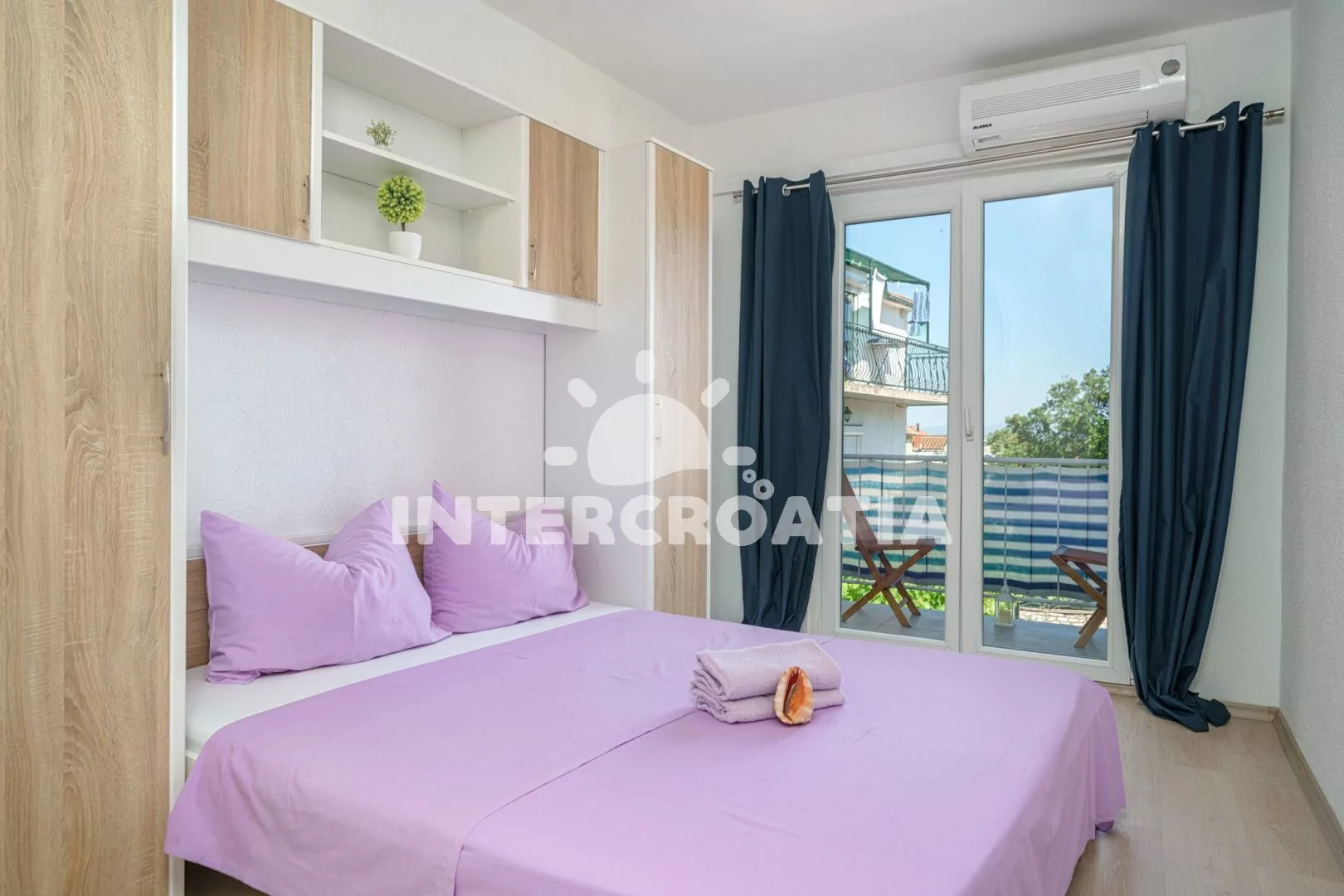 Apartmán (45 m2) s balkonem a částečným výhledem na moře se nachází v 1. patře domu. Apartmán má 2 ložnice a je vhodný pro 4 až 5 osob. Obývací místnost je spojena s kuchyní. Kuchyňská linka je vybavena dvouplotýnkovým vařičem, digestoří, mikrovlnnou troubou, rychlovarnou konvicí, nádobím a lednicí s mrazákem. Obývací místnost s jídelním stolem pro 4 osoby a televizí. První ložnice s dvoulůžkem, klimatizací a vstupem na balkon. Druhá ložnice s dvoulůžkem, pohovkou (rozložitelná na extra lůžko pro 1 osobu) a vstupem na balkon. Koupelna se sprchovým koutem, umyvadlem, fénem a wc. Hostům je k dispozici parkování u objektu zdarma.