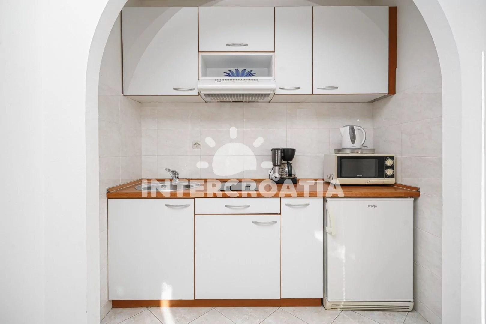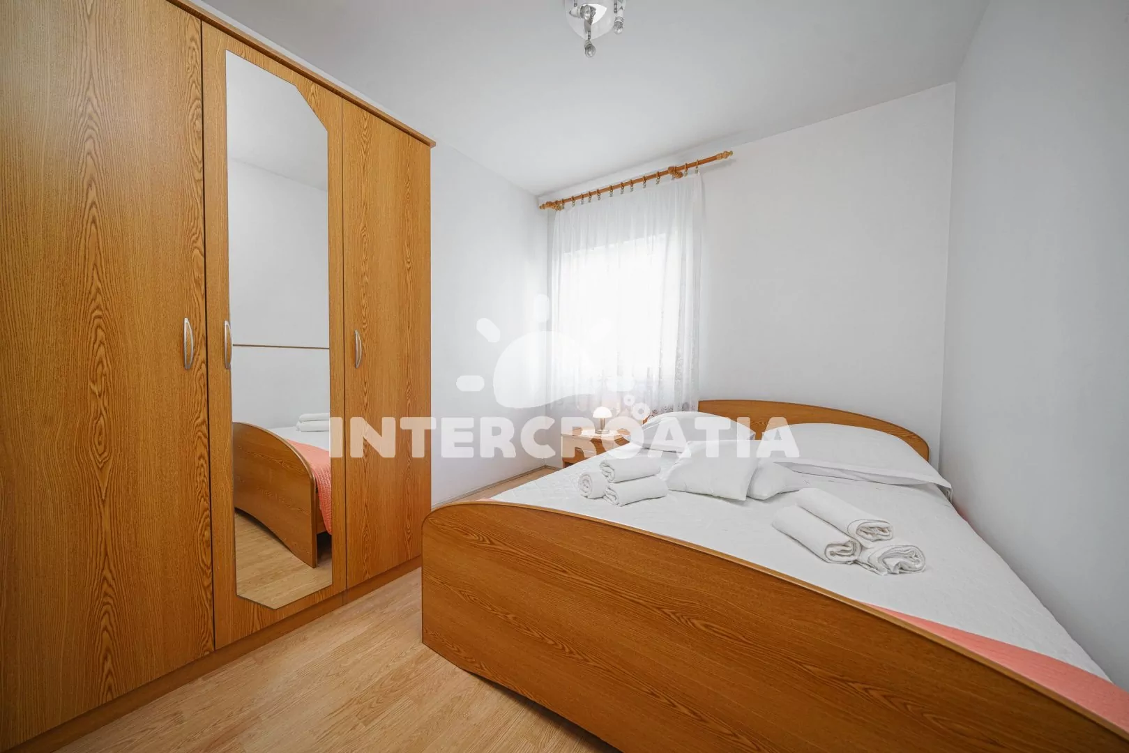 Apartmán (65 m2) s terasou a posezením se nachází v 1. patře domu. Apartmán má 2 ložnice a je vhodný pro 4 až 6 osob. Obývací pokoj je spojený s kuchyní. Kuchyňská linka je vybavena dvouplotýnkovým vařičem, digestoří, mikrovlnnou troubou, rychlovarnou konvicí, kávovarem, nádobím a lednicí s mrazákem. Obývací pokoj s jídelním stolem pro 6 osob, pohovkou (rozložitelná na extra lůžko pro 2 osoby), televizí se satelitním programem, klimatizací a vstupem na terasu. První i druhá ložnice je vybavena vždy s jedním dvoulůžkem. Koupelna se sprchovým koutem, umyvadlem a wc. Hostům je k dispozici parkování u objektu zdarma.