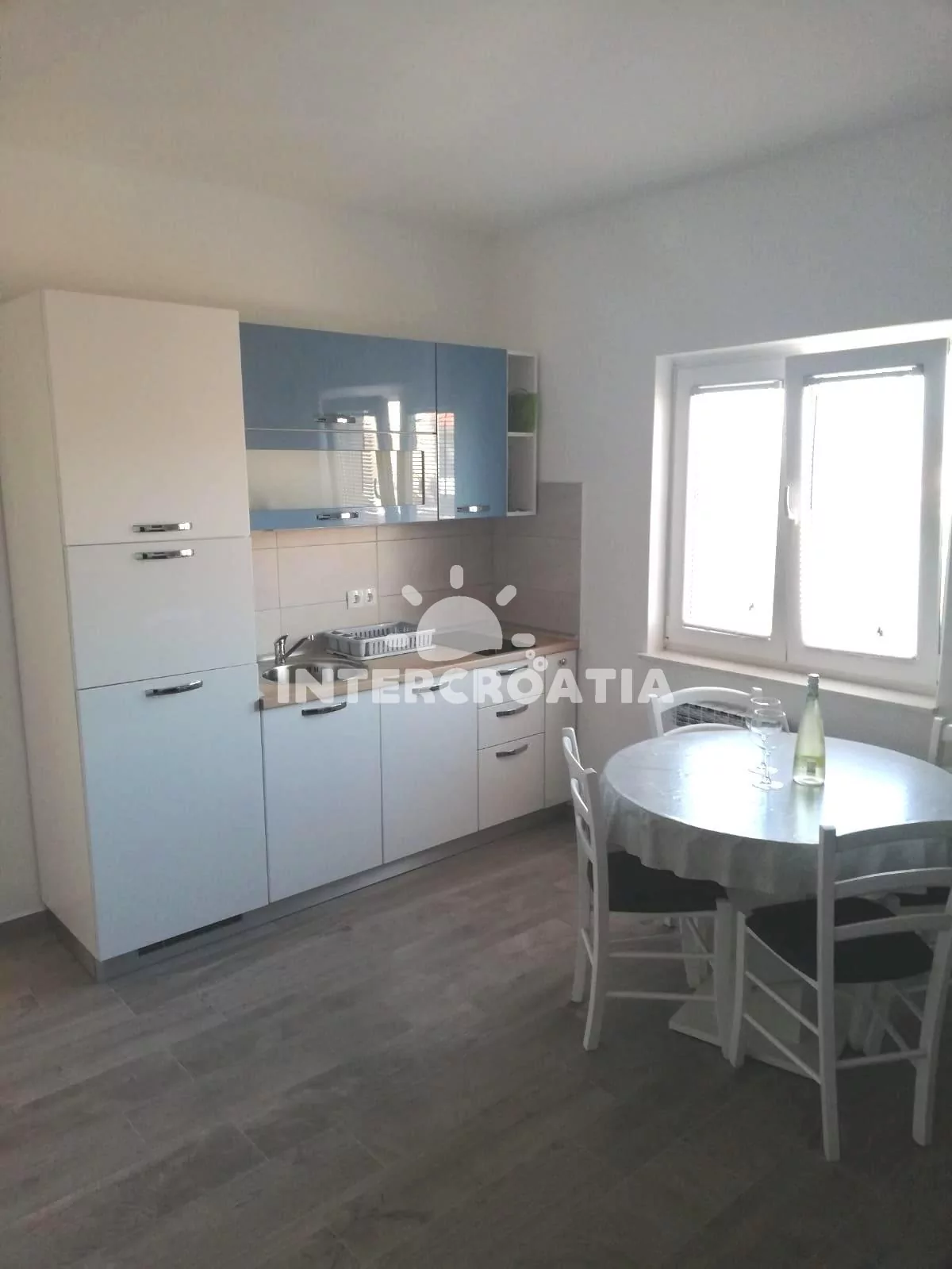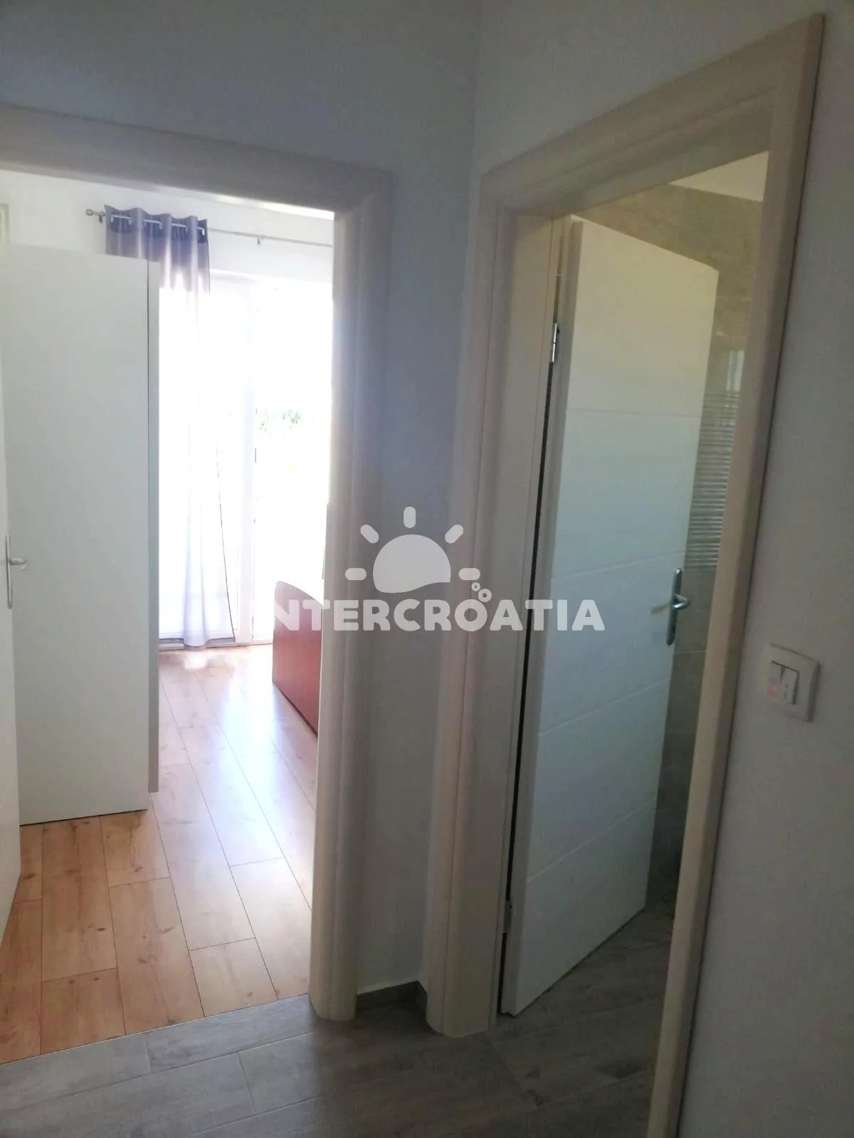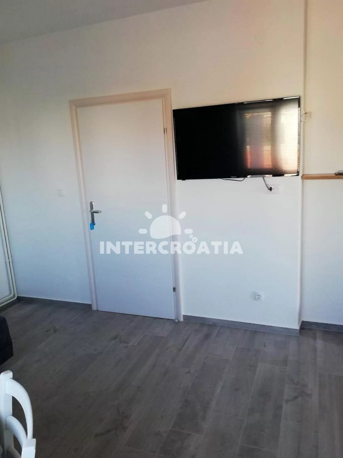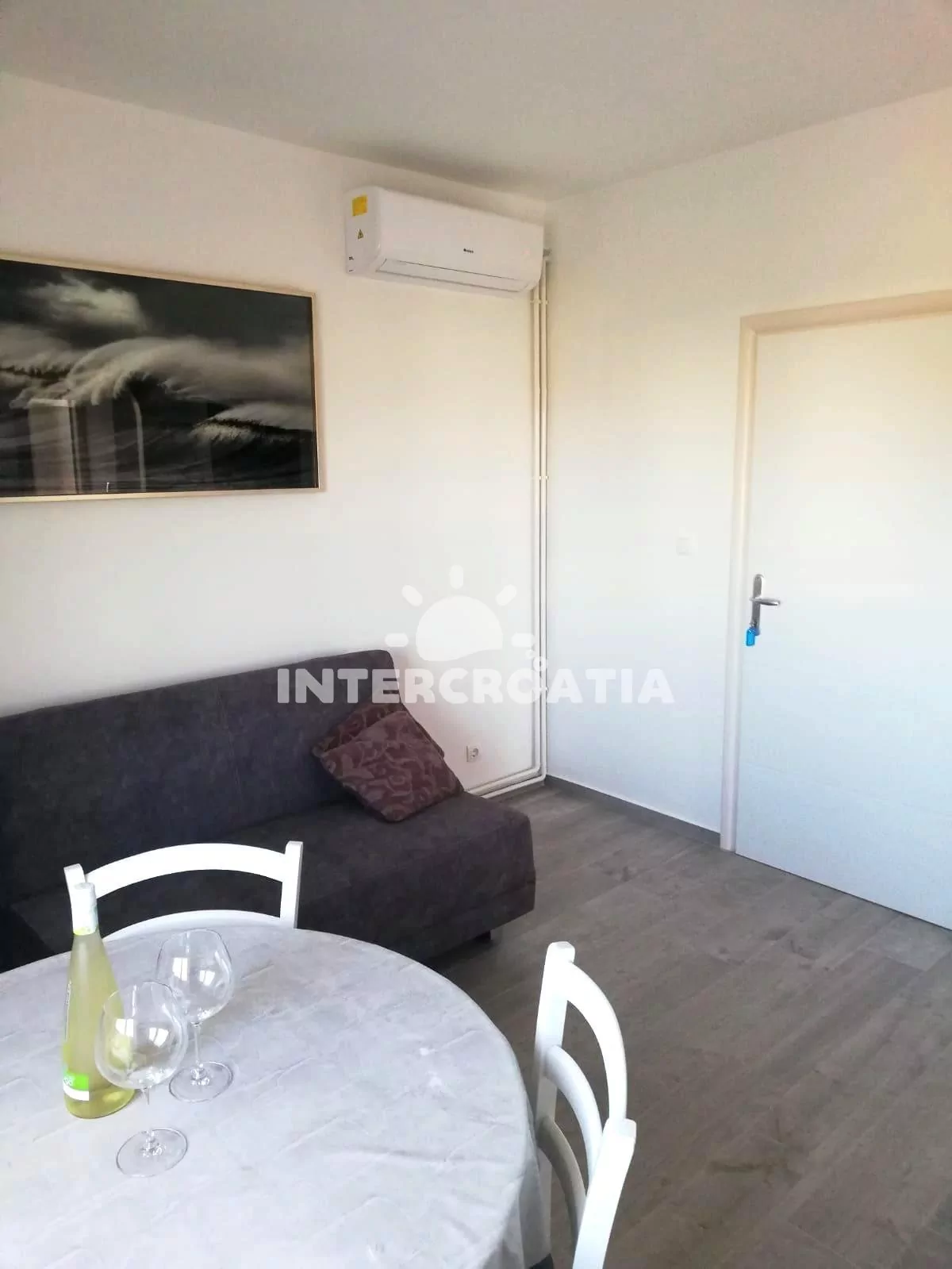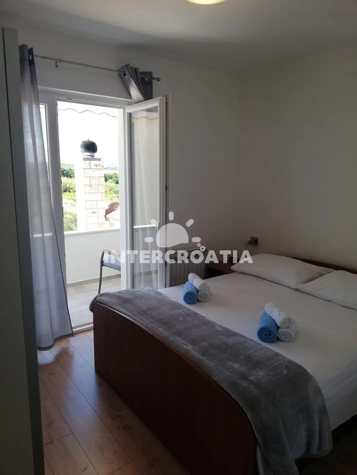 Apartmán (37 m2) s balkonem, venkovním posezením a částečným výhledem na moře se nachází v 1. patře domu. Apartmán má 1 ložnici a je vhodný pro 2 osoby. Obývací pokoj je spojený s kuchyní. Kuchyňská linka je vybavena dvouplotýnkovým vařičem, digestoří, rychlovarnou konvicí, kávovarem, nádobím a lednicí s mrazákem. Obývací pokoj s jídelním stolem, pohovkou, televizí se satelitním programem a klimatizací. Ložnice s jedním dvoulůžkem a vstupem na balkon. Koupelna se sprchovým koutem, umyvadlem, fénem, pračkou a wc. Hostům je k dispozici parkování u objektu zdarma.