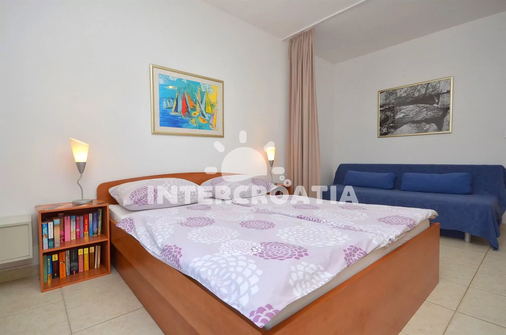 Apartmán (29 m2) s balkonem, posezením a částečným výhledem na moře se nachází v 1. patře domu. Apartmán má 1 ložnici a je vhodný pro 2 až 3 osoby. Kuchyňská linka je vybavena sklokeramickou varnou deskou, mikrovlnnou troubou, kávovarem, rychlovarnou konvicí, nádobím a lednicí s mrazákem. Dále jídelní stůl a klimatizace. Ložnice s dvoulůžkem, pohovkou (rozložitelná na extra lůžko pro 1 osobu), sejfem, televizí se satelitním programem, klimatizací a vstupem na balkon. Koupelna se sprchovým koutem, umyvadlem a wc. Hostům je k dispozici parkování u objektu zdarma.