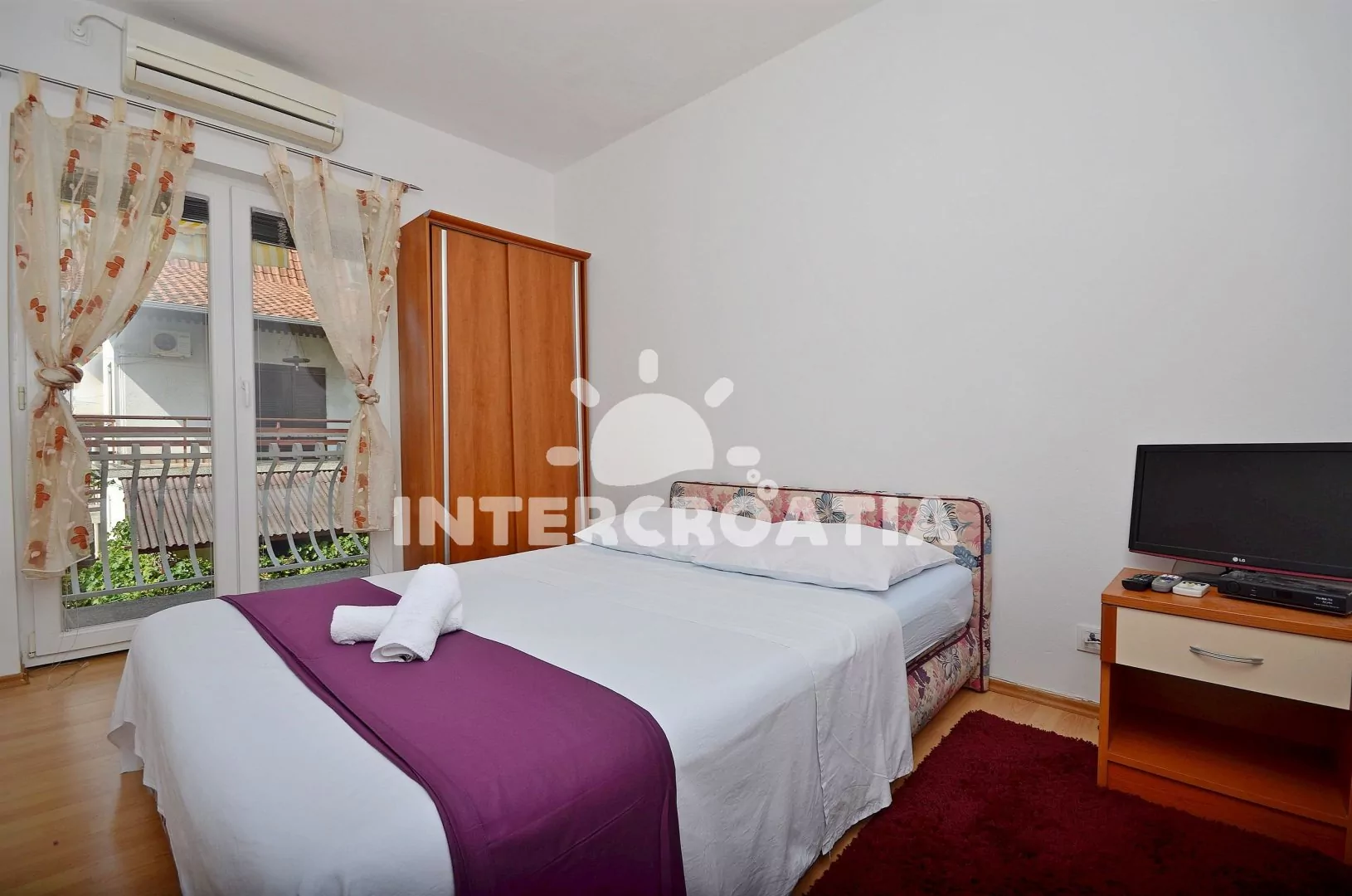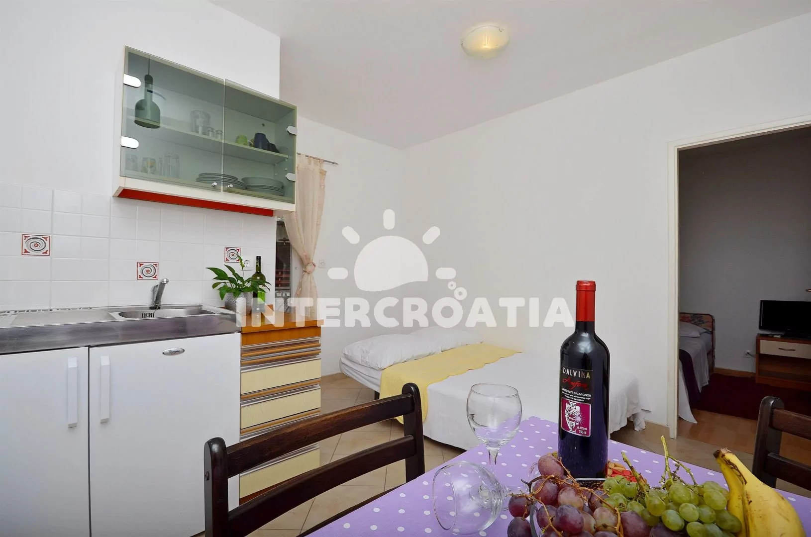 Apartmán (37 m2) s balkonem a venkovním posezením se nachází v 1. patře domu. Apartmán má 1 ložnici a je vhodný pro 2 až 3 osoby. Obývací pokoj je spojený s kuchyní. Kuchyňská linka je vybavena dvouplotýnkovým vařičem, rychlovarnou konvicí, nádobím a lednicí s mrazákem. Obývací pokoj s jídelním stolem, pohovkou (rozložitelná na extra lůžko pro 1 osobu) a vstupem na balkon. Ložnice s dvoulůžkem, televizí se satelitním programem, klimatizací a vstupem na balkon. Koupelna se sprchovým koutem, umyvadlem a wc. Hostům je k dispozici parkování u objektu zdarma.
