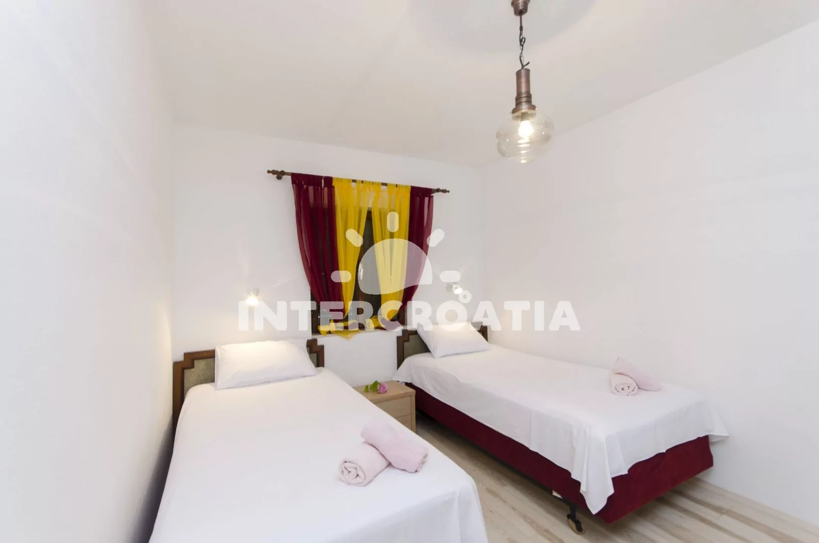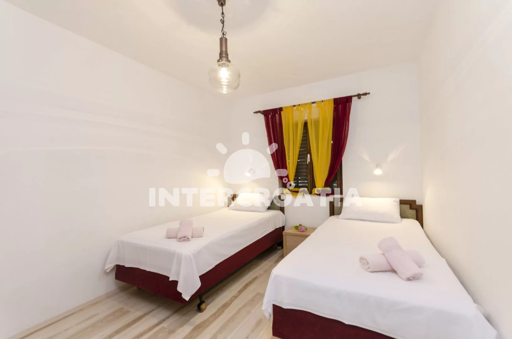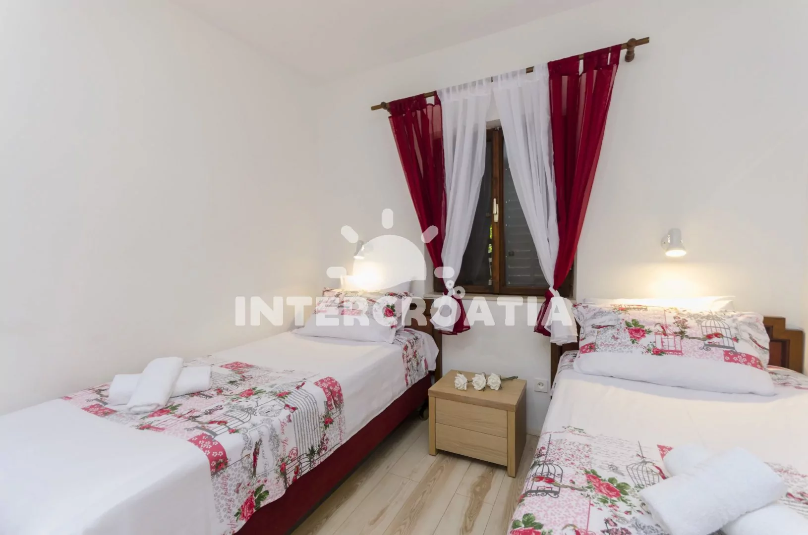 Apartmán (45 m2) s terasou a venkovním posezením se nachází v přízemí vily. Apartmán má 2 ložnice a je vhodný pro 4 až 5 osob. Obývací pokoj je spojený s kuchyní. Kuchyňská linka je vybavena dvouplotýnkovým vařičem, malou troubou, rychlovarnou konvicí, mikrovlnnou troubou, nádobím a lednicí s mrazákem. Obývací pokoj s jídelním stolem, pohovkou (rozložitelná na extra lůžko pro 1 osobu), televizí se satelitním programem, klimatizací a vstupem na terasu. První i druhá ložnice je vybavena vždy s dvěma jednolůžky. Koupelna se sprchovým koutem, umyvadlem a wc. Hostům je k dispozici parkování u vily zdarma.