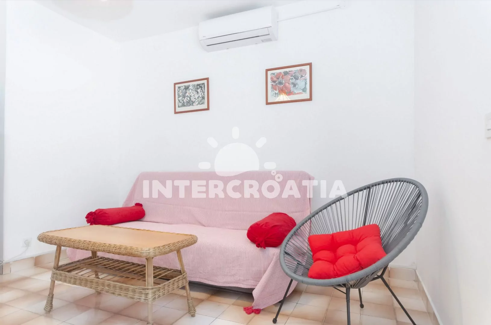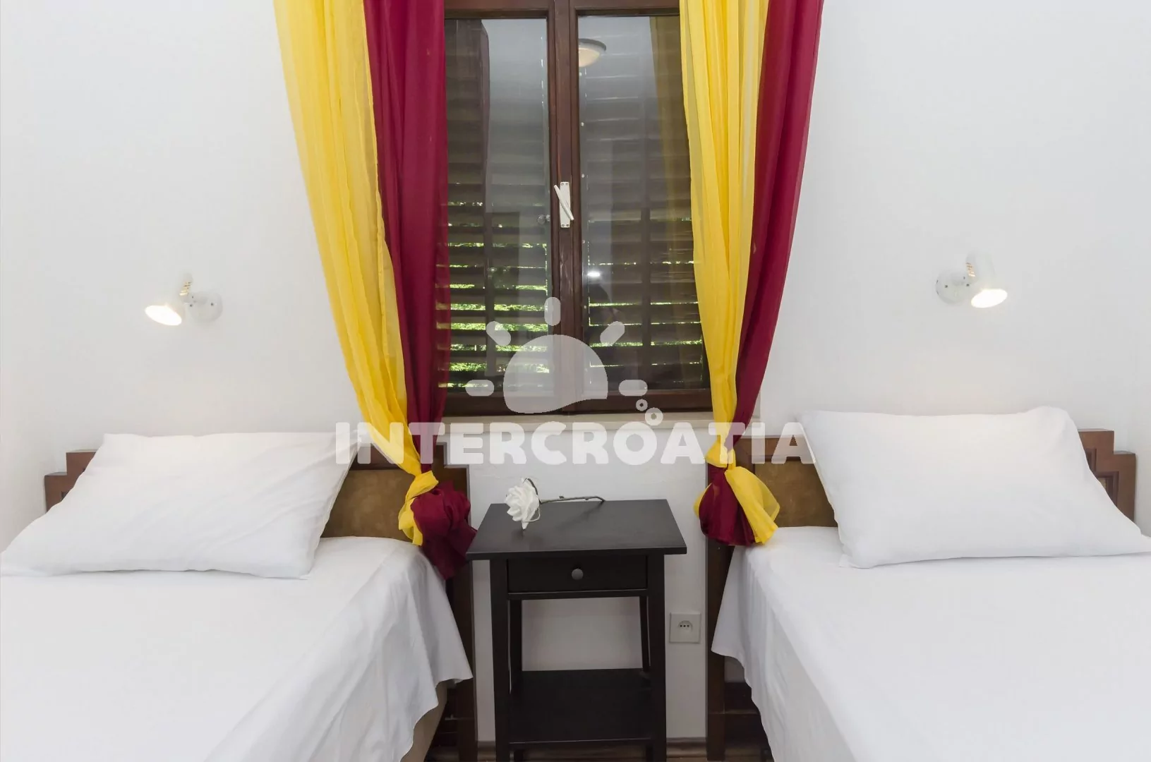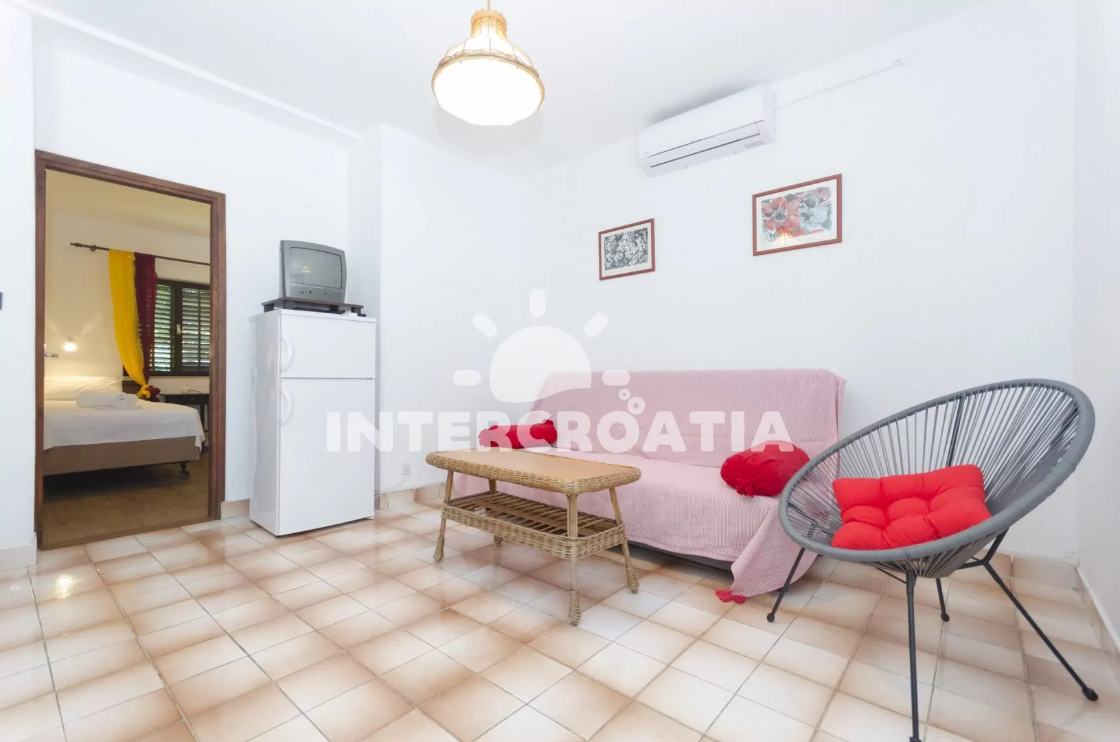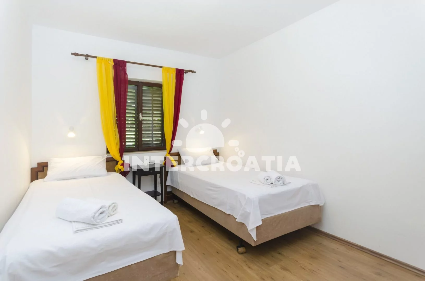 Apartmán (45 m2) s terasou a venkovním posezením se nachází v přízemí vily. Apartmán má 2 ložnice a je vhodný pro 4 až 5 osob. Obývací pokoj je spojený s kuchyní. Kuchyňská linka je vybavena dvouplotýnkovým vařičem, malou troubou, rychlovarnou konvicí, mikrovlnnou troubou, nádobím a lednicí s mrazákem. Obývací pokoj s jídelním stolem, pohovkou (rozložitelná na extra lůžko pro 1 osobu), televizí se satelitním programem, klimatizací a vstupem na terasu. První i druhá ložnice je vybavena vždy s dvěma jednolůžky. Koupelna se sprchovým koutem, umyvadlem a wc. Hostům je k dispozici parkování u vily zdarma.