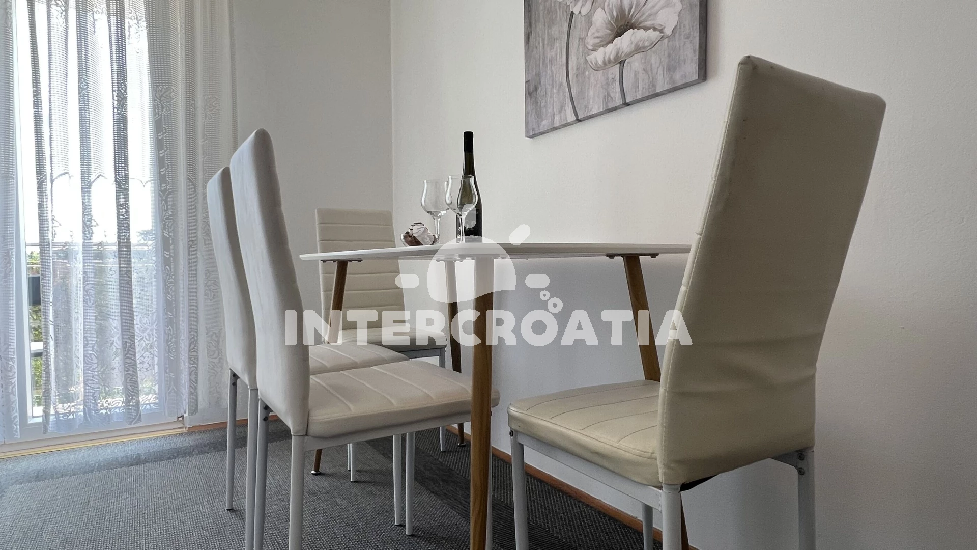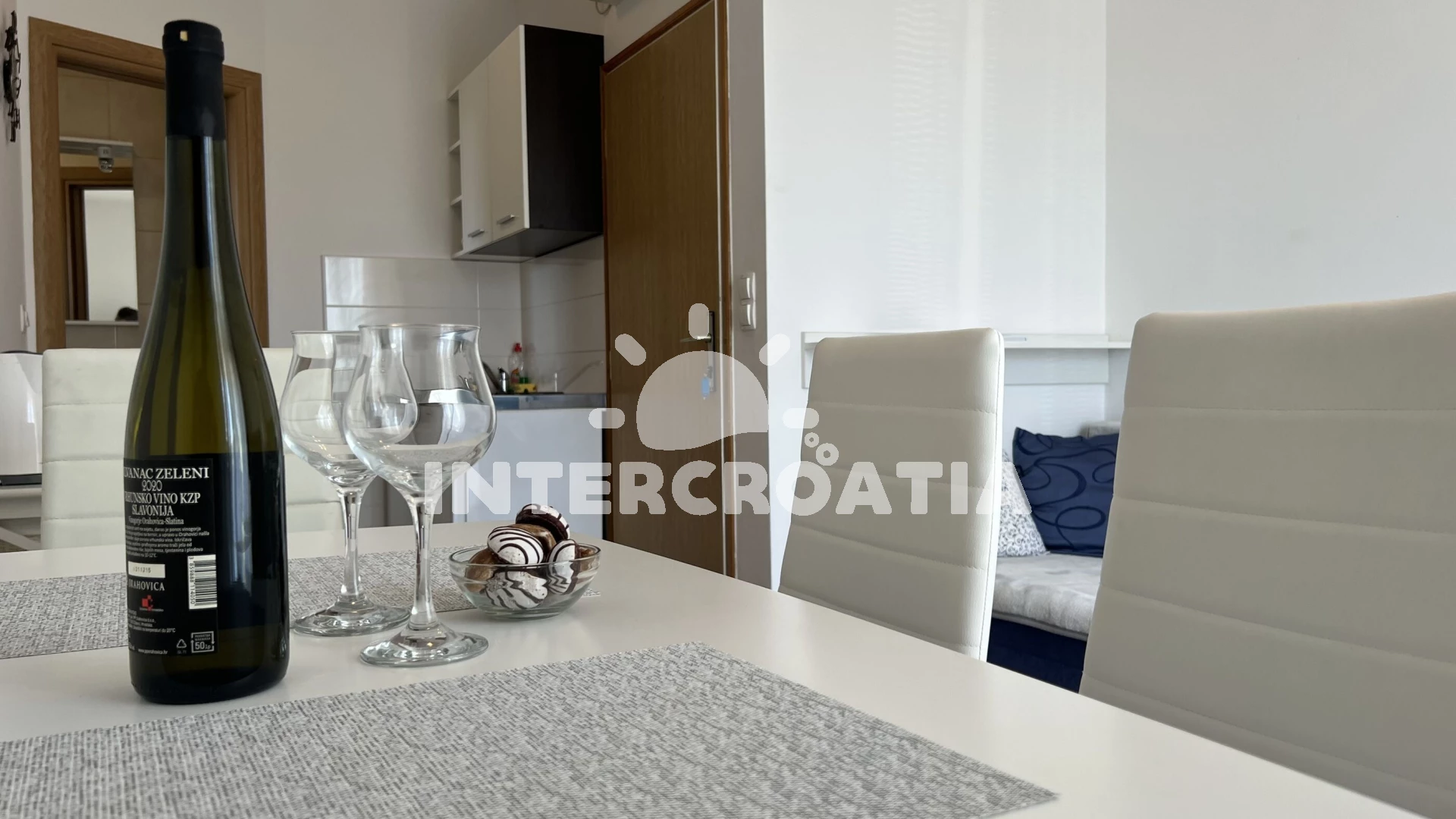 Apartmán (40 m2) s balkonem a venkovním posezením se nachází ve 2. patře domu. Apartmán má 1 ložnici a je vhodný pro 2 až 4 osoby. Obývací pokoj je spojený s kuchyní. Kuchyňská linka je vybavena dvouplotýnkovým vařičem, nádobím a lednicí s mrazákem. Obývací pokoj s jídelním stolem, pohovkou (rozložitelná na extra lůžko pro 2 osoby), televizí, klimatizací a vstupem na balkon. Ložnice s dvoulůžkem a vstupem na balkon. Koupelna se sprchovým koutem, umyvadlem a wc. Hostům je k dispozici parkování u objektu zdarma.