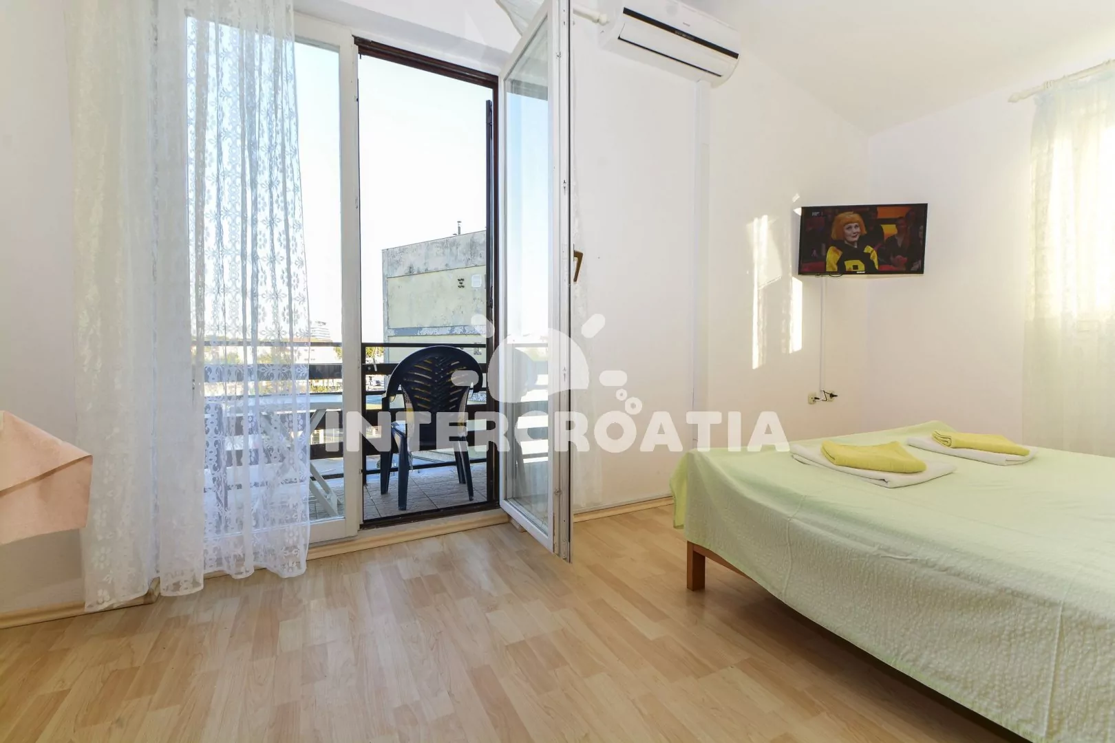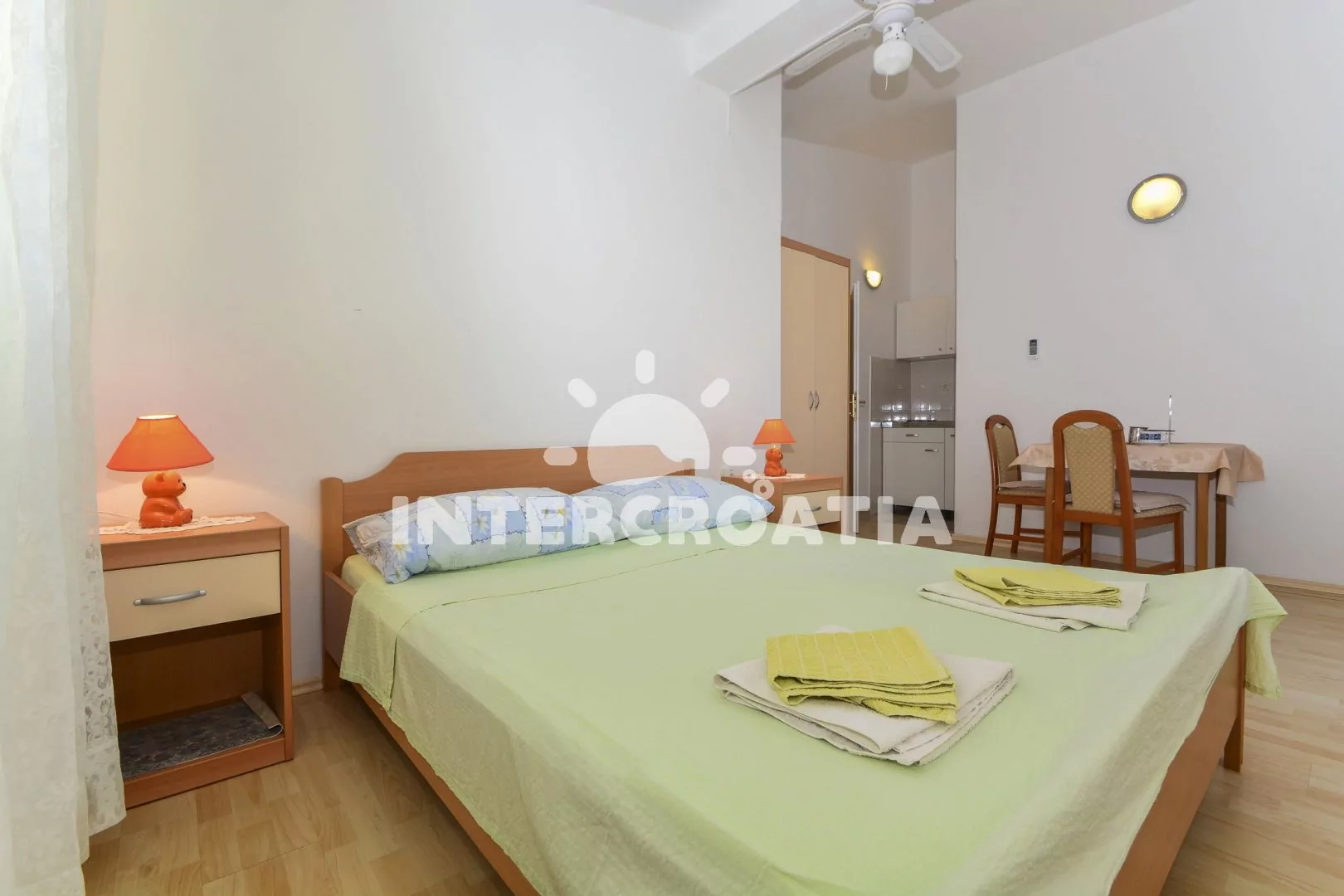 Apartmán (20 m2) typu studio s balkonem, posezením a výhledem na moře se nachází ve 2. patře domu. Obývací místnost je spojena s kuchyní. Kuchyňská linka je vybavena dvouplotýnkovým vařičem, nádobím a lednicí s mrazákem, (kávovar na požádání). Obývací místnost s jídelním stolem, televizí, dvoulůžkem, klimatizací a vstupem na balkon. Koupelna se sprchovým koutem, umyvadlem a wc. Hostům je k dispozici parkování u objektu zdarma.