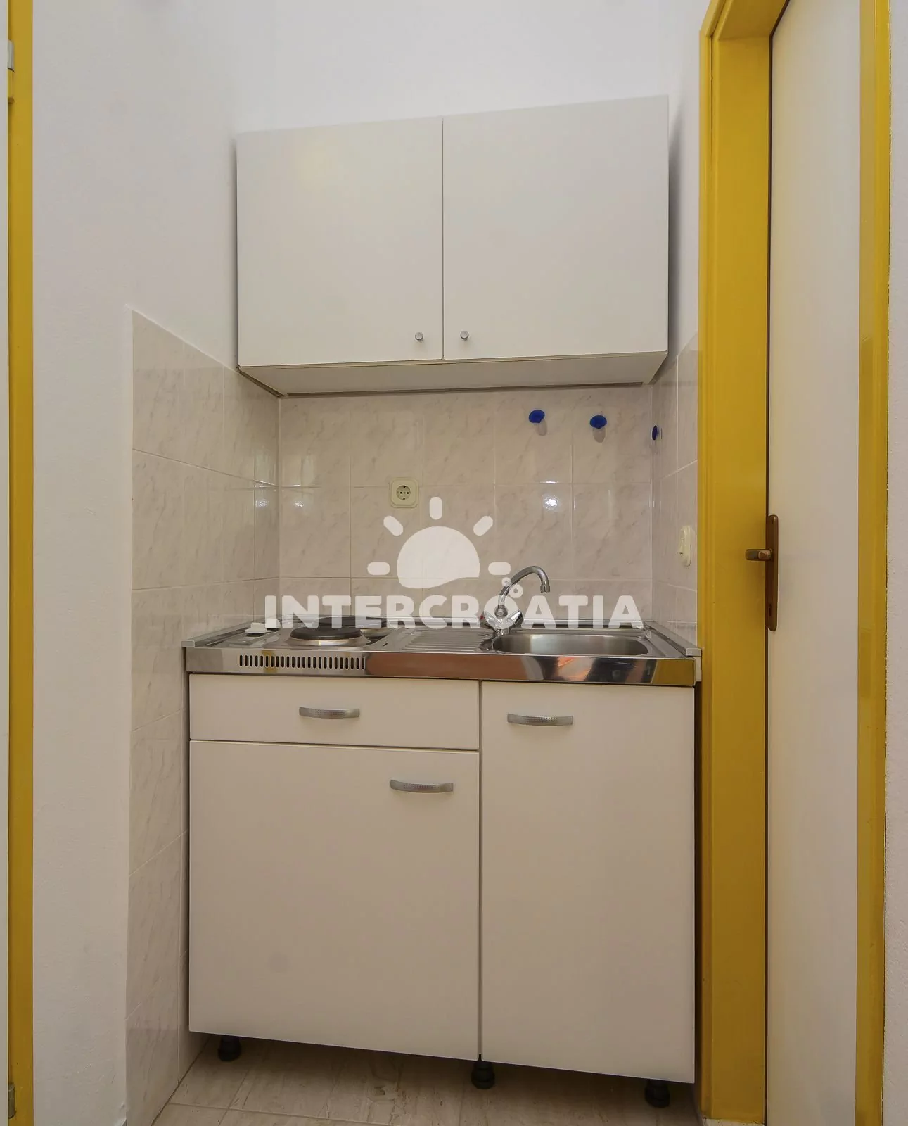 Apartmán (20 m2) typu studio s balkonem, posezením a výhledem na moře se nachází ve 2. patře domu. Obývací místnost je spojena s kuchyní. Kuchyňská linka je vybavena dvouplotýnkovým vařičem, nádobím…