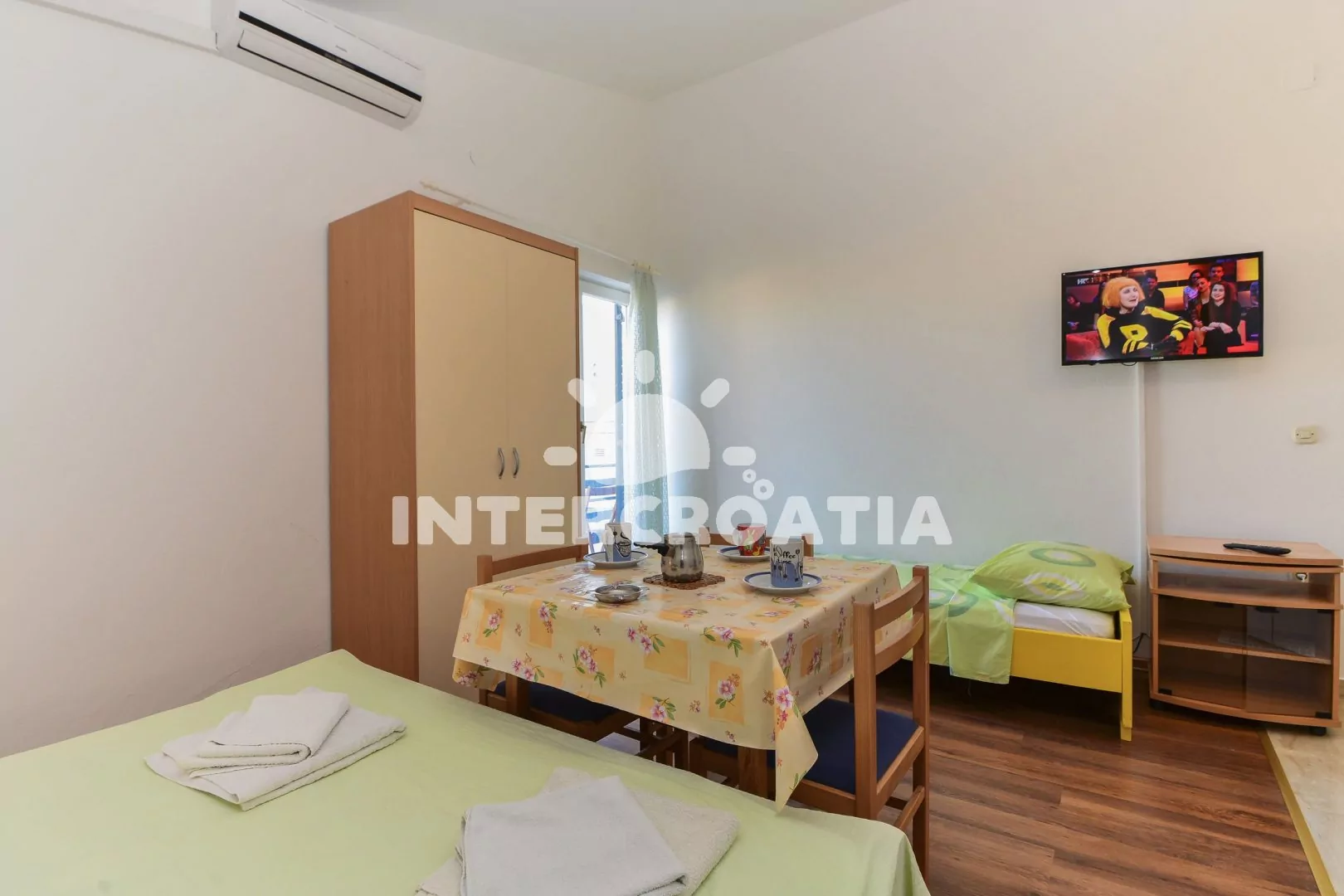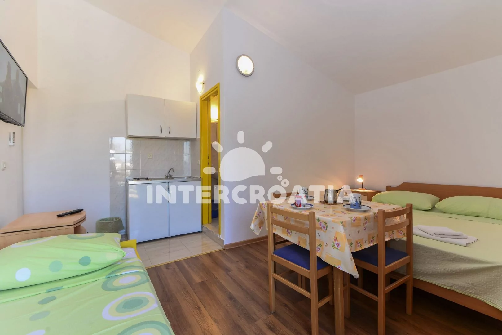 Apartmán (21 m2) typu studio s balkonem, posezením a částečným výhledem na moře se nachází ve 2. patře domu. Apartmán je vhodný pro 2 až 3 osoby. Obývací místnost je spojena s kuchyní. Kuchyňská linka je vybavena dvouplotýnkovým vařičem, nádobím a lednicí s mrazákem, (kávovar na požádání). Obývací místnost s jídelním stolem, televizí, dvoulůžkem, jednolůžkem, klimatizací a vstupem na balkon. Koupelna se sprchovým koutem, umyvadlem a wc. Hostům je k dispozici parkování u objektu zdarma.