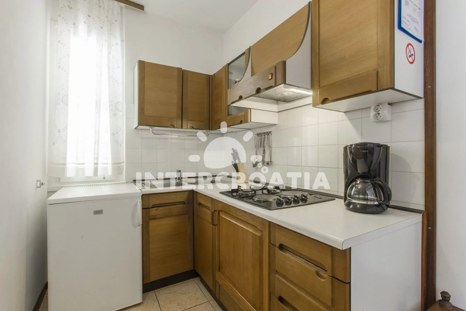 Vzdálenosti: Moře 150 m, oblázková pláž 300 m, centrum 150 m, supermarket do 100 m, půjčovna cyklistických kol 500 m, půjčovna motorových člunů 400 m, bar 200 m, restaurace do 200 m, směnárna 400 m, disko klub 400 m, pošta 500 m, přístav 500 m, ambulance 590 m, lékárna 600 m, veřejná doprava 600 m, banka 500 m, čerpací stanice 1 km, tenisové kurty 1,5 km, park Plitvice 23 km, letiště (Zadar) 60 km, trajekt 68 km.