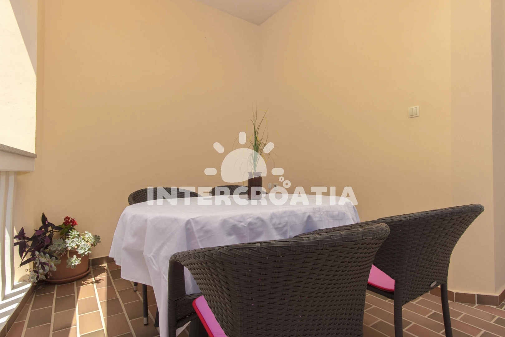 Apartmán (50 m2) s terasou a venkovním posezením se nachází ve 2. patře domu. Apartmán má 1 ložnici a je vhodný pro 2 až 4 osoby. Obývací pokoj je spojený s kuchyní. Kuchyňská linka je vybavena varnou deskou, digestoří, kávovarem, nádobím a lednicí s mrazákem. Obývací pokoj s jídelním stolem pro 4 osoby, pohovkou (rozložitelná na extra lůžko pro 2 osoby), televizí se satelitním programem, klimatizací a vstupem na terasu. Ložnice s jedním dvoulůžkem. Koupelna se sprchovým koutem, umyvadlem a wc. Hostům je k dispozici parkování přímo u ubytování zdarma.