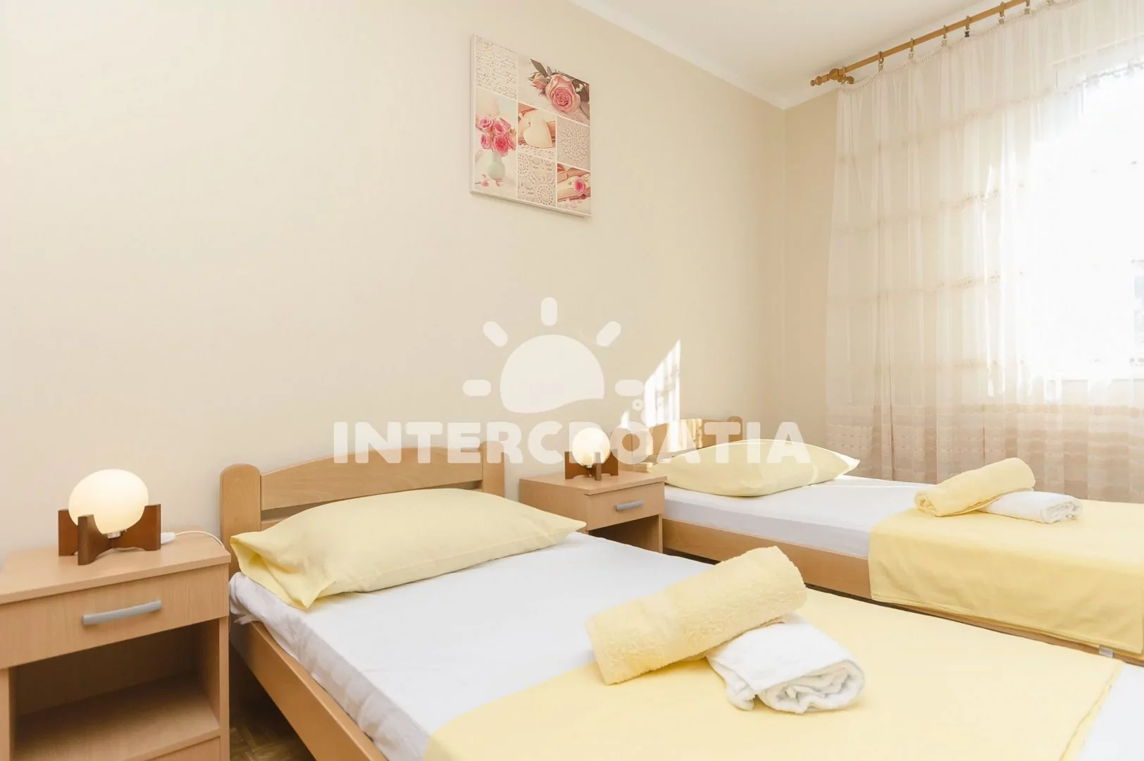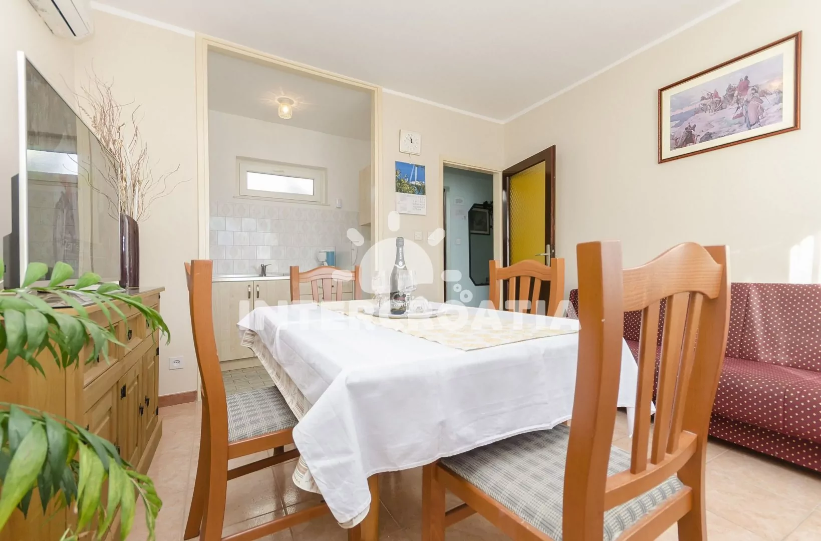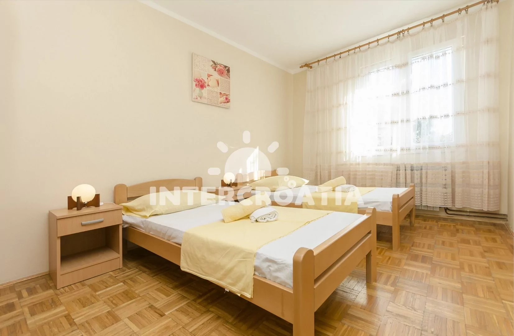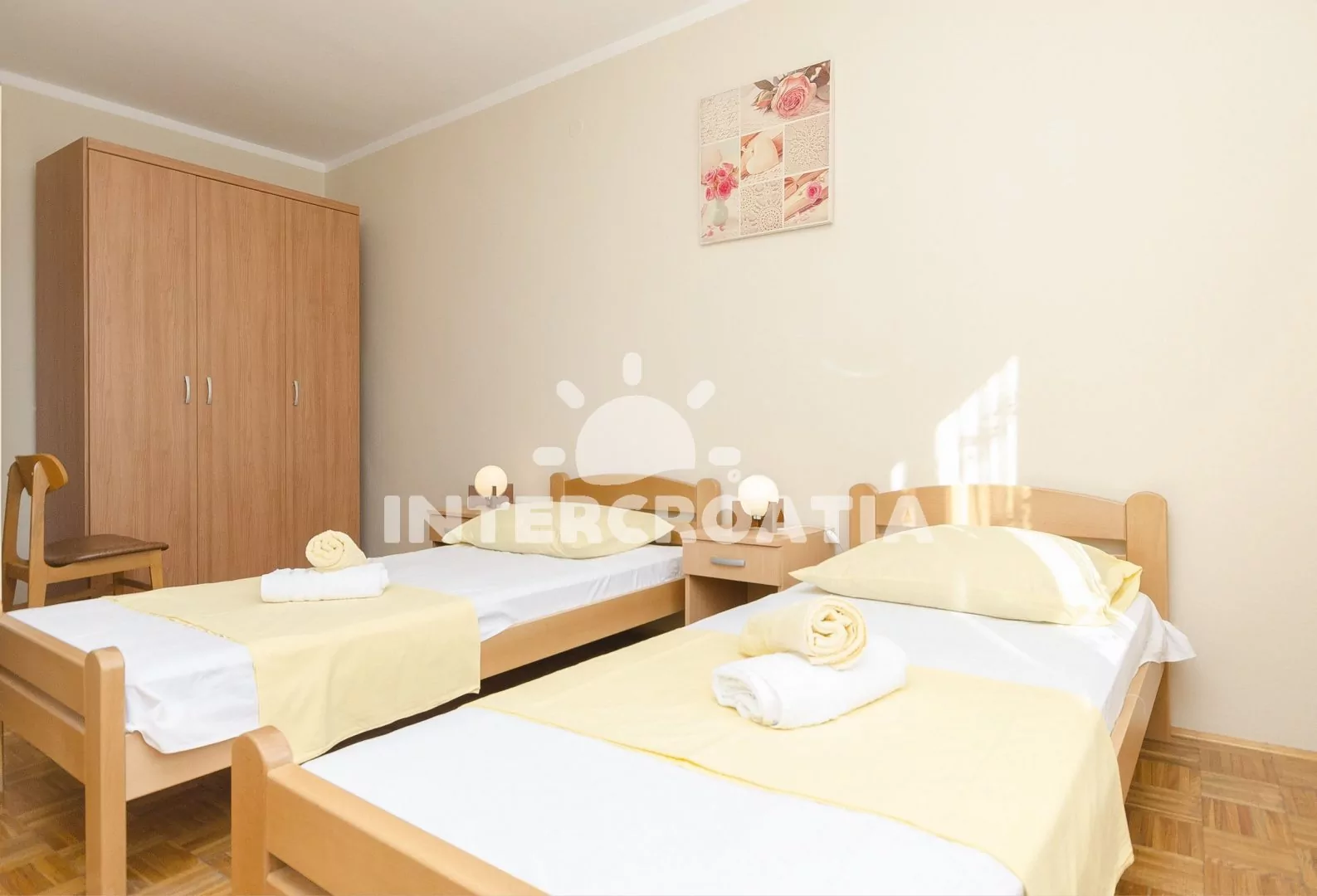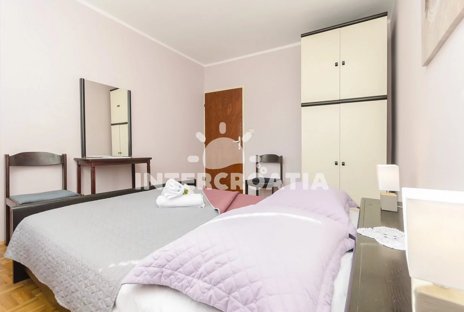Apartmán (50 m2) s terasou a venkovním posezením se nachází v 1. patře domu. Apartmán má 2 ložnice a je vhodný pro 4 až 5 osob. Obývací pokoj je spojený s kuchyní. Kuchyňská linka je vybavena sporákem s troubou, nádobím a lednicí s mrazákem. Obývací pokoj s jídelním stolem, pohovkou (rozložitelná na extra lůžko pro 1 osobu), televizí se satelitním programem, klimatizací a vstupem na terasu. První ložnice s dvoulůžkem. Druhá ložnice s dvěma jednolůžky. Koupelna se sprchovým koutem, umyvadlem a wc. Hostům je k dispozici parkování u objektu zdarma.