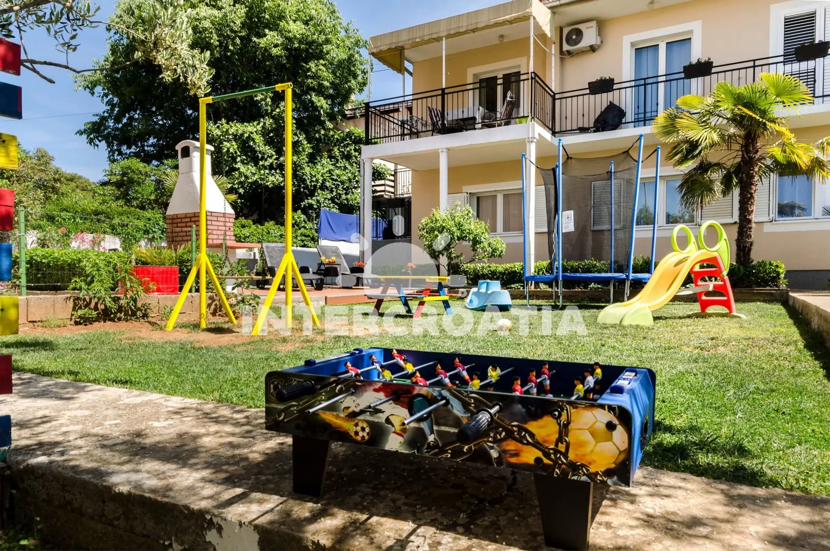 Für Kinder gibt es eine Schaukel, ein Trampolin, Bälle und sogar Roller.