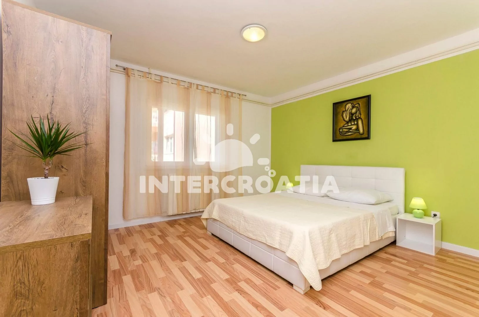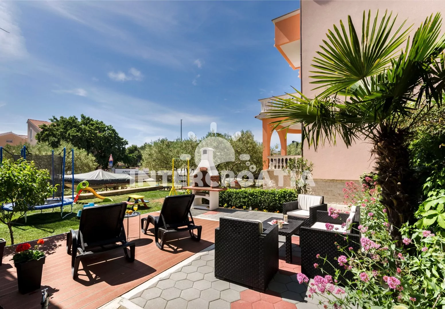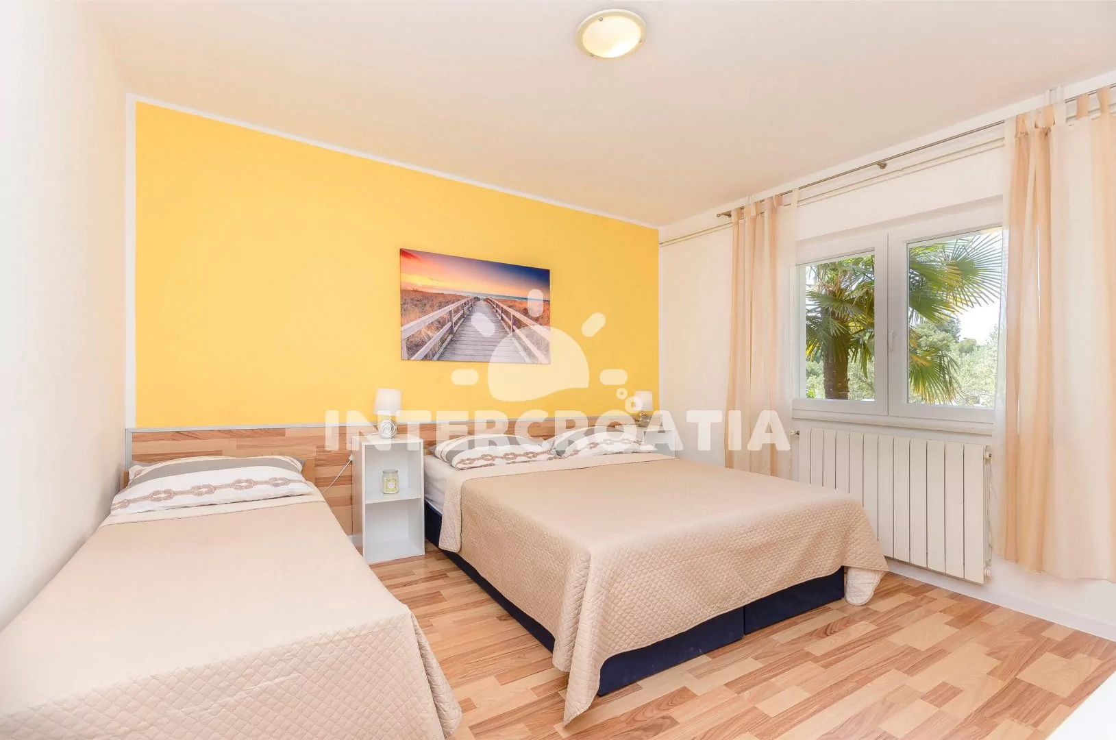 Apartmán (80 m2) s terasou a venkovním posezením se nachází v přízemí vily. Apartmán má 2 ložnice a je vhodný pro 4 až 5 osob. Obývací pokoj je spojený s kuchyní. Kuchyňská linka je vybavena varnou deskou, rychlovarnou konvicí, kávovarem, nádobím a lednicí s mrazákem. Obývací pokoj s jídelním stolem, pohovkou (rozložitelná na extra lůžko pro 1 osobu), televizí se satelitním programem, klimatizací a vstupem na terasu. První i druhá ložnice je vybavena vždy s jedním dvoulůžkem. Koupelna se sprchovým koutem, umyvadlem, pračkou a wc. Hostům je k dispozici sejf, žehlička a parkování u objektu zdarma.