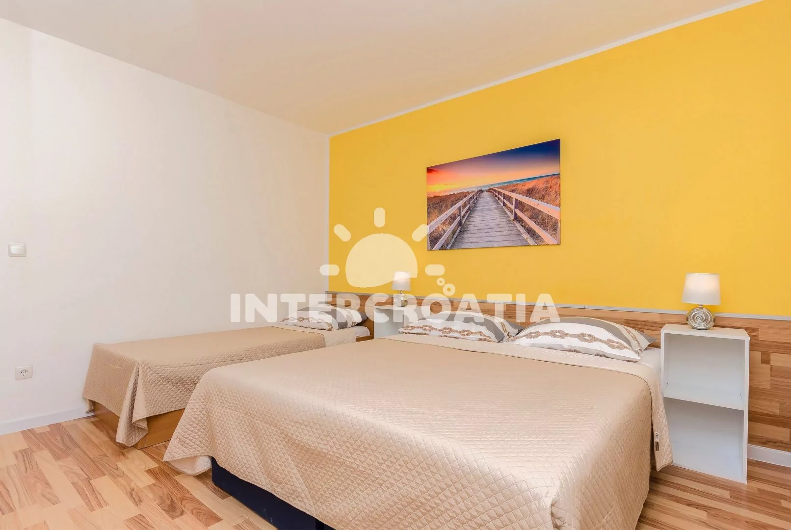 Vodice je známé letovisko, které návštěvníkům nabízí řadu atrakcí. Lidé se mohou těšit na chorvatskou kuchyni, krásné pláže, památky a přátelské obyvatele. Vodice navíc spojuje zábavu s klidným odpočinkem. Vaše ubytování je situované 270 m od moře a oblázkové pláže Imperial. Pláž má ideální podmínky k rodinné rekreaci u moře. Vstup do moře je snadný a pozvolný. Pobřeží lemují borovice, u kterých najdete příjemný chládek, takže můžete na pláži strávit celý den. V případě, že zatoužíte po větším ruchu, navštivte sousední oblázkovou pláž Hangar. Tu si oblíbí všichni příznivci sportovních aktivit. Na moři se dokonce nachází vodní atrakce. Nejoblíbenějšími aktivitami jsou potápění, jízda na kajaku, paddle board, vodní skútry a šlapadla. Na dohled od pláže je mnoho restaurací a kaváren. Spokojeni budou také fanoušci cyklistiky. Ti objeví nejbližší okolí letoviska a jeho přírodní krásy. Z historických památek stojí za vidění farní kostel sv. Kříže pocházejí z 18. století. Krásný gotický kostel sv. Kříže vás překvapí unikátními detaily. Nádherný panoramatický výhled na celé město dominuje vrcholu Okit. Na něm stojí kostel Panny Marie Karmelské. Ten byl postavený v 17. století. Nejenom milovníci jídla si užijí návštěvu vodického trhu. Jedinečná atmosféra, vůně čerstvých produktů a suvenýry, to vše patří k tržnici. Gastronomii a lidové zvyky vám přiblíží událost Vodické hry, Vodička fešta a slavnost Panny Marie Karmelské. Naším tipem na výlet je Národní park Krka, který je vzdálený jen půl hodiny od Vodice. Nadchne vás panenská příroda a Skradinské vodopády. Za prozkoumání stojí také město Skradin. Přírodní park Vranské jezero potěší rodiny, které tráví svůj čas aktivně. Park totiž nabízí různorodý program. Někdo si naplánuje projížďku na kolech, další dají přednost koupání, jiní zase dlouhé pěší túře. Spokojení budou také fanoušci rybaření. Nezapomenutelným výletem je také Národní park Plitvická jezera. Šibenik je metropole, která žije ve dne v noci. Můžete tam objevovat kulturní pamětihodnosti, galerie, nebo se zúčastnit společenských událostí.