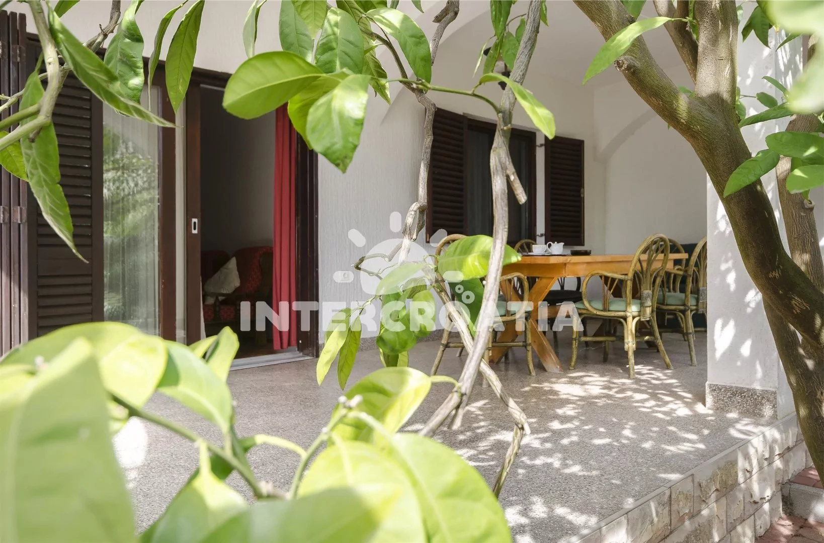 Apartmán (65 m2) s terasou a venkovním posezením se nachází v přízemí domu. Apartmán má 2 ložnice a je vhodný pro až 4 osoby. Obývací pokoj je spojený s kuchyní. Kuchyňská linka je vybavena sporákem s troubou, digestoří, rychlovarnou konvicí, mikrovlnnou troubou, kávovarem, nádobím a lednicí s mrazákem. Obývací pokoj s jídelním stolem, sedací soupravou s pohovkou, televizí se satelitním programem, klimatizací a vstupem na terasu. První ložnice s dvoulůžkem. Druhá ložnice se dvěma jednolůžky. Koupelna se sprchovým koutem, umyvadlem, fénem, pračkou a wc. Hostům je k dispozici parkování u objektu zdarma.