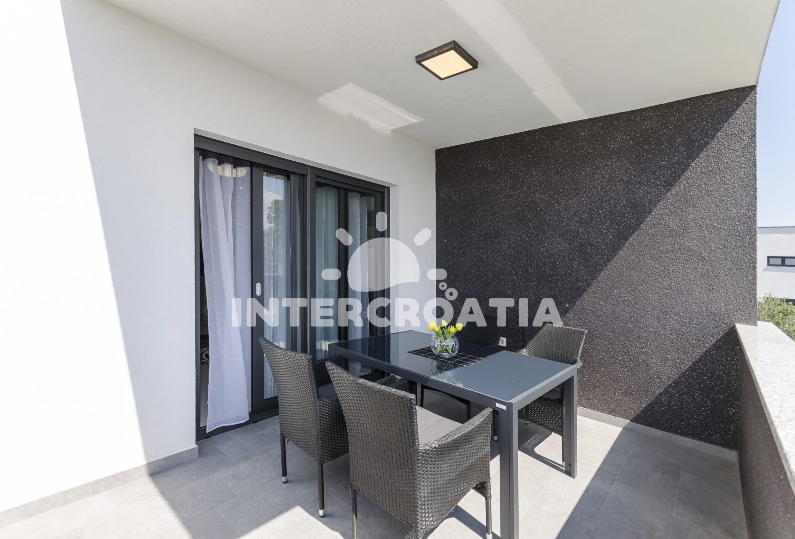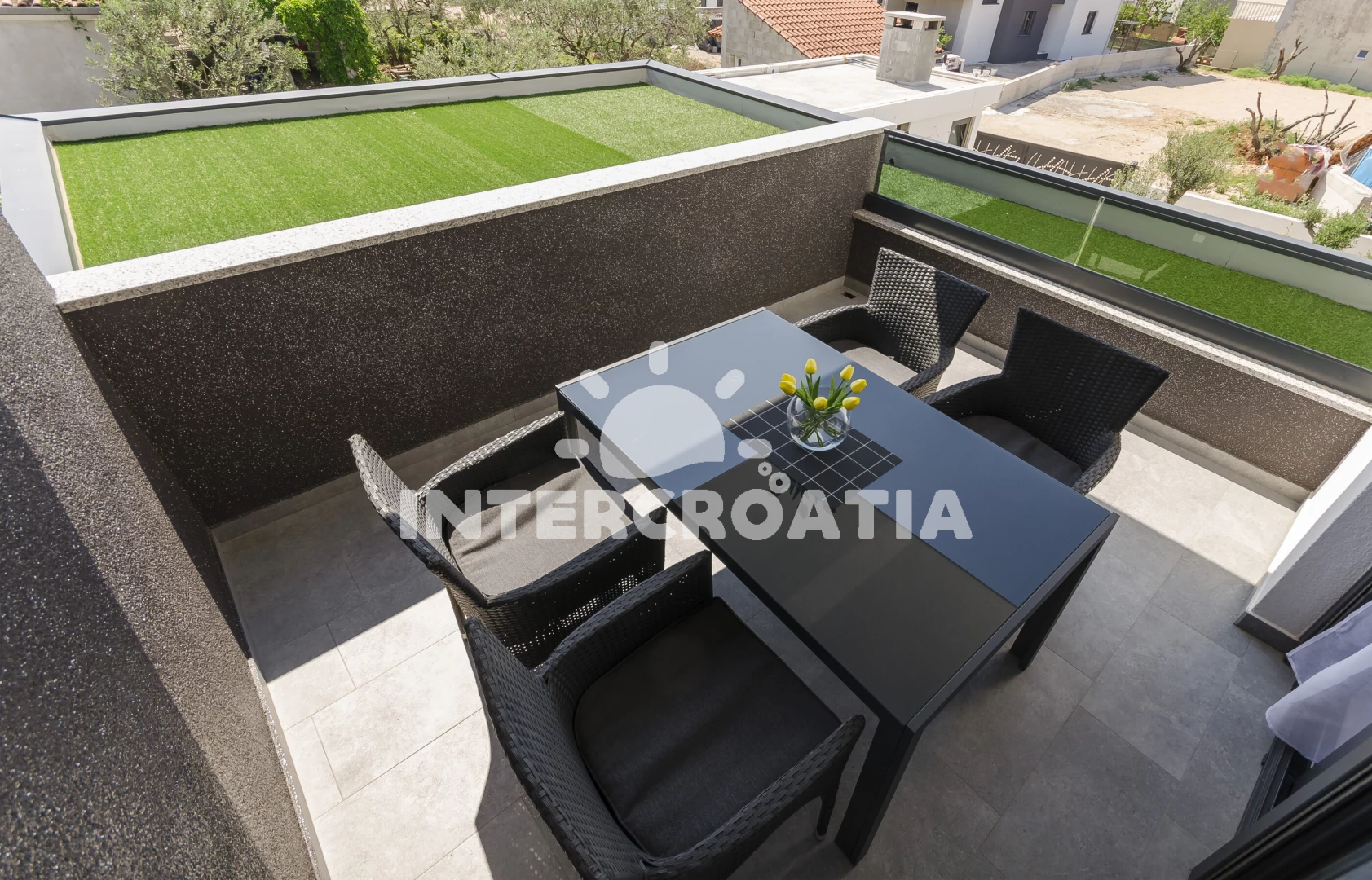 Apartmán (38 m2) s terasou a venkovním posezením se nachází v 1. patře vily. Apartmán má 1 ložnici a je vhodný pro 2 až 4 osoby. Obývací pokoj je spojený s kuchyní. Kuchyňská linka je vybavena sklokeramickou varnou deskou, digestoří, vestavěnou troubou, myčkou na nádobí, rychlovarnou konvicí, kávovarem, nádobím a lednicí s mrazákem. Obývací pokoj s jídelním stolem, pohovkou (rozložitelná na extra lůžko pro 2 osoby), televizí, klimatizací a vstupem na terasu. Ložnice s jedním dvoulůžkem. Koupelna se sprchovým koutem, umyvadlem, fénem, pračkou a wc. Hostům je k dispozici parkování u vily zdarma.