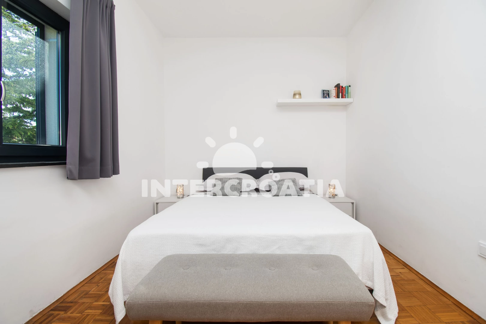 Apartmán (60 m2) s terasou a venkovním posezením se nachází v přízemí vily. Apartmán má 2 ložnice a je vhodný pro až 5 osob. Obývací pokoj je spojený s kuchyní. Kuchyňská linka je vybavena sklokeramickou varnou deskou, digestoří, vestavěnou troubou, kávovarem, nádobím a lednicí s mrazákem. Obývací pokoj s jídelním stolem, pohovkou (rozložitelná na extra lůžko pro 1 osobu), televizí, klimatizací a vstupem na terasu. První ložnice s dvoulůžkem. Druhá ložnice s dvoulůžkem. Koupelna s vanou, umyvadlem, pračkou a wc. Dále samostatné wc s umyvadlem. Hostům je k dispozici parkování u objektu zdarma.