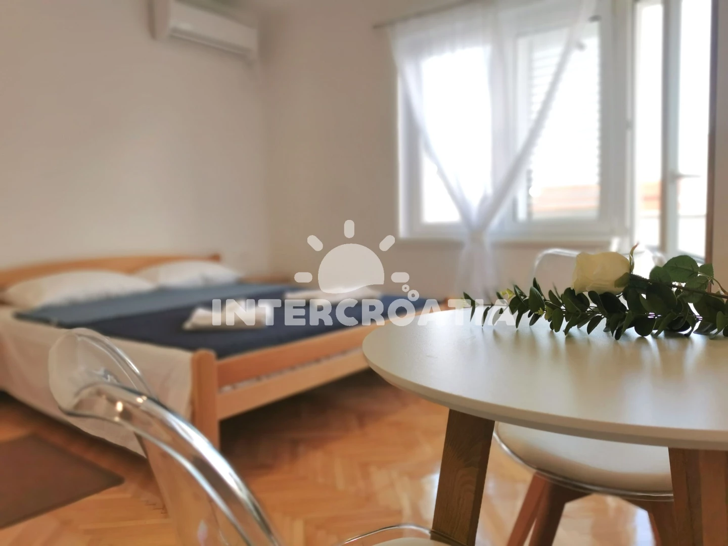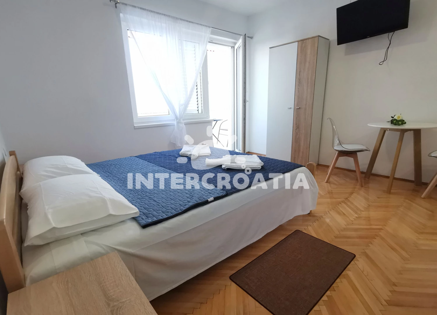 Apartmán (28 m2) typu studio s balkonem a venkovním posezením se nachází v 1. patře domu. Obývací místnost je spojena s kuchyní. Kuchyňská linka je vybavena varnou deskou, digestoří, myčkou na nádobí, rychlovarnou konvicí, mikrovlnnou troubou, nádobím a lednicí s mrazákem. Obývací místnost s jídelním stolem, televizí, dvoulůžkem, klimatizací a vstupem na balkon. Koupelna se sprchovým koutem, umyvadlem a wc. Hostům je k dispozici parkování u objektu zdarma.