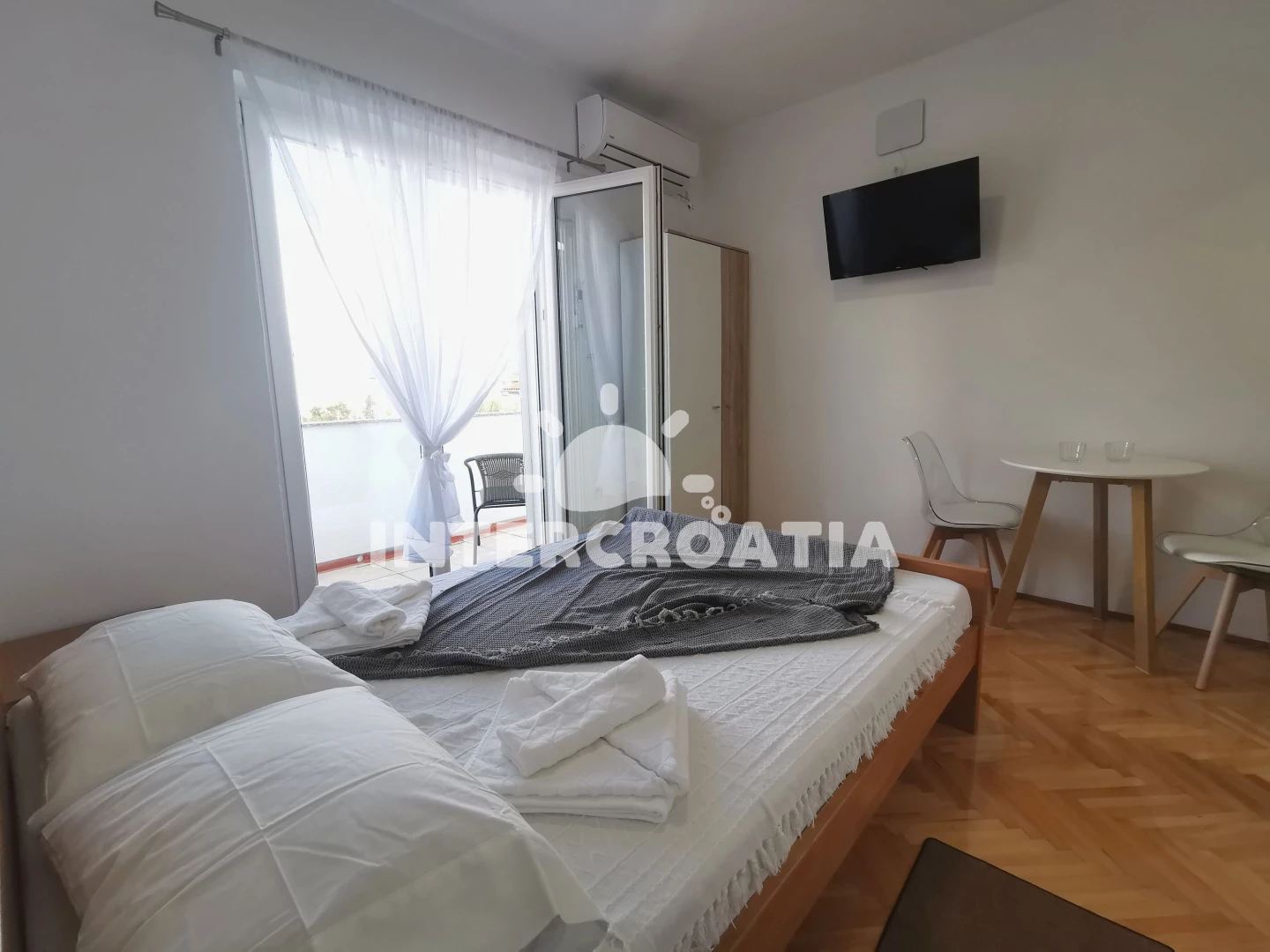 Apartmán (28 m2) typu studio s balkonem a venkovním posezením se nachází v 1. patře domu. Obývací místnost je spojena s kuchyní. Kuchyňská linka je vybavena varnou deskou, digestoří, myčkou na nádobí, rychlovarnou konvicí, mikrovlnnou troubou, nádobím a lednicí s mrazákem. Obývací místnost s jídelním stolem, televizí, dvoulůžkem, klimatizací a vstupem na balkon. Koupelna se sprchovým koutem, umyvadlem a wc. Hostům je k dispozici parkování u objektu zdarma.