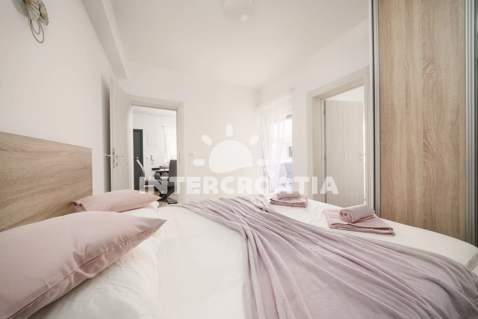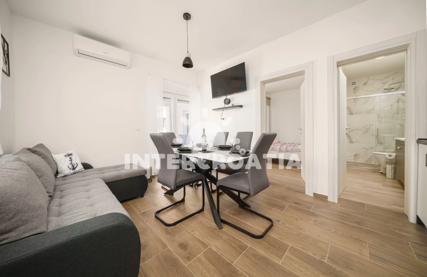 Apartmán (38 m2) s terasou a venkovním posezením se nachází v 1. patře domu. Apartmán má 2 ložnice a je vhodný pro až 4 osoby. Obývací pokoj je spojený s kuchyní. Kuchyňská linka je vybavena varnou deskou, digestoří, myčkou na nádobí, mikrovlnnou troubou, rychlovarnou konvicí, nádobím a lednicí s mrazákem. Obývací pokoj s jídelním stolem, pohovkou, televizí se satelitním programem, klimatizací a vstupem na terasu. První ložnice s dvoulůžkem a vstupem na terasu. Druhá ložnice se dvěma jednolůžky a vstupem na terasu. Koupelna se sprchovým koutem, umyvadlem, fénem a wc. Hostům je k dispozici parkování u objektu zdarma.