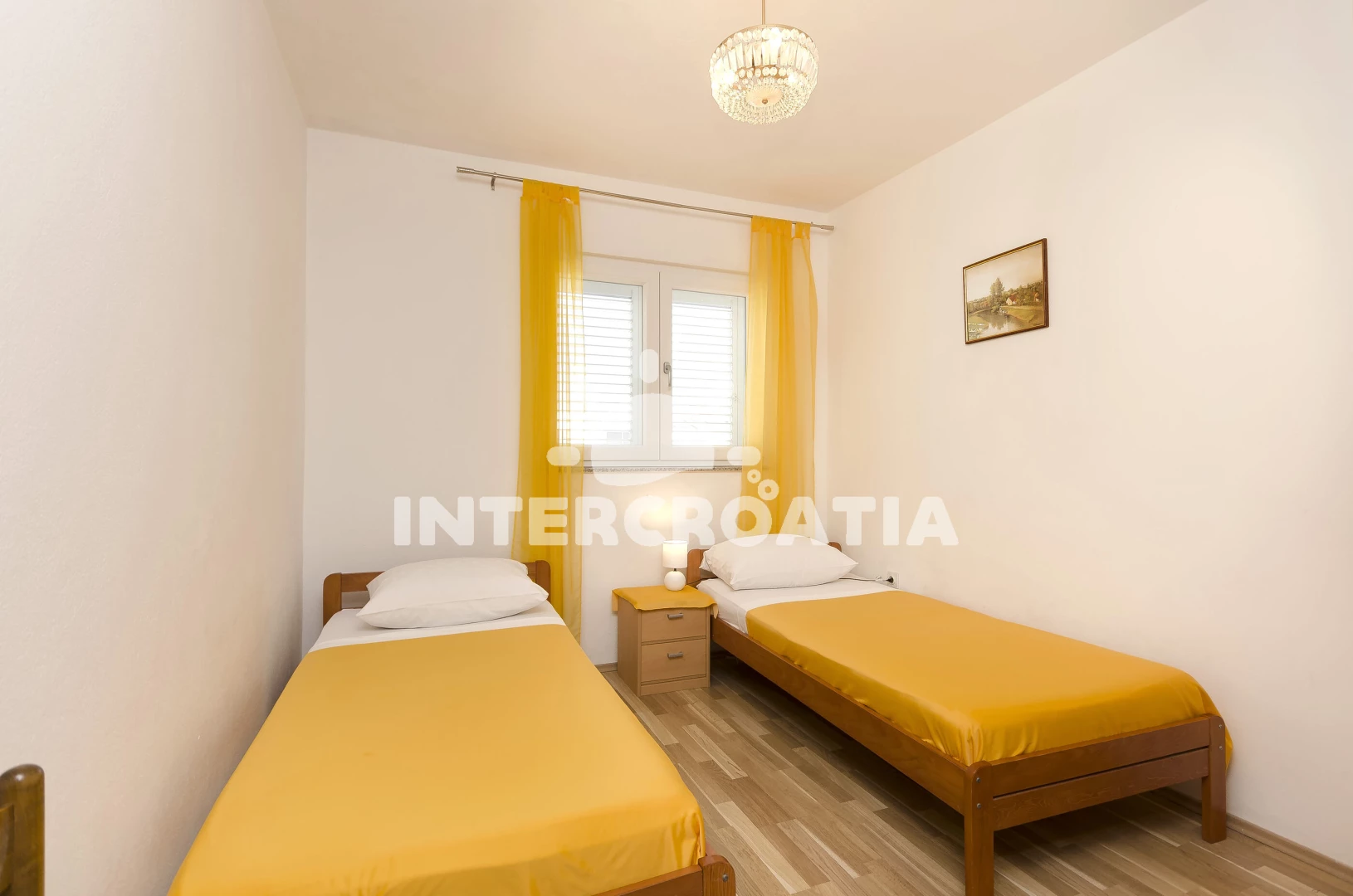 Apartmán (65 m2) s terasou a venkovním posezením se nachází v 1. patře domu. Apartmán má 3 ložnice a je vhodný pro až 6 osob. Obývací pokoj je spojený s kuchyní. Kuchyňská linka je vybavena sporákem s troubou, rychlovarnou konvicí, mikrovlnnou troubou, kávovarem, nádobím a lednicí s mrazákem. Obývací pokoj s jídelním stolem, televizí, klimatizací a vstupem na terasu. První ložnice s dvoulůžkem. Druhá ložnice se dvěma jednolůžky. Třetí ložnice se dvěma jednolůžky. Koupelna se sprchovým koutem, umyvadlem a wc. Hostům je k dispozici parkování u objektu zdarma.