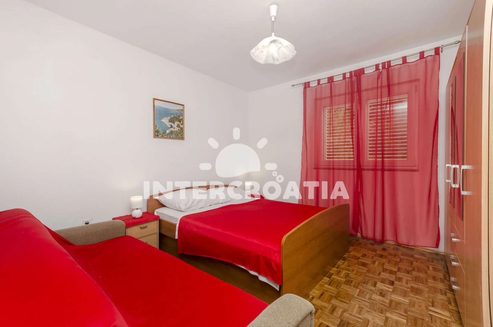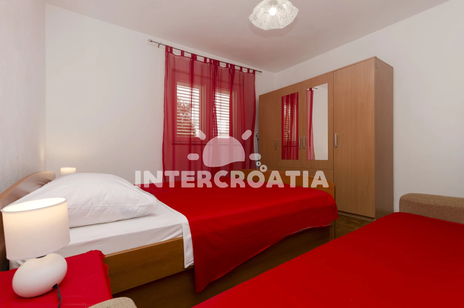 Apartmán (55 m2) s terasou a venkovním posezením se nachází v přízemí domu. Apartmán má 3 ložnice a je vhodný pro až 5 osob. Obývací pokoj je spojený s kuchyní. Kuchyňská linka je vybavena sporákem s troubou, digestoří, rychlovarnou konvicí, kávovarem, nádobím a lednicí s mrazákem. Obývací pokoj s jídelním stolem, televizí, klimatizací a vstupem na terasu. První ložnice s dvoulůžkem. Druhá ložnice se dvěma jednolůžky. Třetí ložnice s jedním jednolůžkem (přistýlka). Koupelna se sprchovým koutem, umyvadlem a wc. Hostům je k dispozici parkování u objektu zdarma.