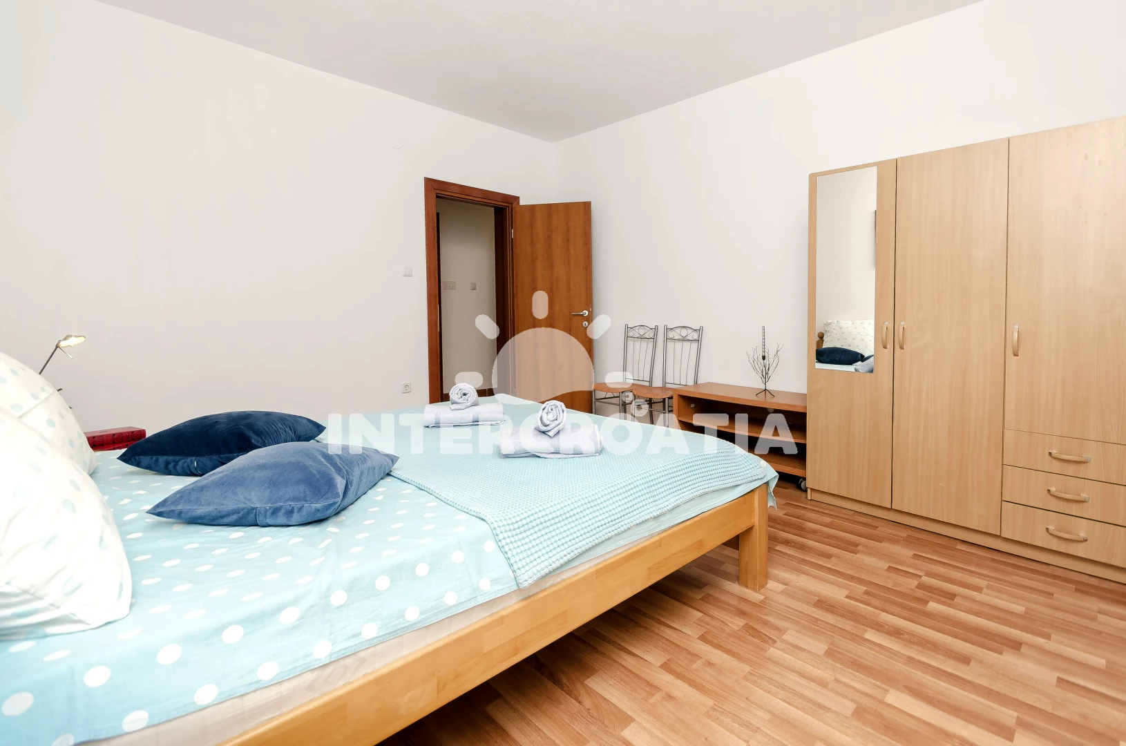 Apartmán (70 m2) s terasou a venkovním posezením se nachází v 1. patře domu. Apartmán má 2 ložnice a je vhodný pro až 4 osoby. Obývací pokoj je spojený s kuchyní. Kuchyňská linka je vybavena varnou deskou, mikrovlnnou troubou, rychlovarnou konvicí, kávovarem, toustovačem, nádobím a lednicí s mrazákem. Obývací pokoj s jídelním stolem, pohovkou, televizí, klimatizací a vstupem na terasu. První ložnice s dvoulůžkem. Druhá ložnice se dvěma jednolůžky. Koupelna s vanou, sprchovou zástěnou umyvadlem, fénem, pračkou a wc. K dispozici je žehlička a parkovací místa u objektu zdarma.