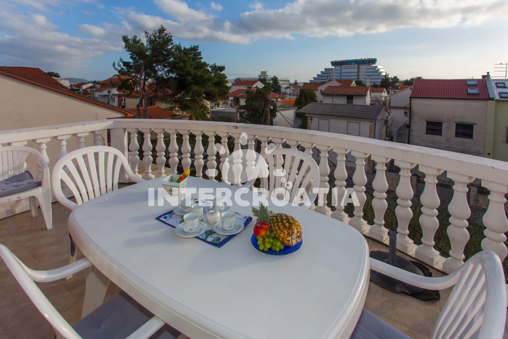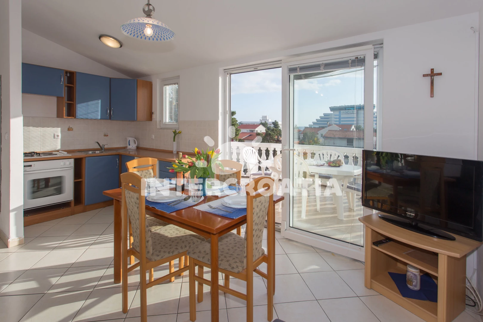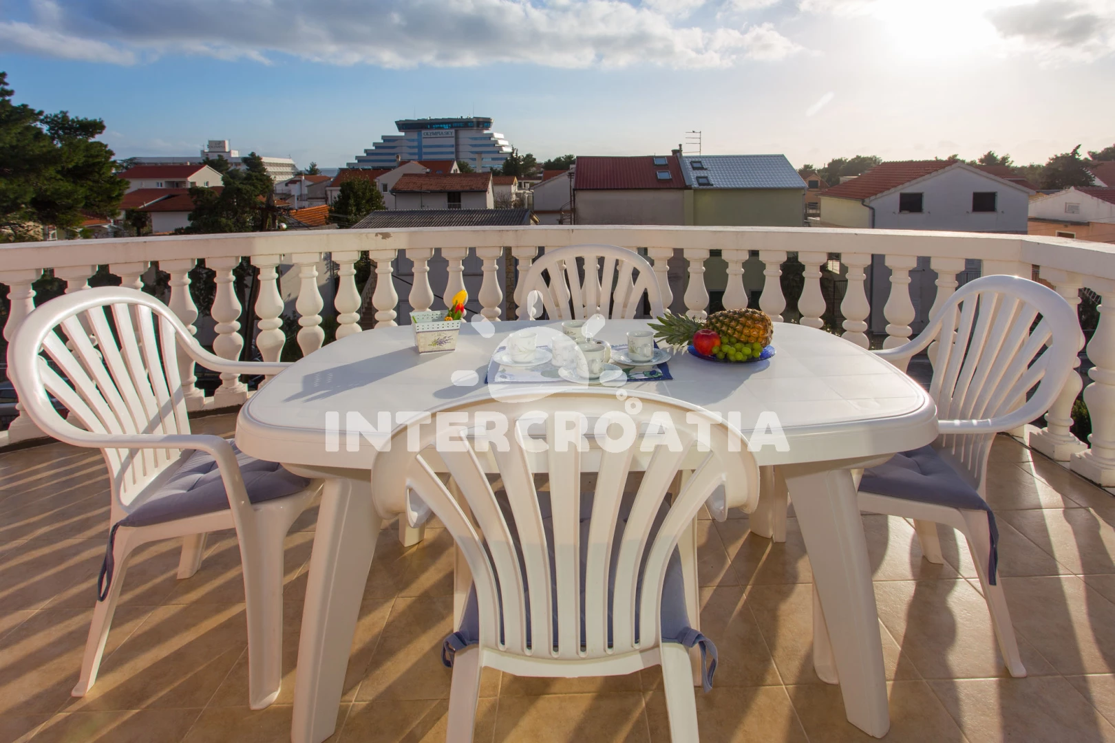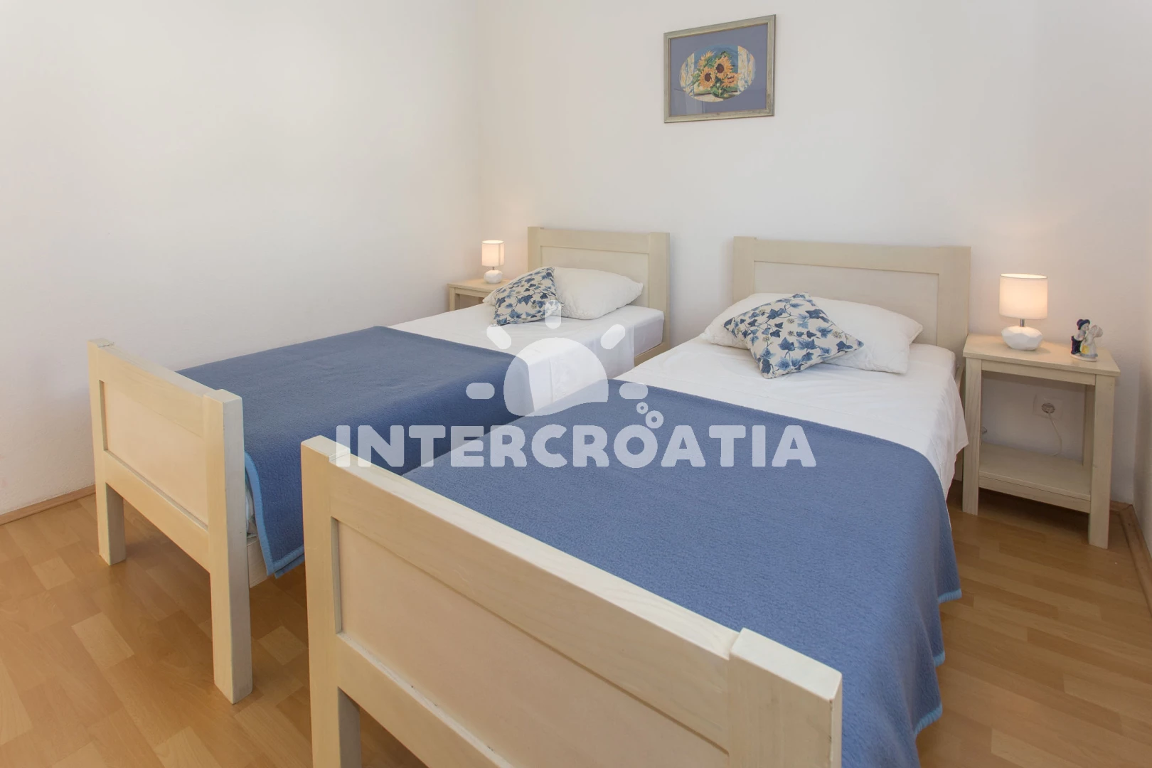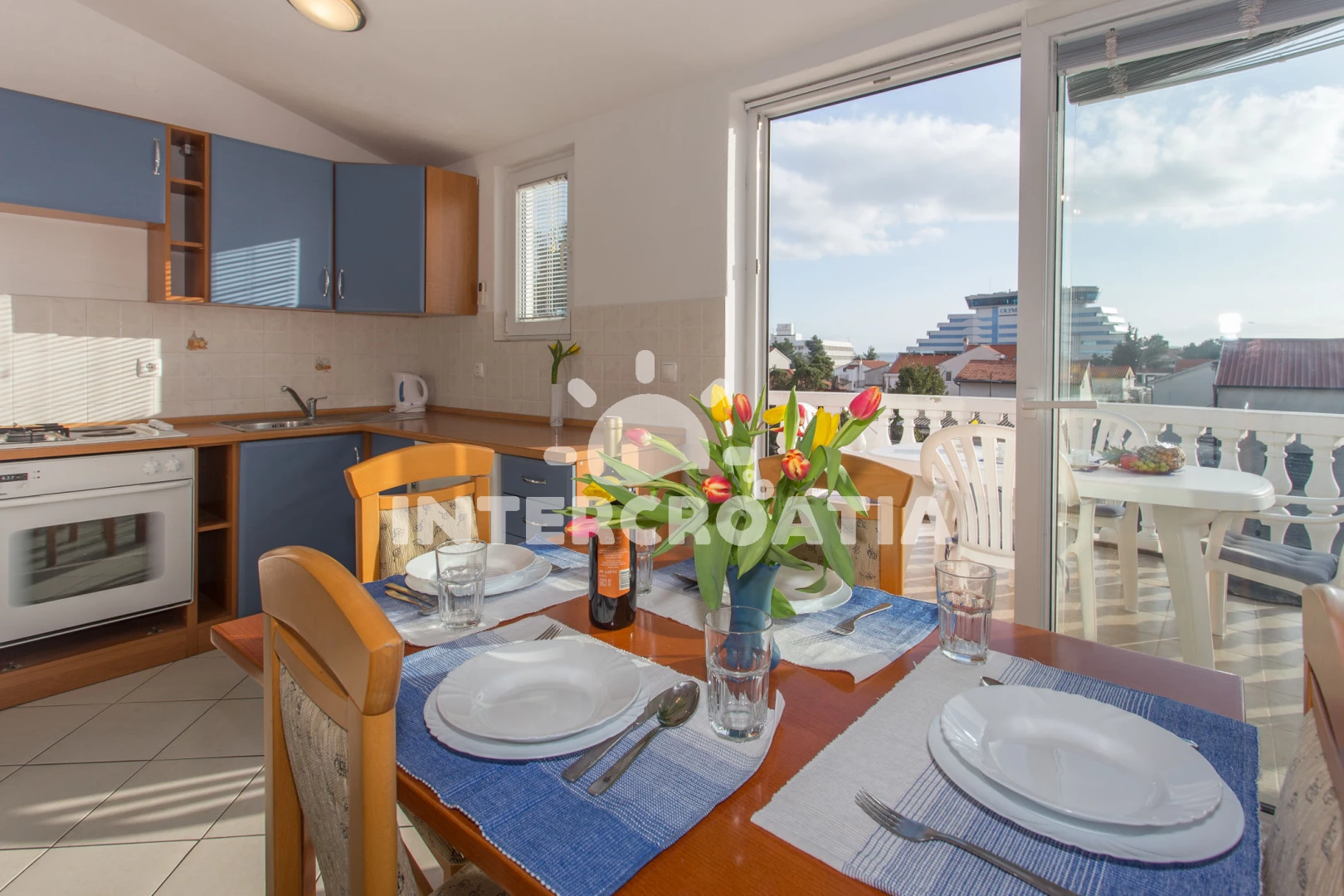 Vzdálenosti: Moře 300 m, pláž 300 m (skalnatá, oblázková a betonové desky), čerpací stanice 100 m, restaurace 100 m, bar 200 m, tenisové kurty 200 m, supermarket 200 m, lékárna 300 m, veřejná doprava 300 m, ambulance 300 m, banka 400 m, pošta 400 m, směnárna 400 m, diskotéka 400 m, centrum 600 m, letiště (Zadar) 50 km, trajekt (Split) 80 km,