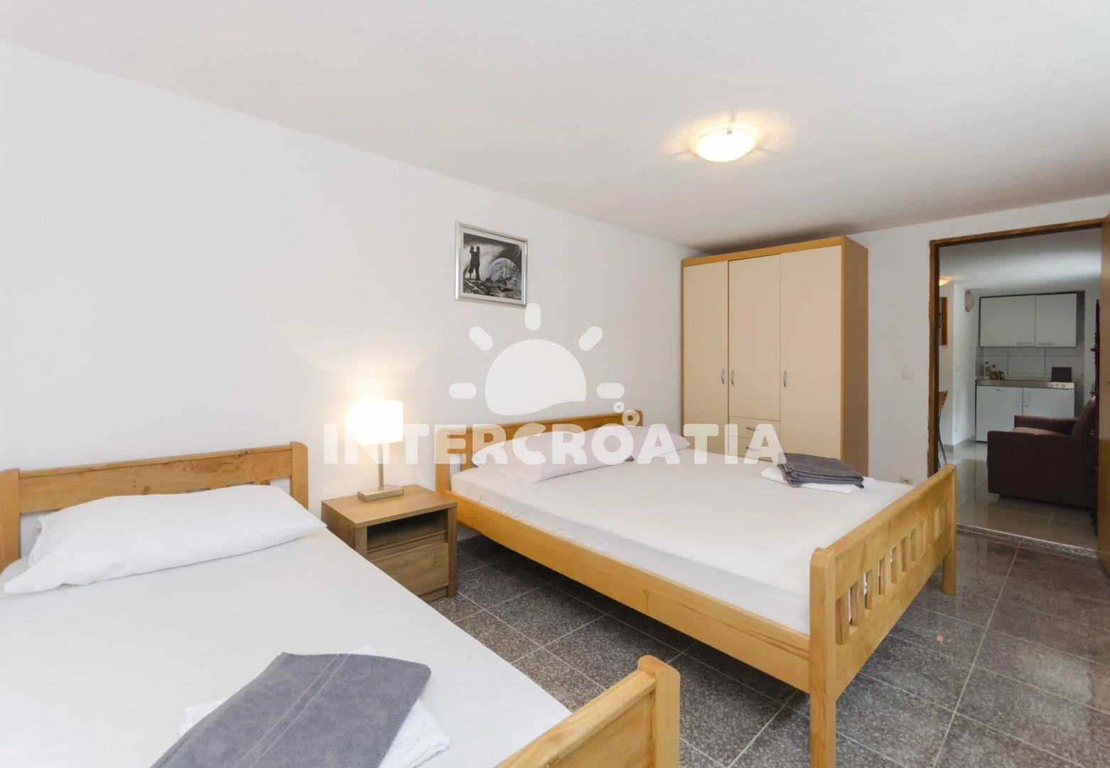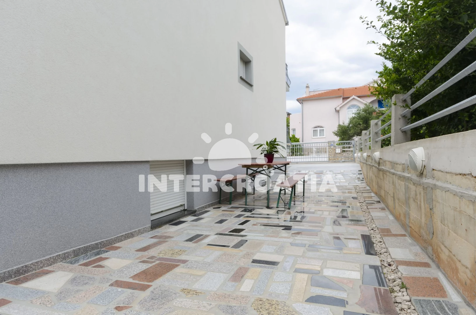 Vzdálenosti: Moře 730 m, pláž 900 m (oblázková a betonové desky), supermarket 200 m, restaurace 500 m, marina 750 m, bar 800 m, směnárna 850 m, lékárna 850 m, banka 850 m, centrum 950 m, trajekt (Šibenik) 15 km, park Plitvice 25 km, letiště (Zadar) 65 km,