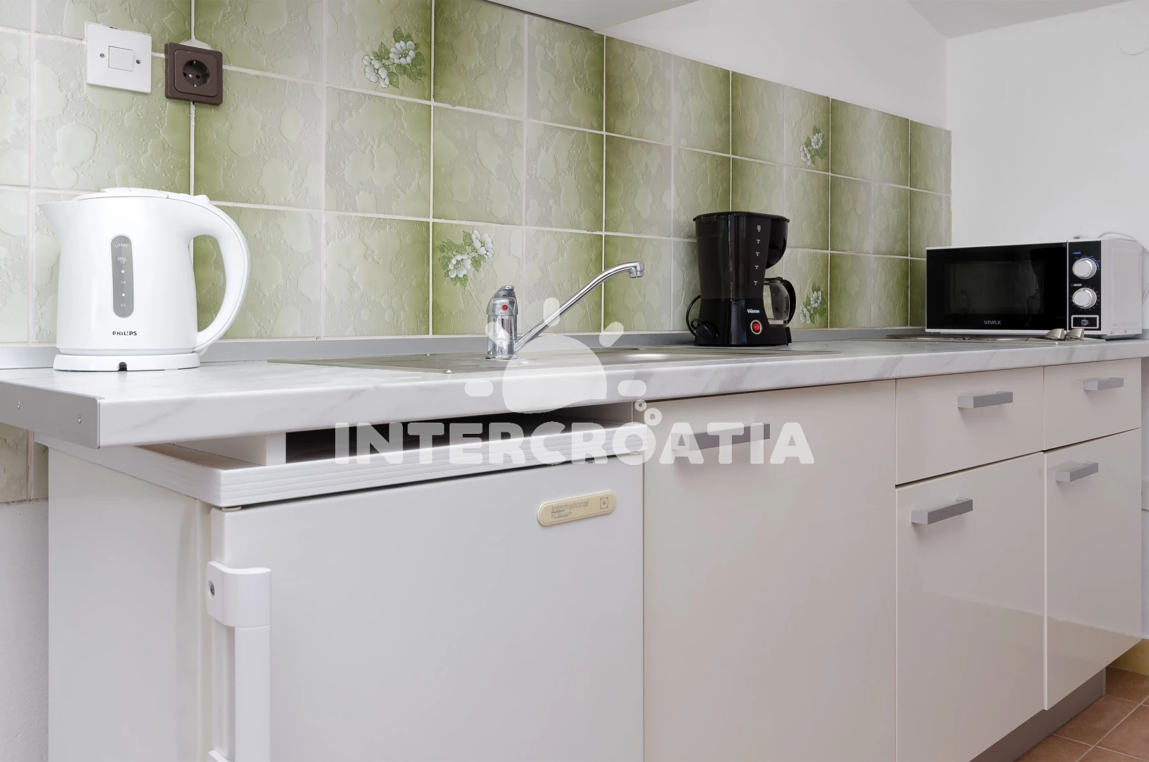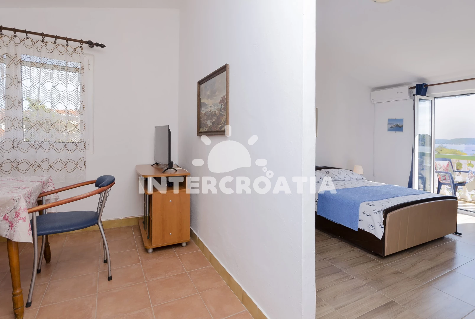 Apartmán (30 m2) typu studio s balkonem, a výhledem na moře. Nachází se ve 2. patře objektu. Kuchyňská linka je vybavena varnou deskou, kávovarem, mikrovlnnou troubou, rychlovarnou konvicí, nádobím, lednicí. K dispozici dvoulůžko, televize, žehlička. Koupelna se sprchovým koutem, umyvadlem, fénem a WC.