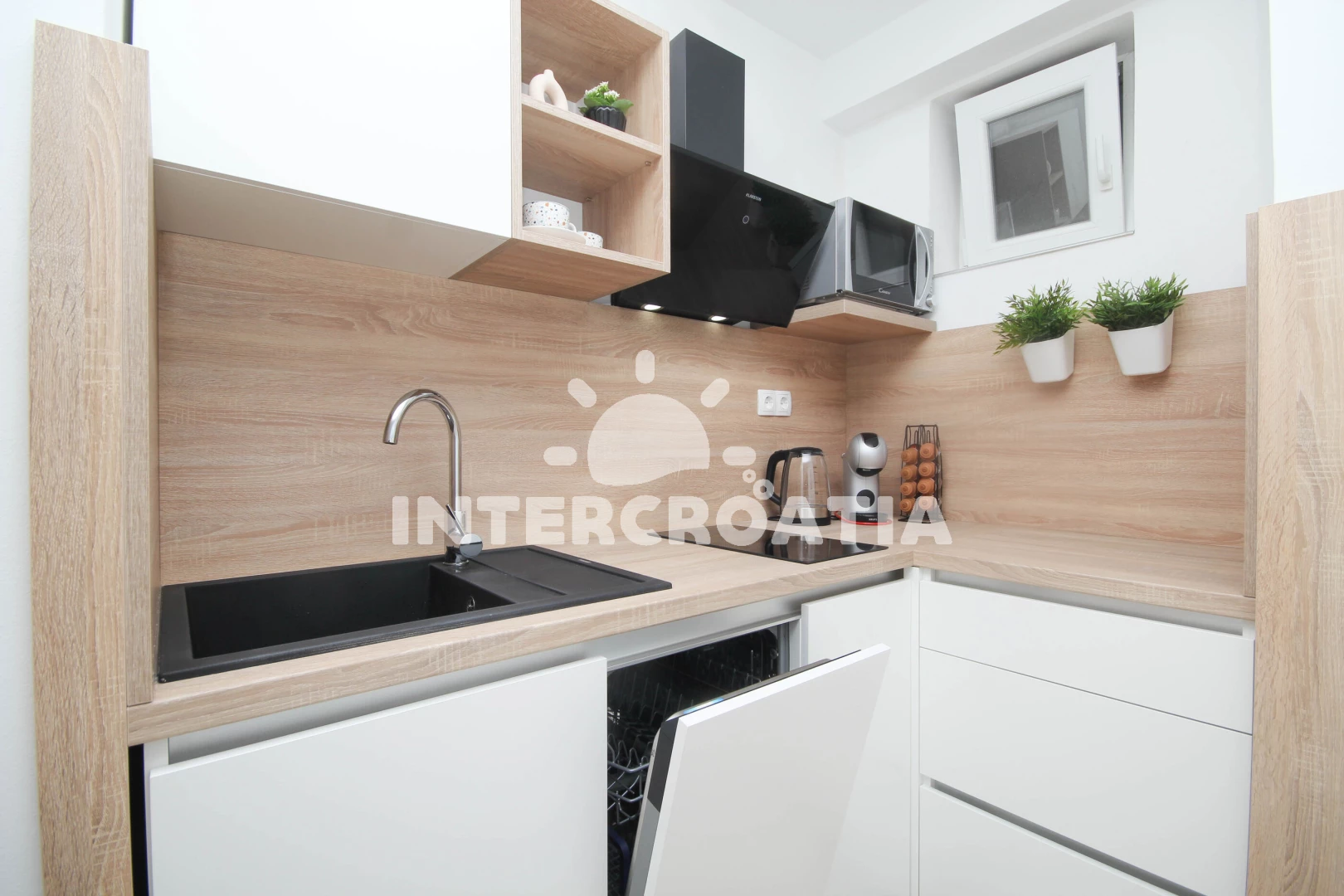 Vzdálenosti: Moře 350 m, pláž 400 m (oblázková a betonové desky), ambulance 150 m, supermarket 150 m, centrum 150 m, lékárna 150 m, banka 150 m, směnárna 200 m, restaurace 200 m, bar 200 m, marina 200 m, pošta 250 m, kotviště pro čluny 300 m, čerpací stanice 350 m, letiště (Zadar) 65 km,
