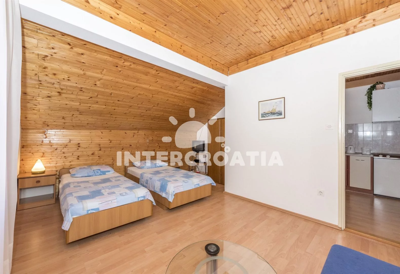 Třípokojový apartmán (44 m2) se dvěma ložnicemi a balkonem, nacházející se v 2. patře domu. Vstup, obývací místnost spojená s kuchyní. Kuchyňská linka s dvouplotýnkovým elektrickým vařičem, lednicí s mrazákem, kávovarem a nádobím. V obývací místnosti jídelní stůl pro 4 osoby. První ložnice s dvoulůžkem. Druhá ložnice s dvěma jednolůžky, televizí se satelitem a pohovkou (rozložitelná na extra lůžko pro 1 osobu). Koupelna se sprchovým koutem, umyvadlem a wc. Hosté mají k dispozici balkon s posezením a na zahradě krytou terasu. Parkování u objektu.