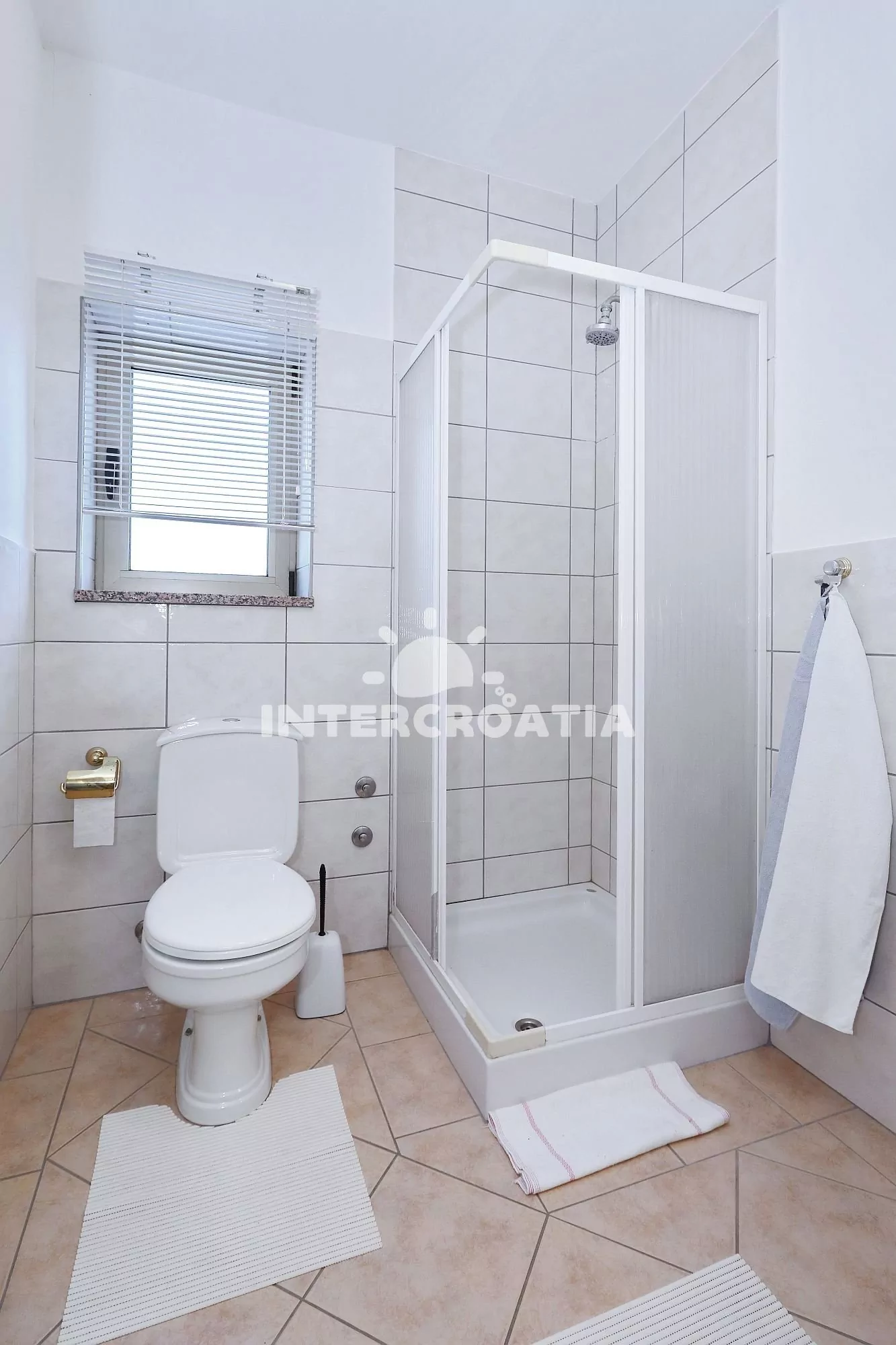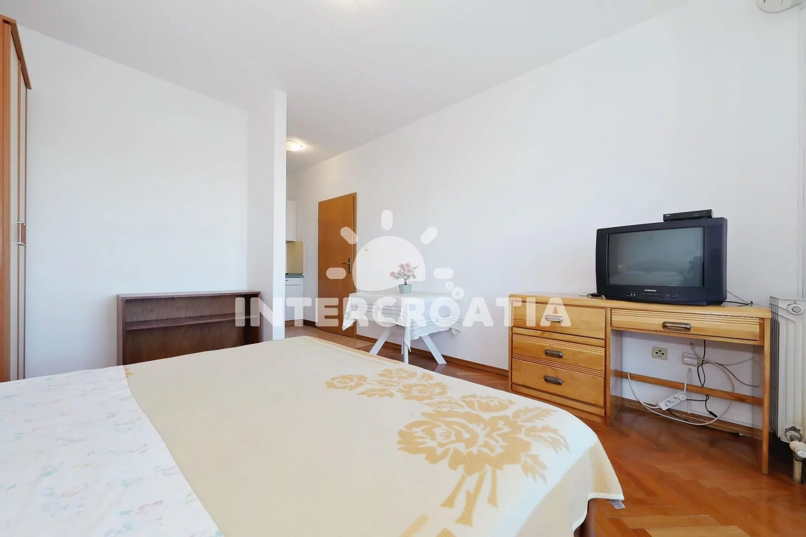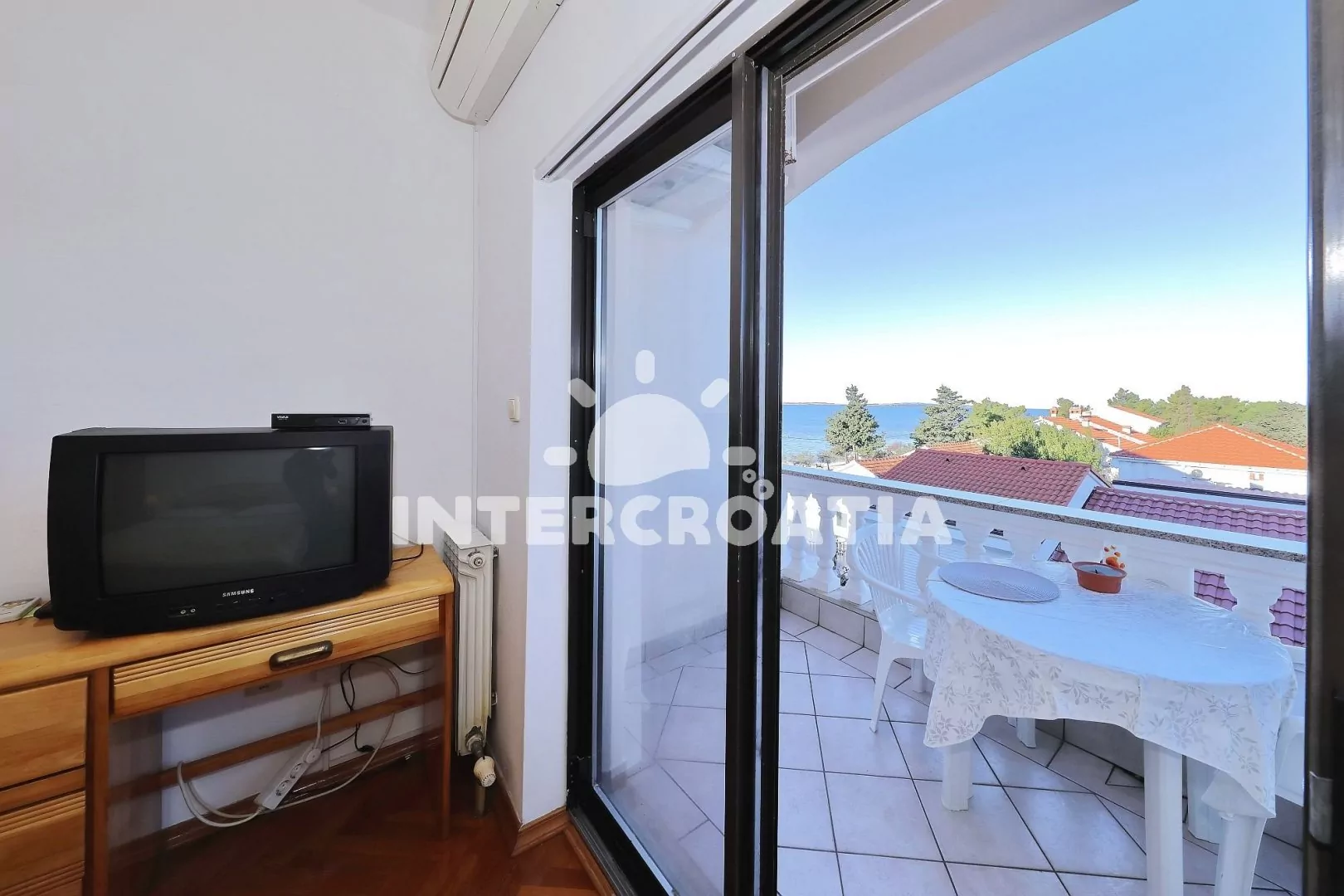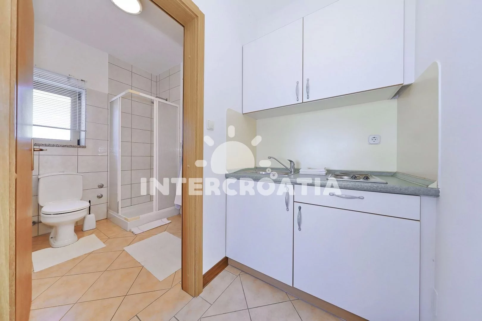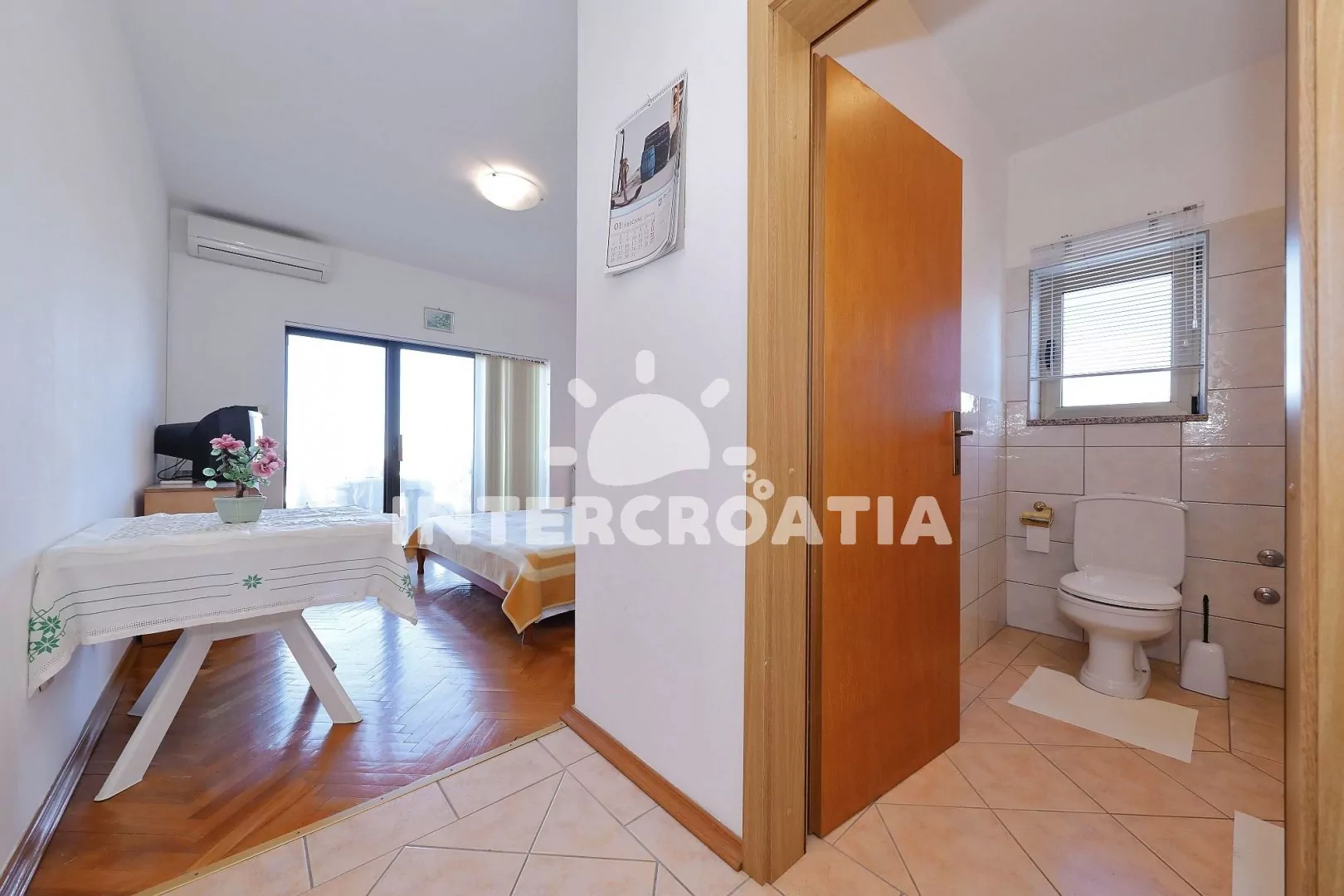 Apartmán typu studio s výhledem na moře se nachází v druhém patře vily a je vhodný pro 2 až 3 osoby. Obývací pokoj je spojený s kuchyní. Kuchyňská linka s dvouplotýnkovým sporákem, nádobím a lednicí s mrazákem. Obývací pokoj s jídelním stolem, televizí, jedním dvoulůžkem, přistýlkou, klimatizací a vstupem na balkon. Koupelna se sprchovým koutem, umyvadlem a wc. Hostům je k dispozici parkování u objektu zdarma.