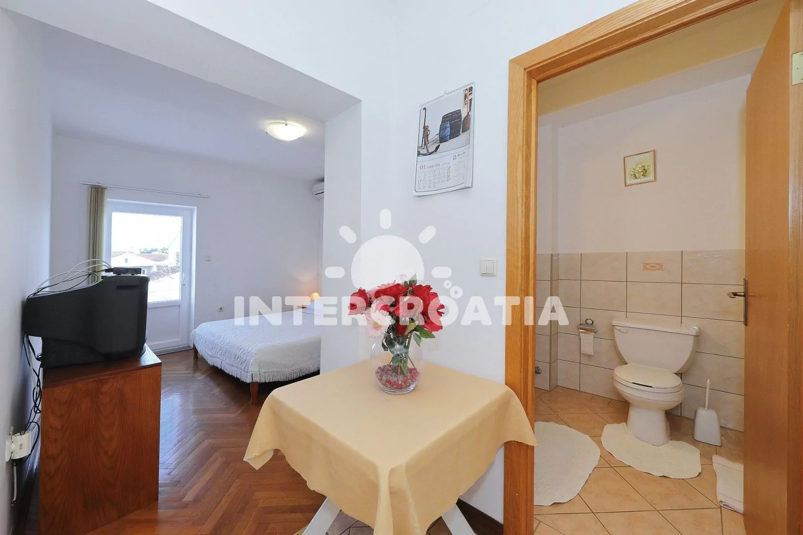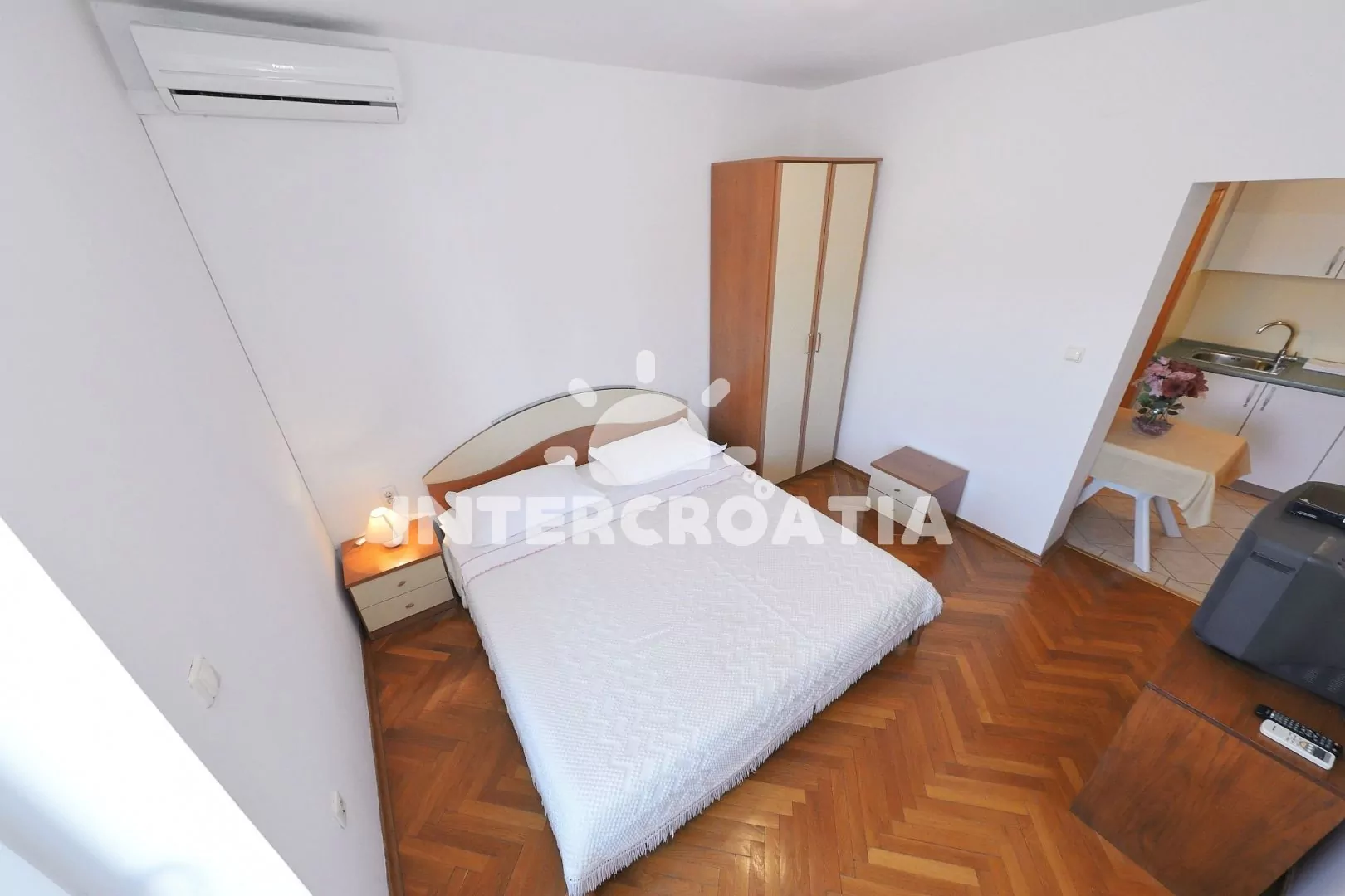 Apartmán typu studio s terasou a bočním výhledem na moře se nachází v druhém patře vily a je vhodný pro 2 až 3 osoby. Obývací pokoj je spojený s kuchyní. Kuchyňská linka s dvouplotýnkovým sporákem, nádobím a lednicí s mrazákem. Obývací pokoj s televizí, radiem, jedním dvoulůžkem, přistýlkou (extra lůžko pro 1 osobu), klimatizací a vstupem na terasu. Koupelna se sprchovým koutem, umyvadlem a wc. Hostům je k dispozici parkování objektu zdarma.