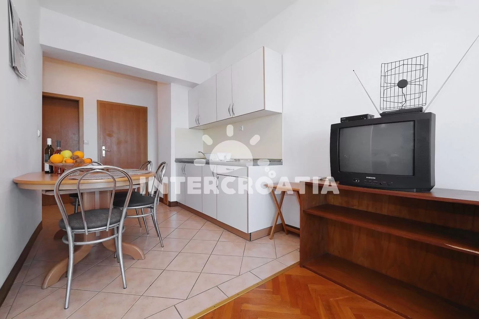 Apartmán pro 4 osoby s balkonem a výhledem na moře se nachází v druhém patře vily. Obývací pokoj je spojený s kuchyní. Kuchyňská linka s dvouplotýnkovým sporákem, nádobím a lednicí s mrazákem. Obývací pokoj s jídelním stolem pro 4 osoby, televizí, radiem, jedním dvoulůžkem, klimatizací a vstupem na balkon. Ložnice s jedním dvoulůžkem. Koupelna se sprchovým koutem, umyvadlem a wc. Hostům je k dispozici parkování objektu zdarma.